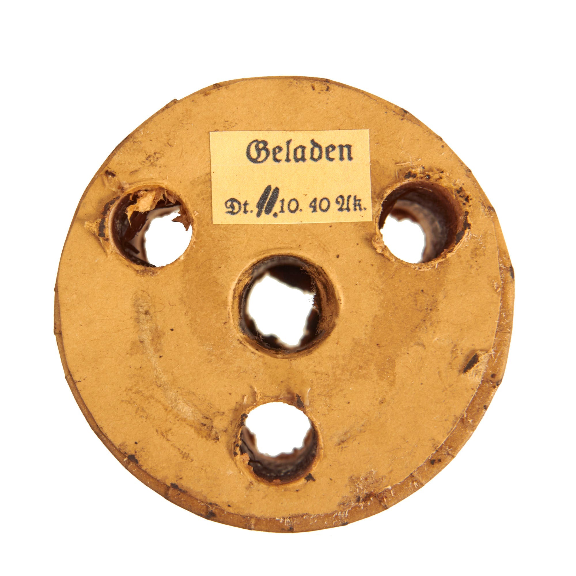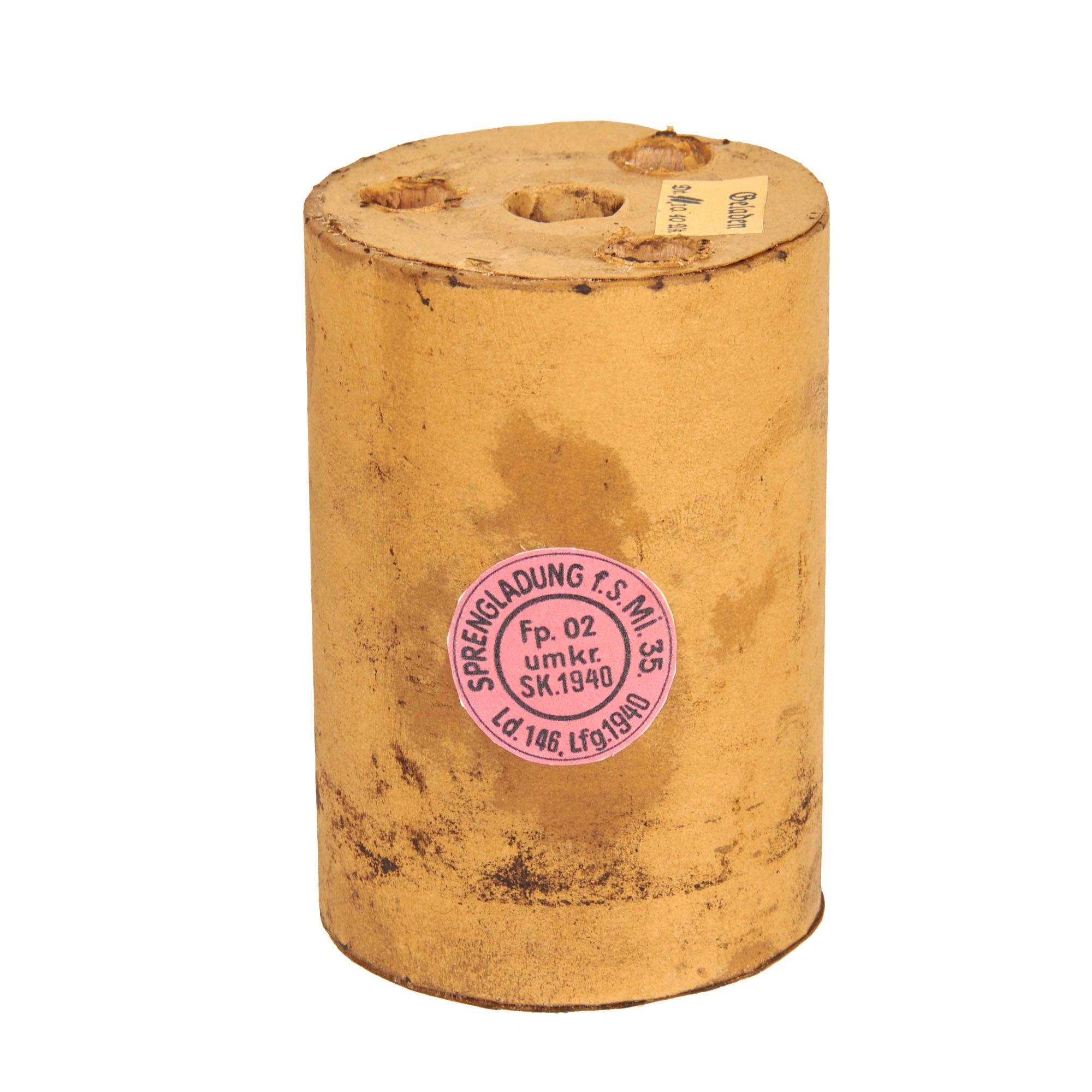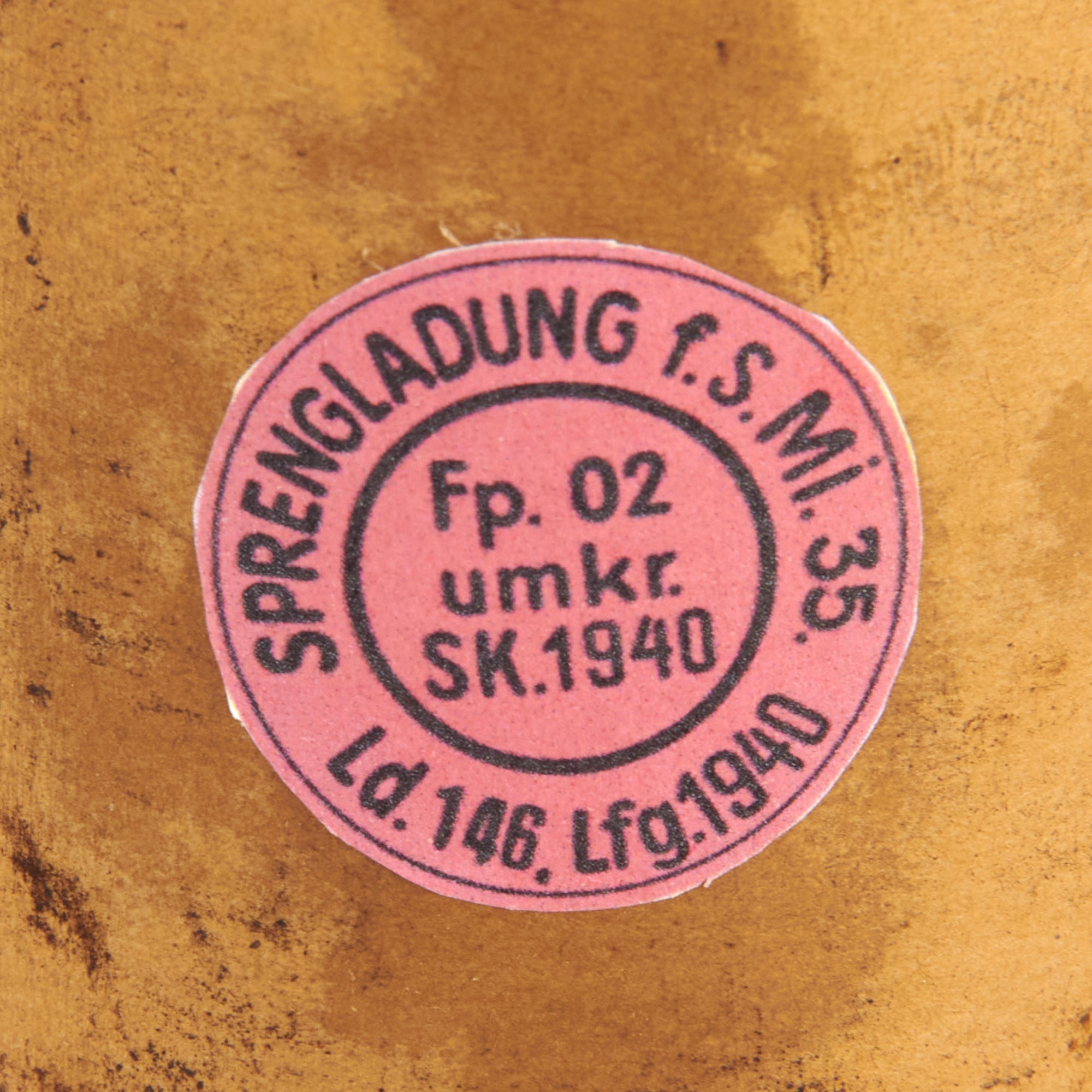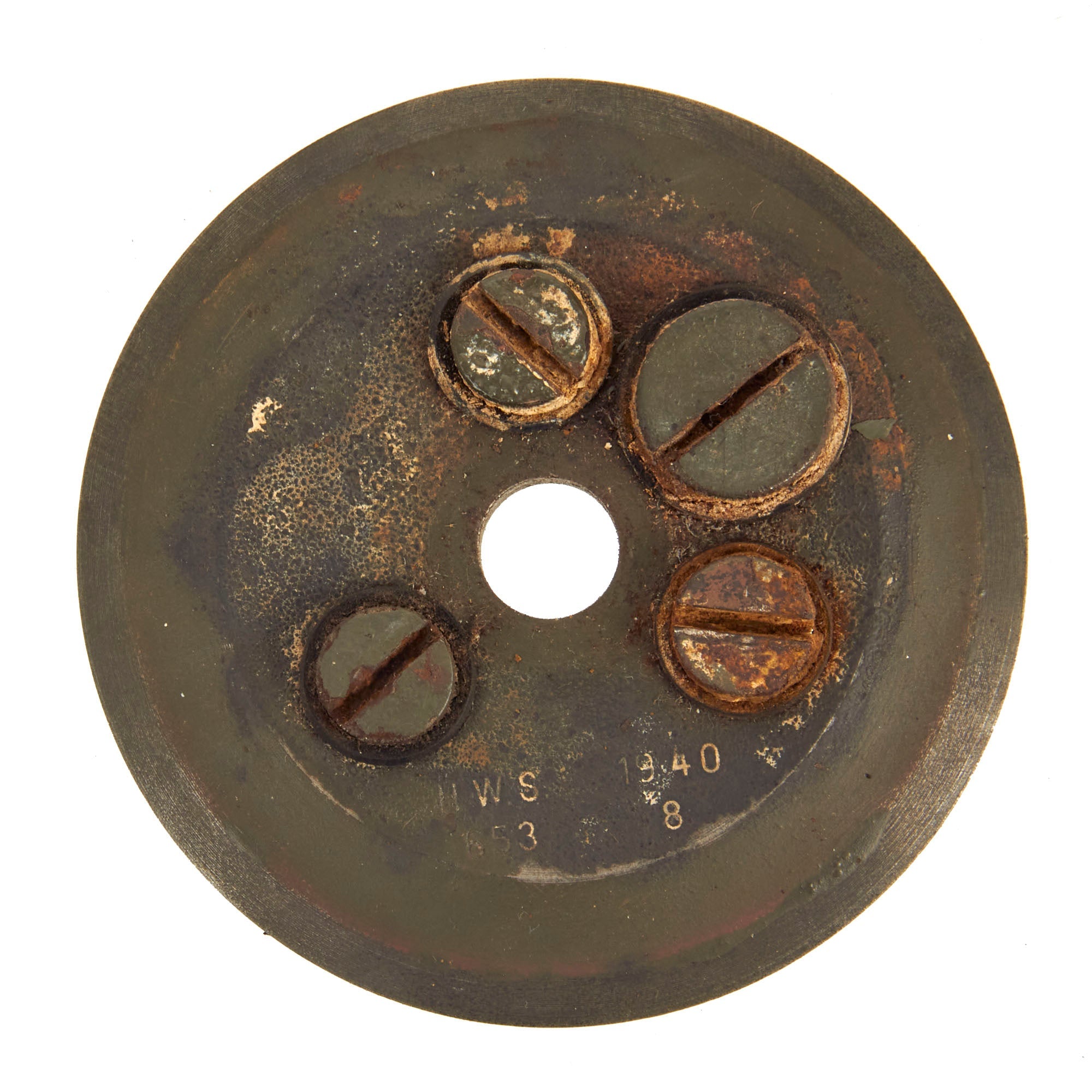 The mine bears original green paint on the exterior, and is maker marked H.W.S. / 653. We have unfortunately not been able to identify this maker, as explosives manufactures prior to the three letter system used their initials, which makes them very hard to locate. Next to this it is marked 1940 / 8, for manufacture in the 8th week of 1940.