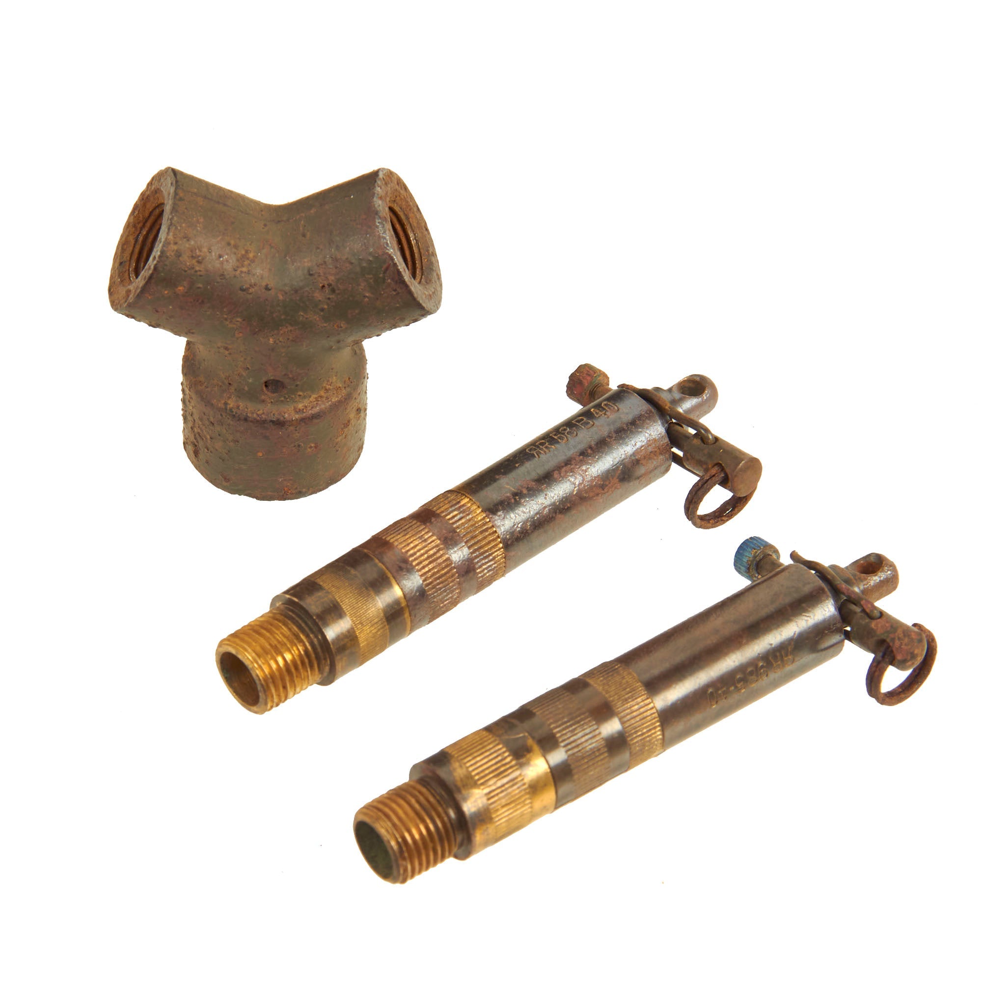 Original Item: Only One Available. This is an Incredible totally inert original German WWII 1940 dated S-Mine, with two tripwire activated fuses as well other accessories including the hard to find fuse elbow. It also includes three deactivated detonator tubes, and a replica fully-marked TNT charge (Geladen) constructed of wood with original paper label. The interior is filled with replica shrapnel (used ball bearings) which are nearly identical to the shrapnel that would have been used during WWII. These give weight and authenticity to the mine.