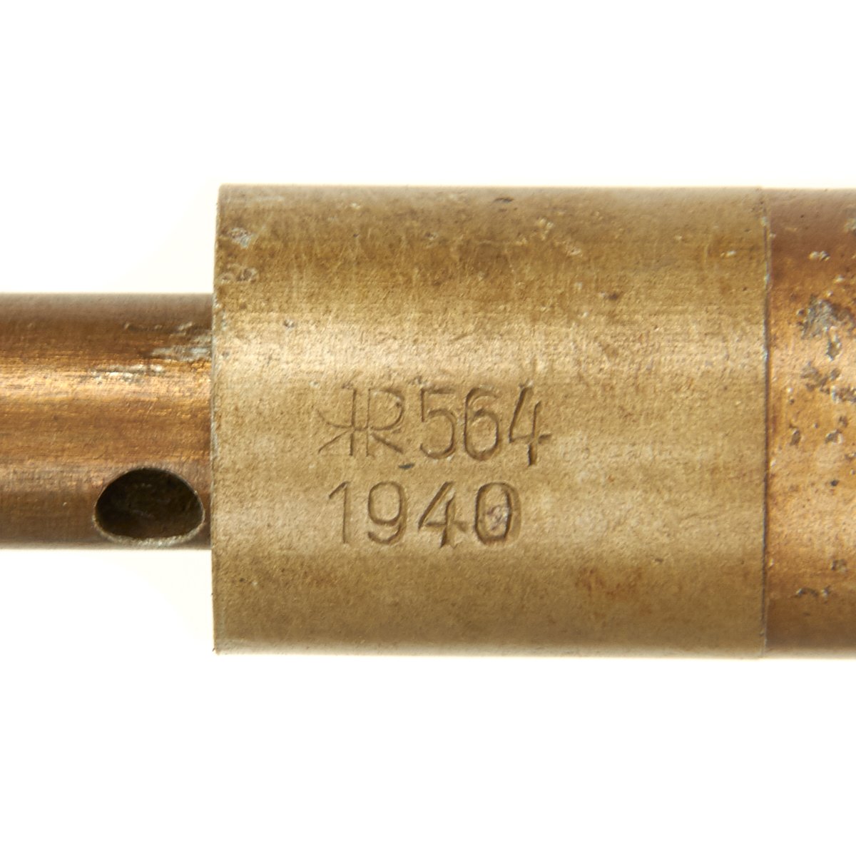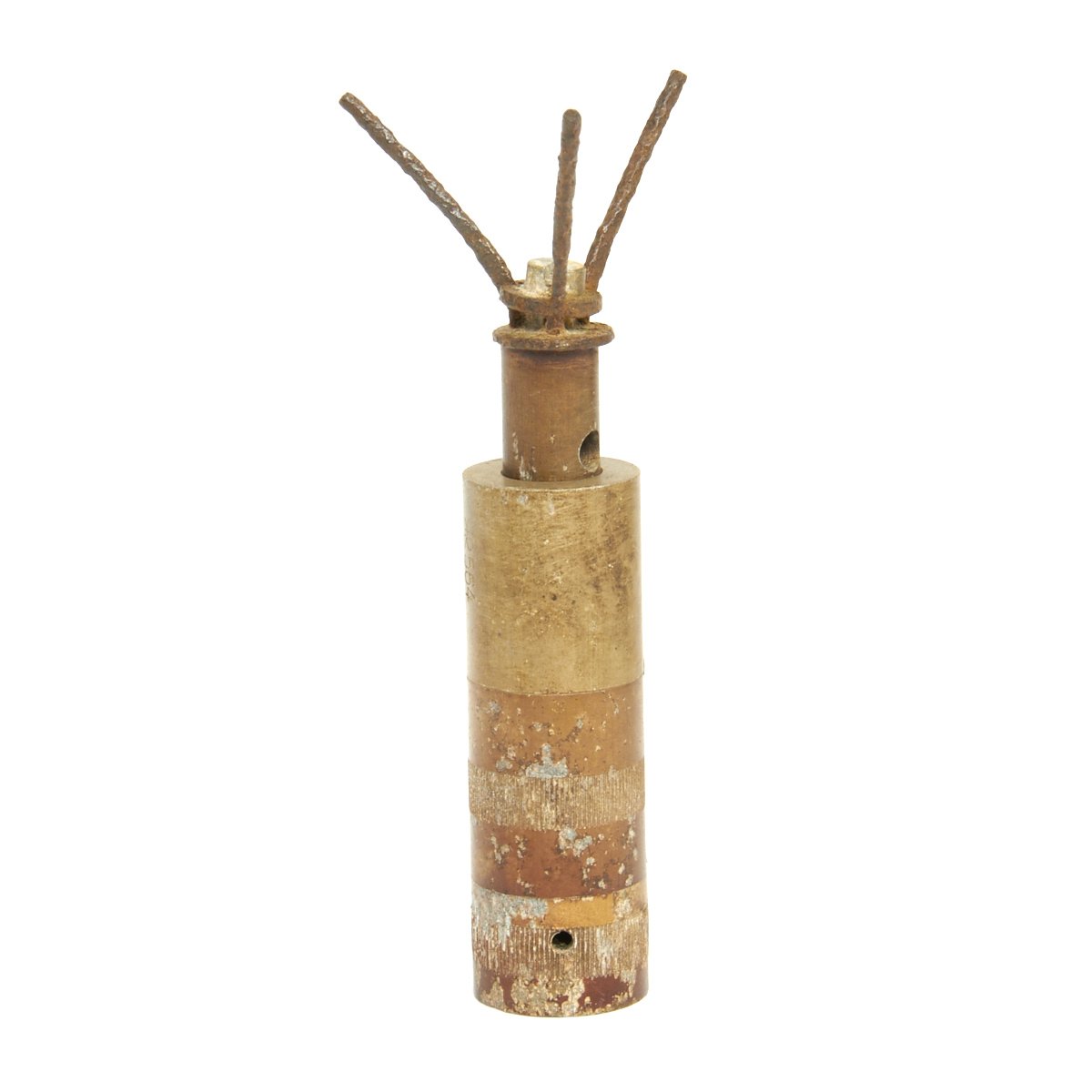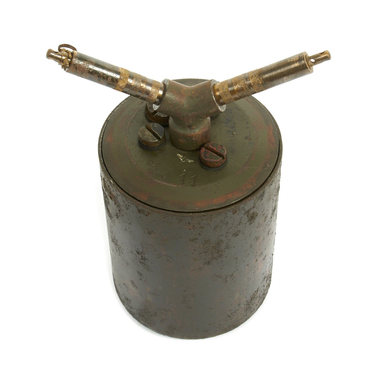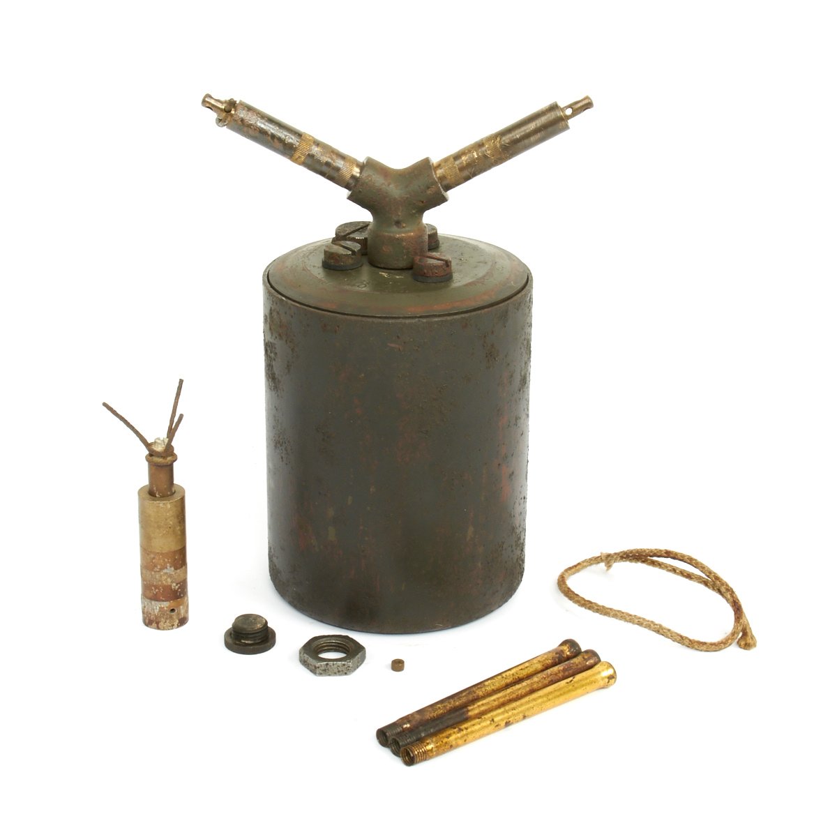 Original Item: Only One Available. Incredible totally inert original German WWII 1913 dated S-Mine complete with one pressure activated fuse that was designed to resemble blades of grass as well other accessories in including the hard to find fuse elbow, and both trip wire fuses! Also included are the three deactivated detonator tubes. This example does not have the original ball-bearing style shrapnel, though they can be sourced relatively easily. It bears original green paint and is marked on the top with a waffenampt paint stamping and German maker markings and date: