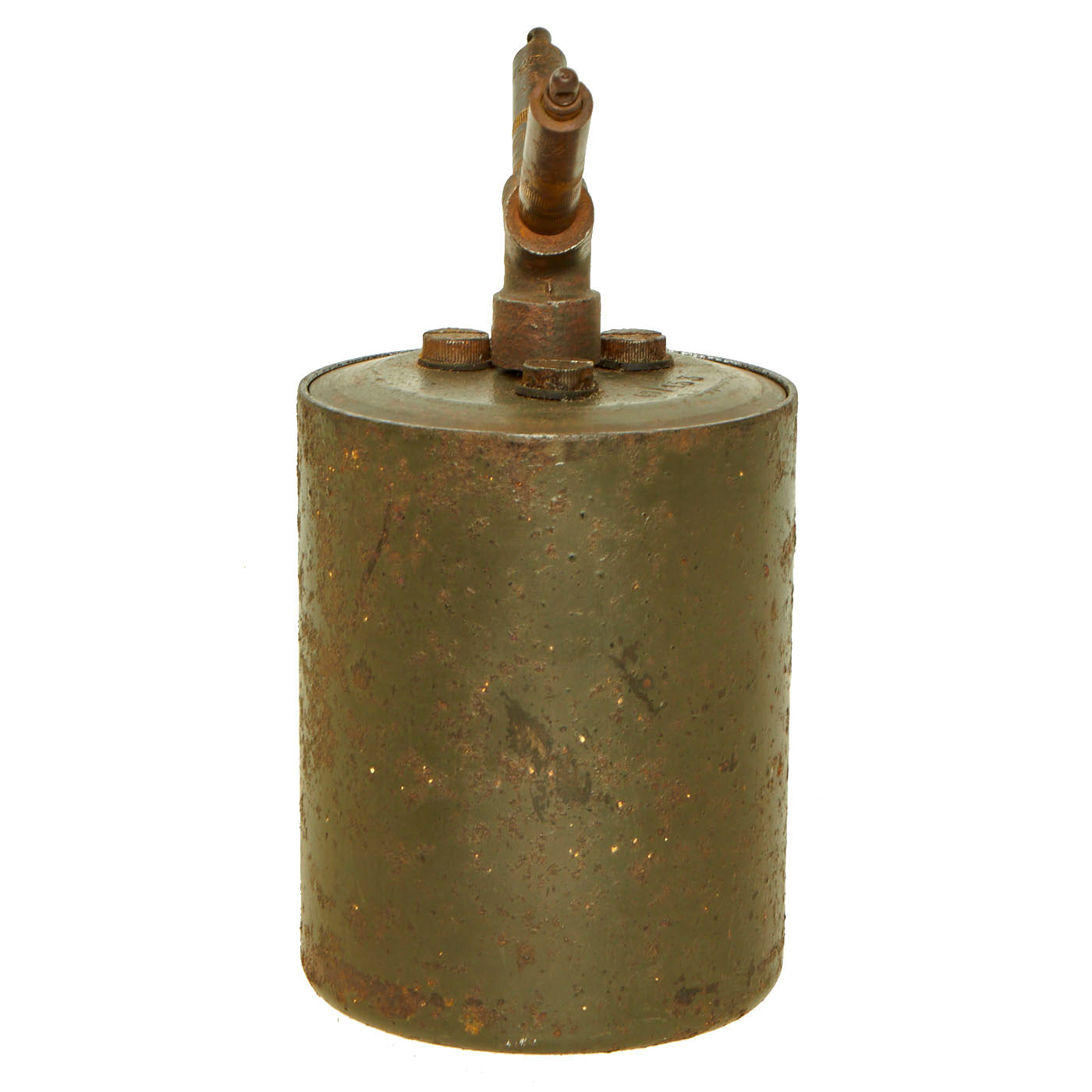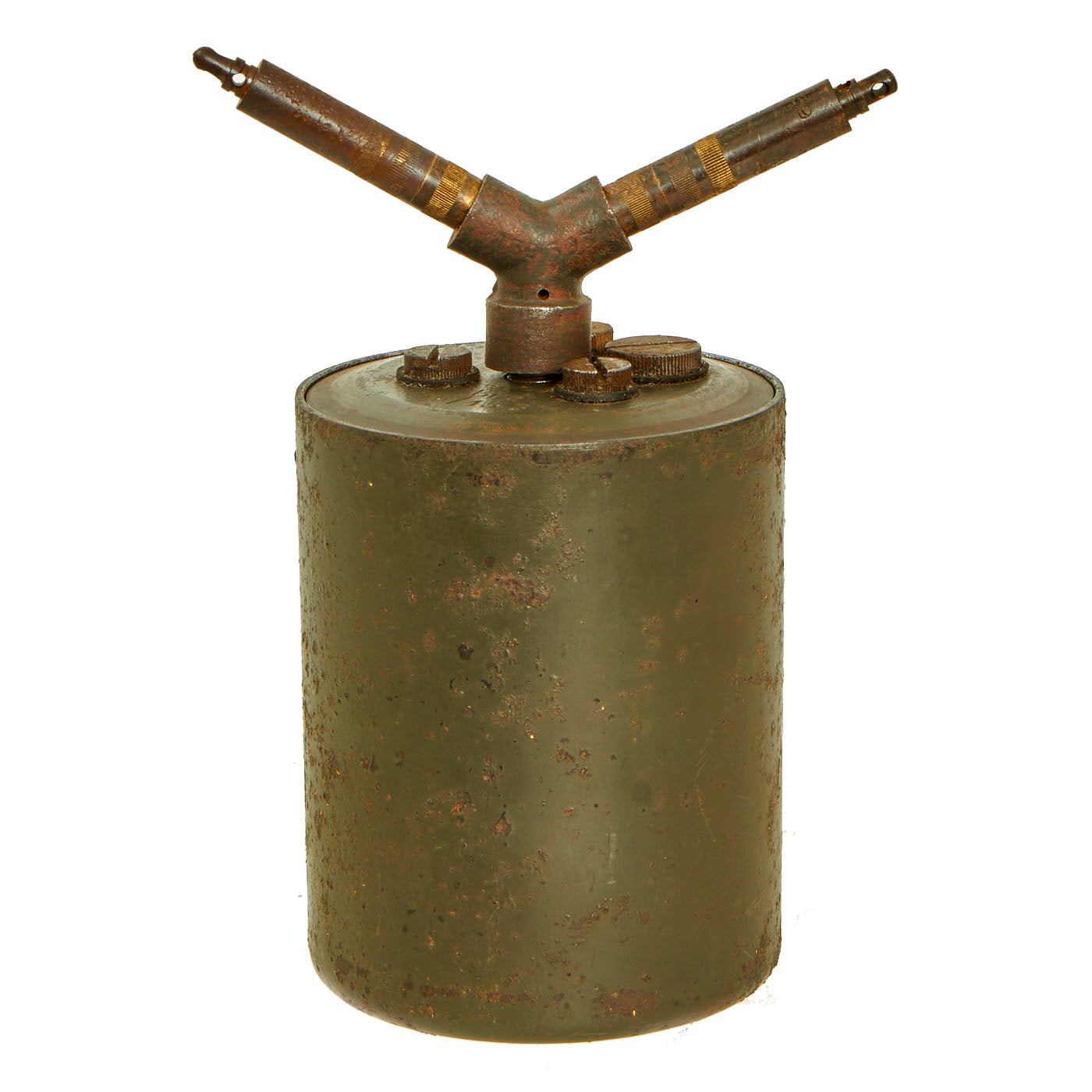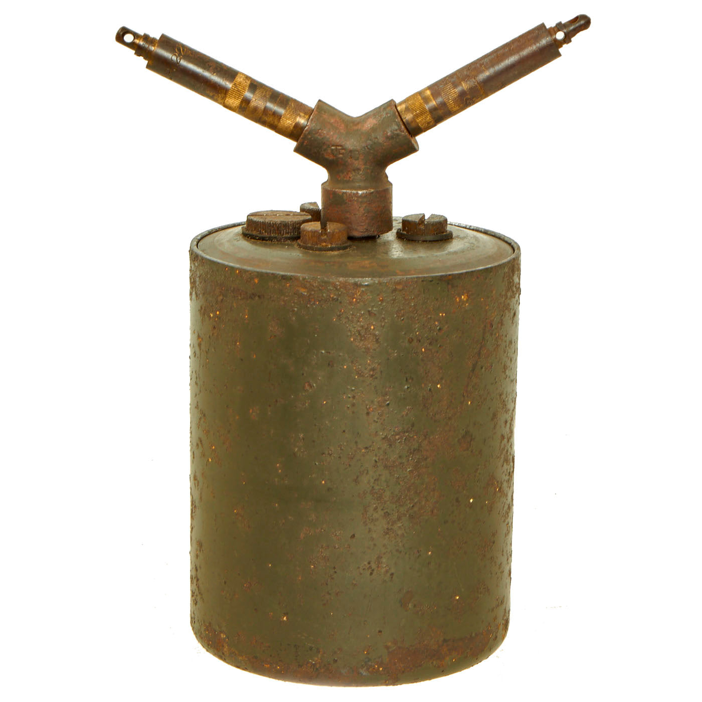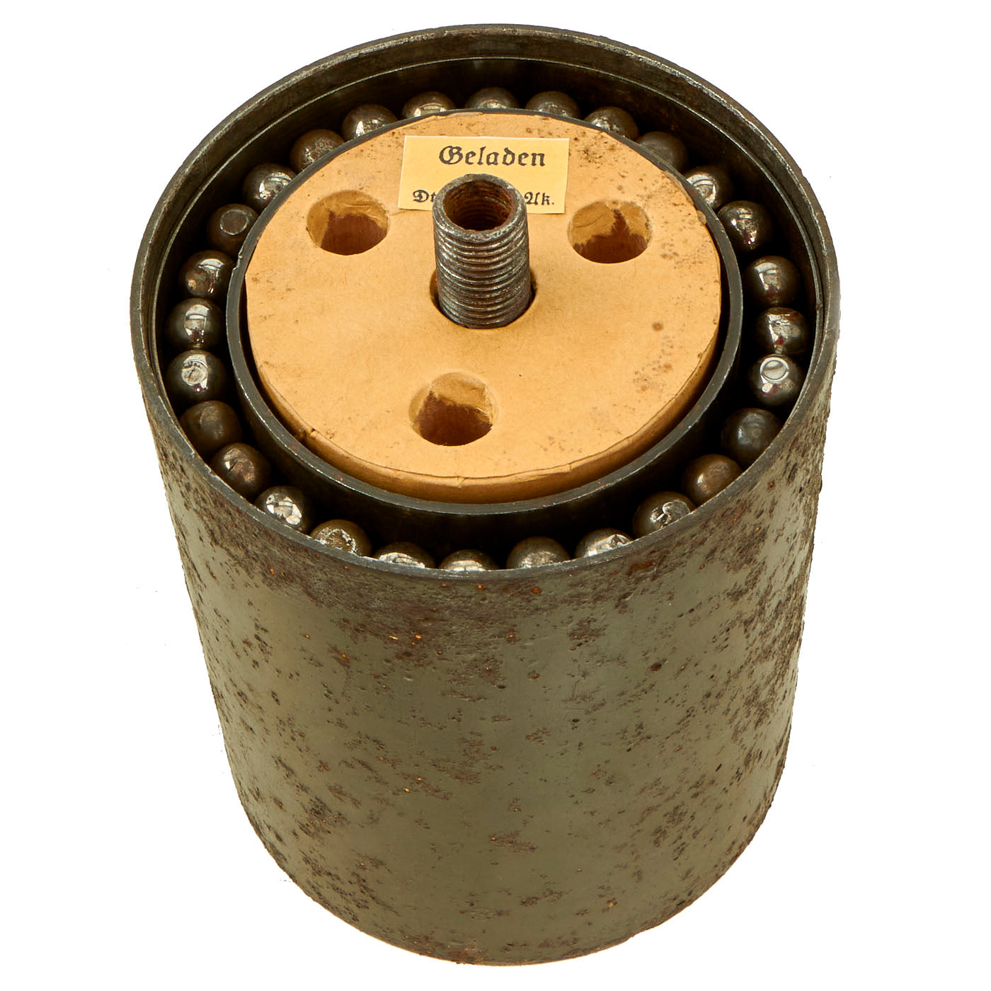 Original Item: Only One Available. This is an incredible, totally inert, BATF compliant original German WWII SMi.-35 S-Mine, with one pressure activated fuse that was designed to resemble blades of grass. It also includes the deactivated detonator tubes, the bakelite fuze end plug, and a replica fully-marked TNT charge (Geladen) constructed of wood with original paper label. The space between the inner and outer housing is filled with shrapnel (used ball bearings), which are nearly identical to the shrapnel that would have been used during WWII. These give weight and authenticity to the mine.
