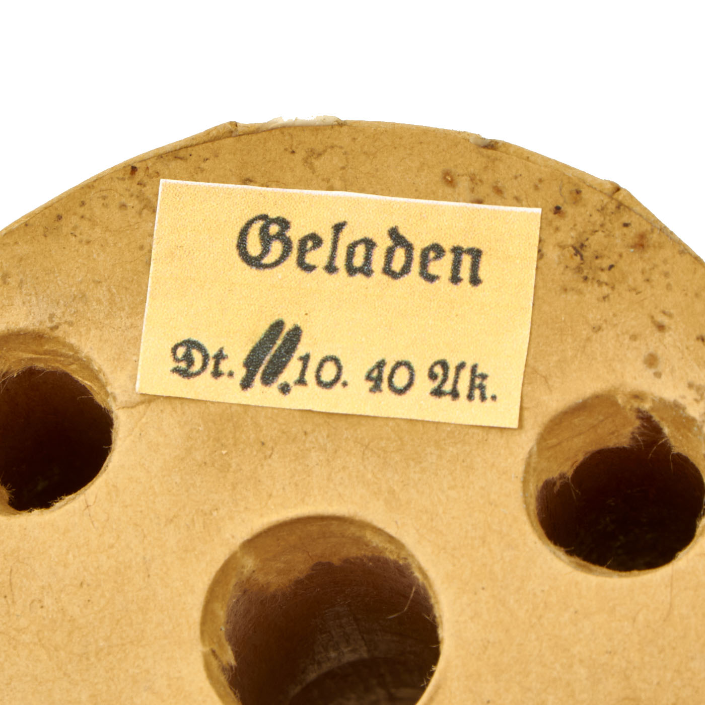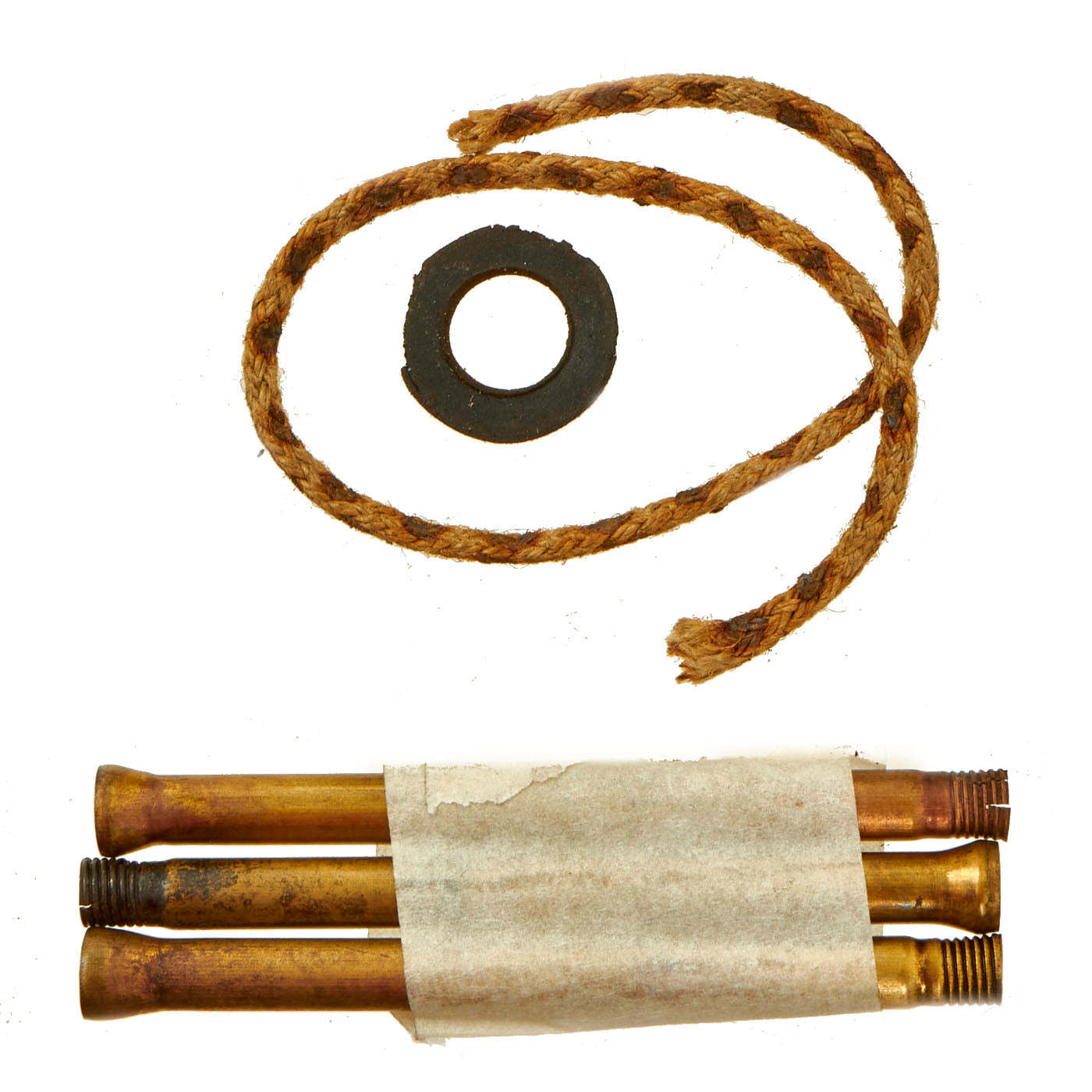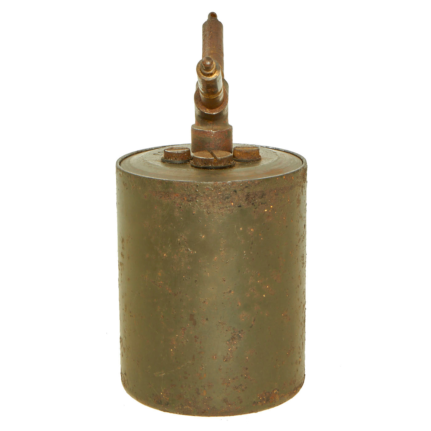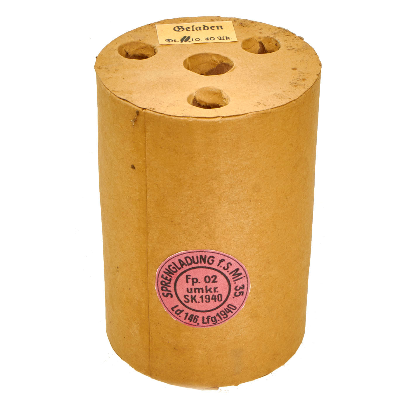 Original Item: Only One Available. This is an incredible, totally inert, BATF compliant original German WWII SMi.-35 S-Mine, with one pressure activated fuse that was designed to resemble blades of grass. It also includes the deactivated detonator tubes, the bakelite fuze end plug, and a replica fully-marked TNT charge (Geladen) constructed of wood with original paper label. The space between the inner and outer housing is filled with shrapnel (used ball bearings), which are nearly identical to the shrapnel that would have been used during WWII. These give weight and authenticity to the mine.