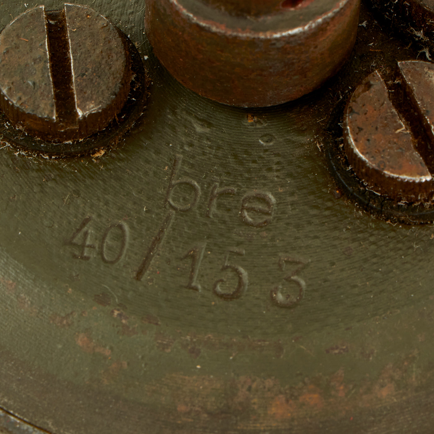 The mine bears little of the original green paint with a red primer and marked on the top with bre 40/153 and is a maker we have not been able to identify. The pressure fuze is also maker marked and dated RR 227 1939. This corresponds to the manufacturer Richard Rinker G.m.b.H. in Menden/Iserlohn, and it has the early war "Reverse R" marking. This company was the original designer of the M24 stick grenade. Rinker also had many factories and subcontractors, which is what the number 344 corresponds to.