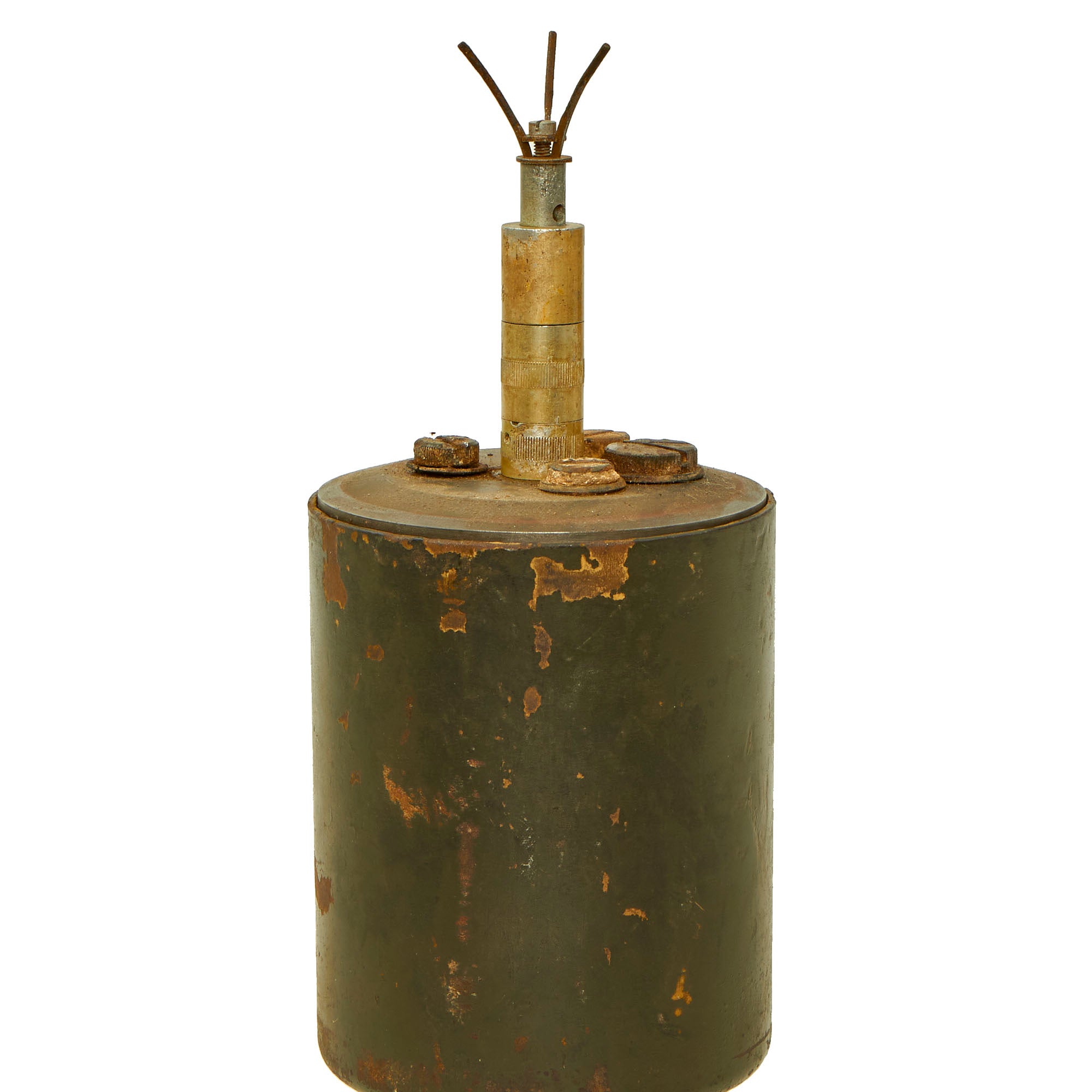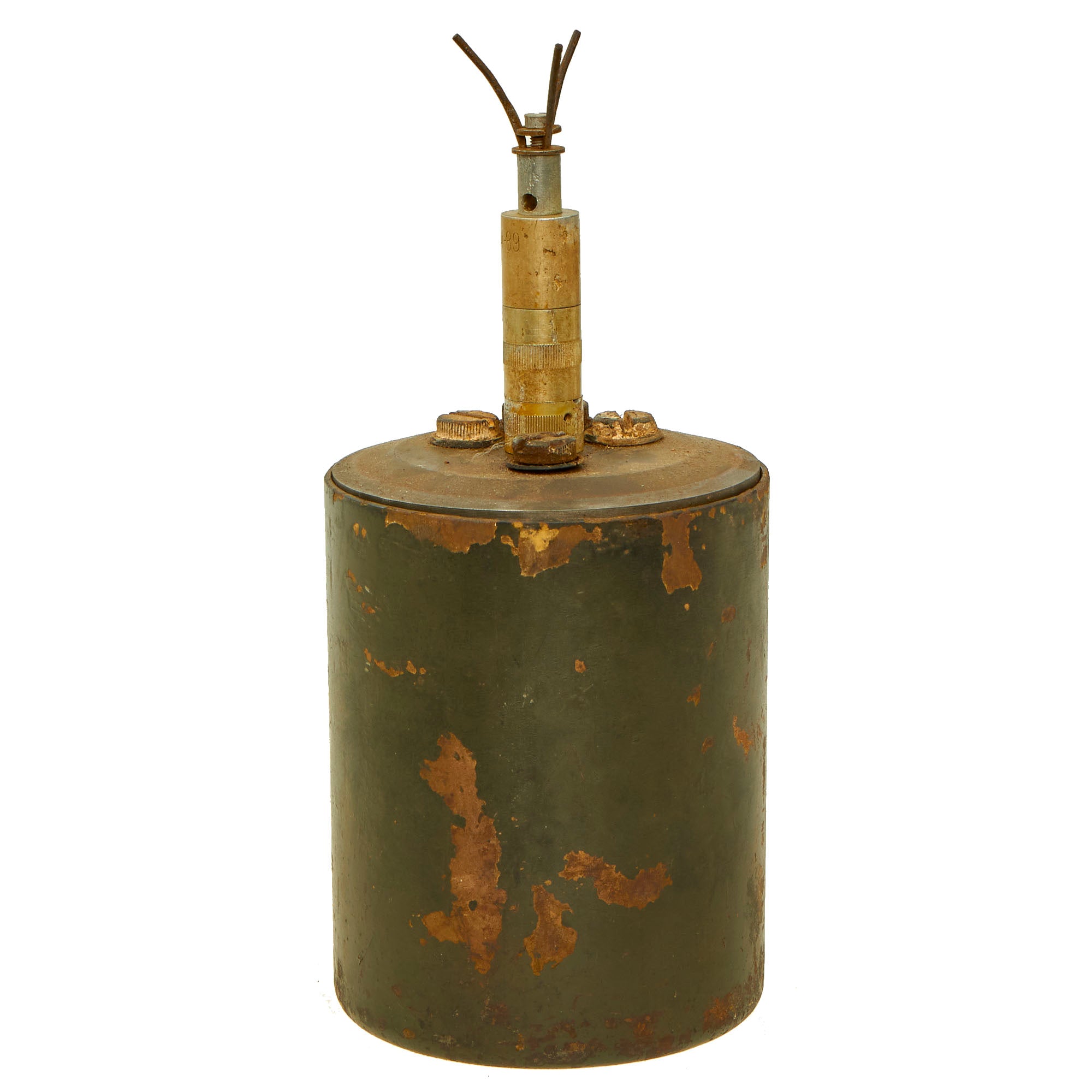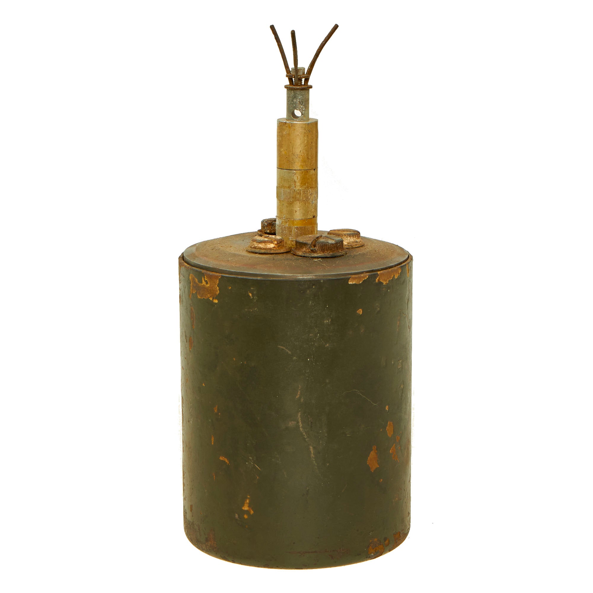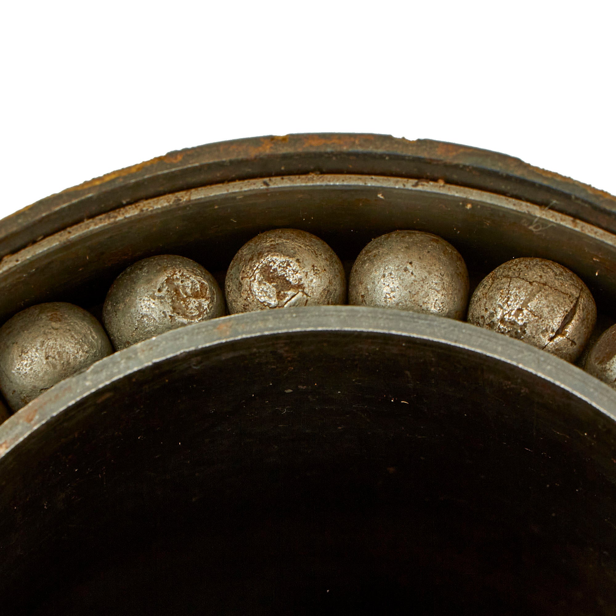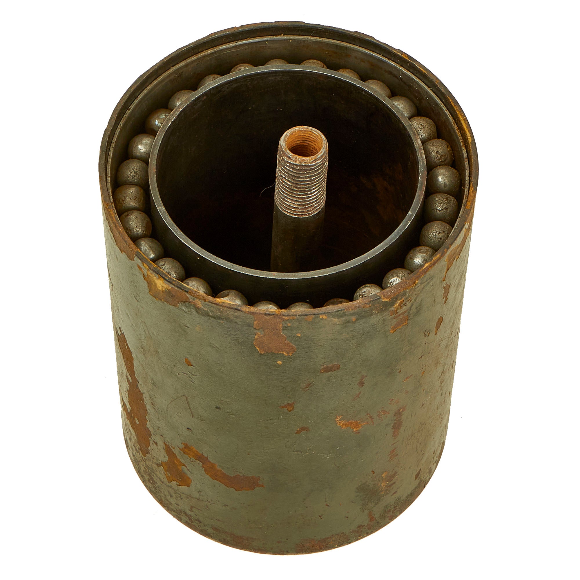 Original Item: Only One Available. This is an incredible, totally inert, BATF compliant original German WWII SMi.-35 S-Mine, with one pressure activated fuse that was designed to resemble blades of grass. This example comes with the larger pressure 35 fuse as well, and also includes the deactivated detonator tubes, installed on the fittings on the bottom of the inner housing. The space between the inner and outer housing is filled with shrapnel (used ball bearings), which are nearly identical to the shrapnel that would have been used during WWII. These give weight and authenticity to the mine. It also has what looks to be the original packing on top of the shrapnel, which would keep it from moving around during transport.