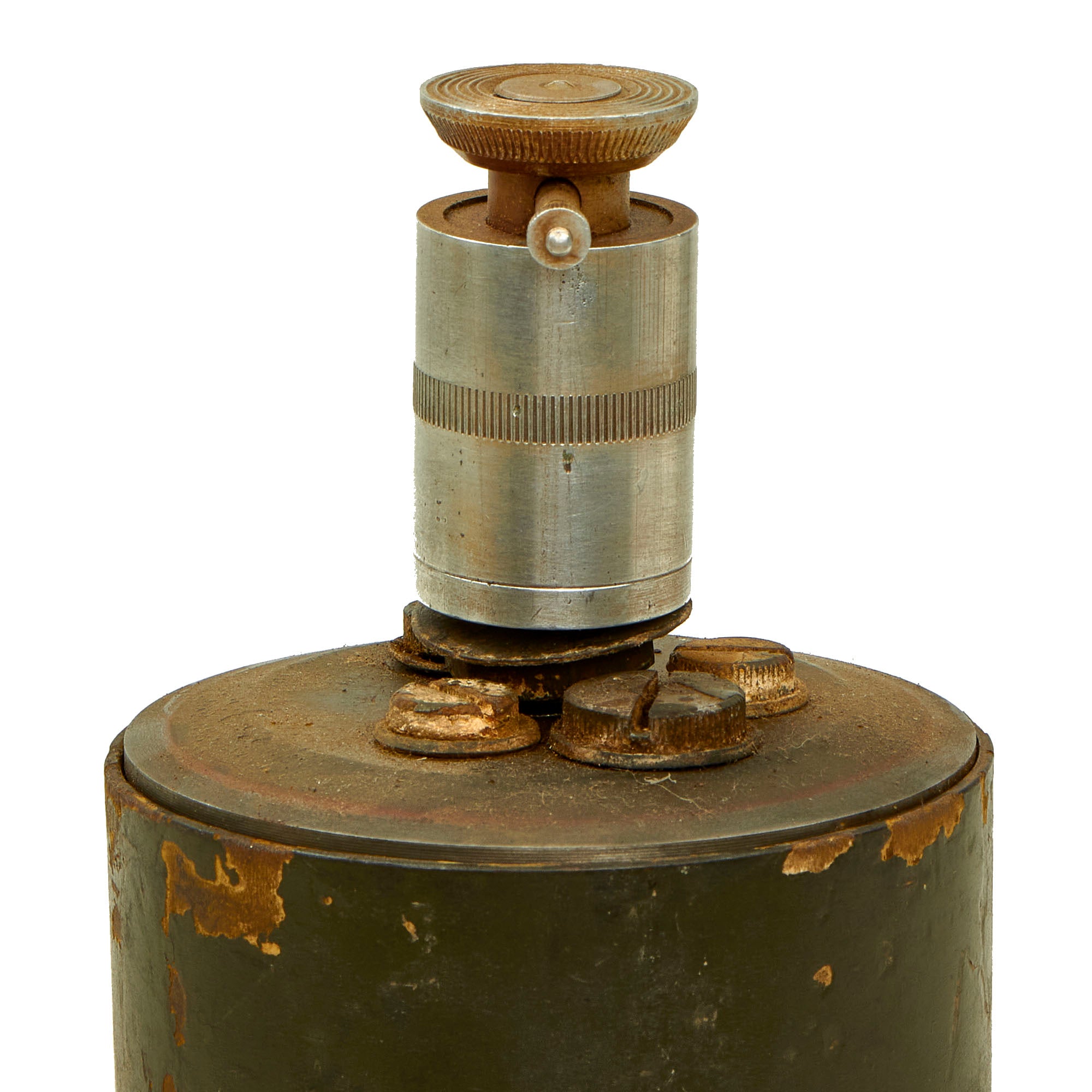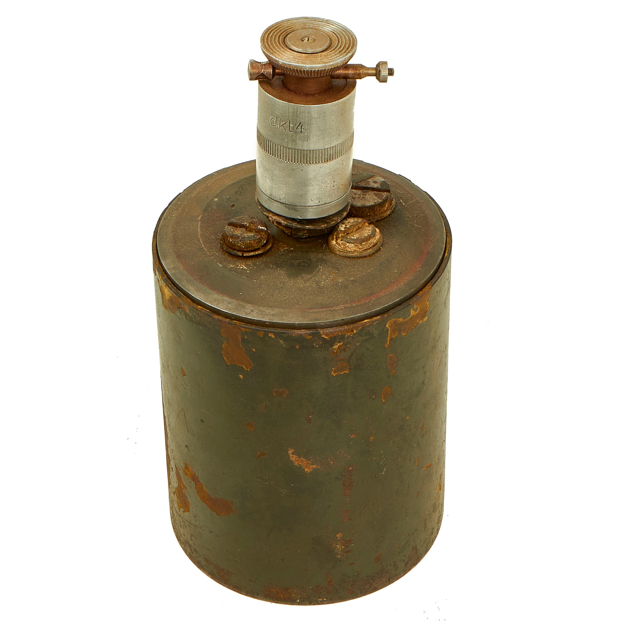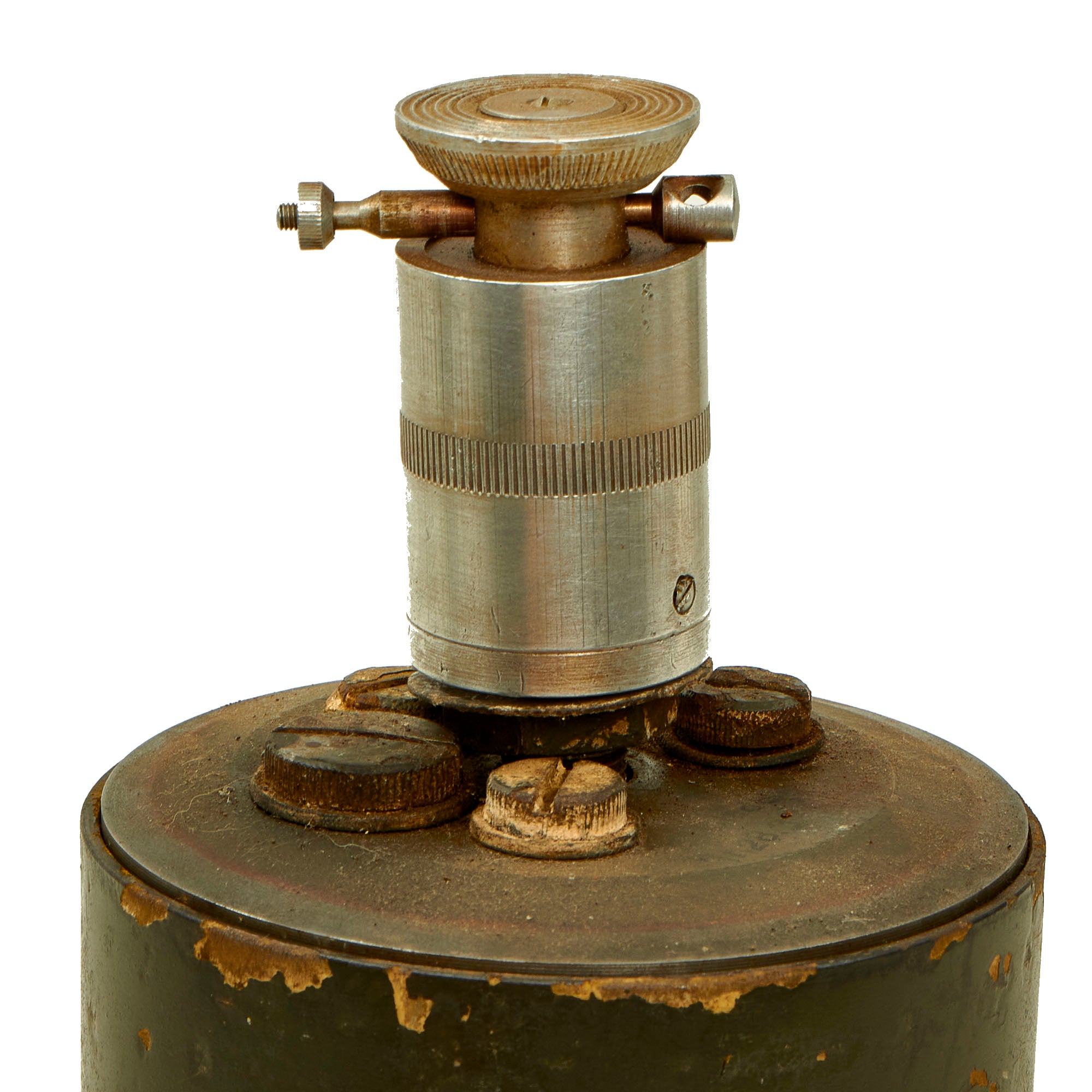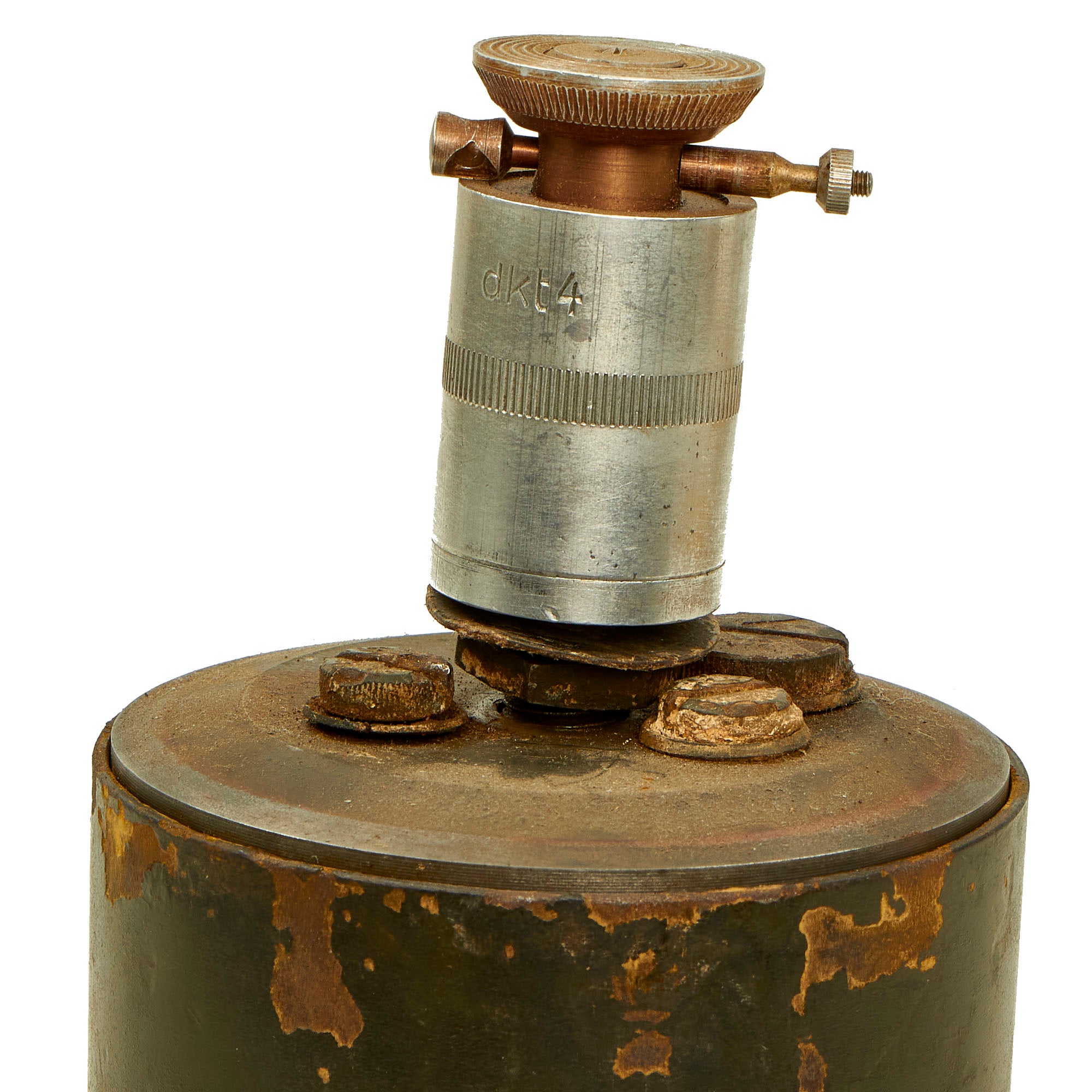 Original Item: Only One Available. This is an incredible, totally inert, BATF compliant original German WWII SMi.-35 S-Mine, with one pressure activated fuse that was designed to resemble blades of grass. This example comes with the larger pressure 35 fuse as well, and also includes the deactivated detonator tubes, installed on the fittings on the bottom of the inner housing. The space between the inner and outer housing is filled with shrapnel (used ball bearings), which are nearly identical to the shrapnel that would have been used during WWII. These give weight and authenticity to the mine. It also has what looks to be the original packing on top of the shrapnel, which would keep it from moving around during transport.