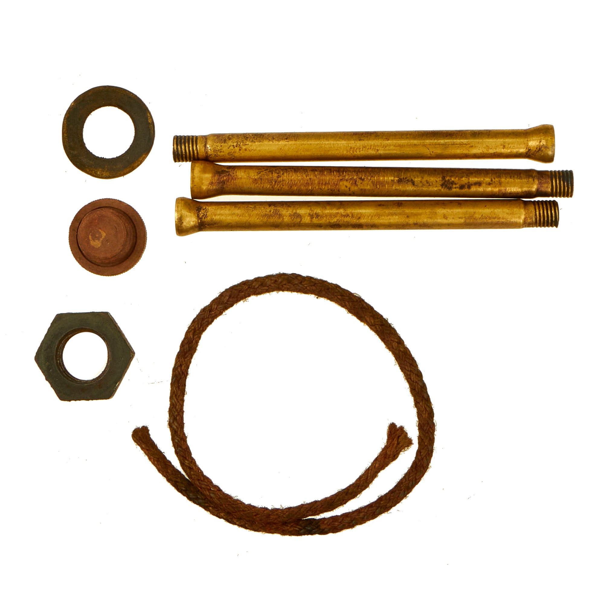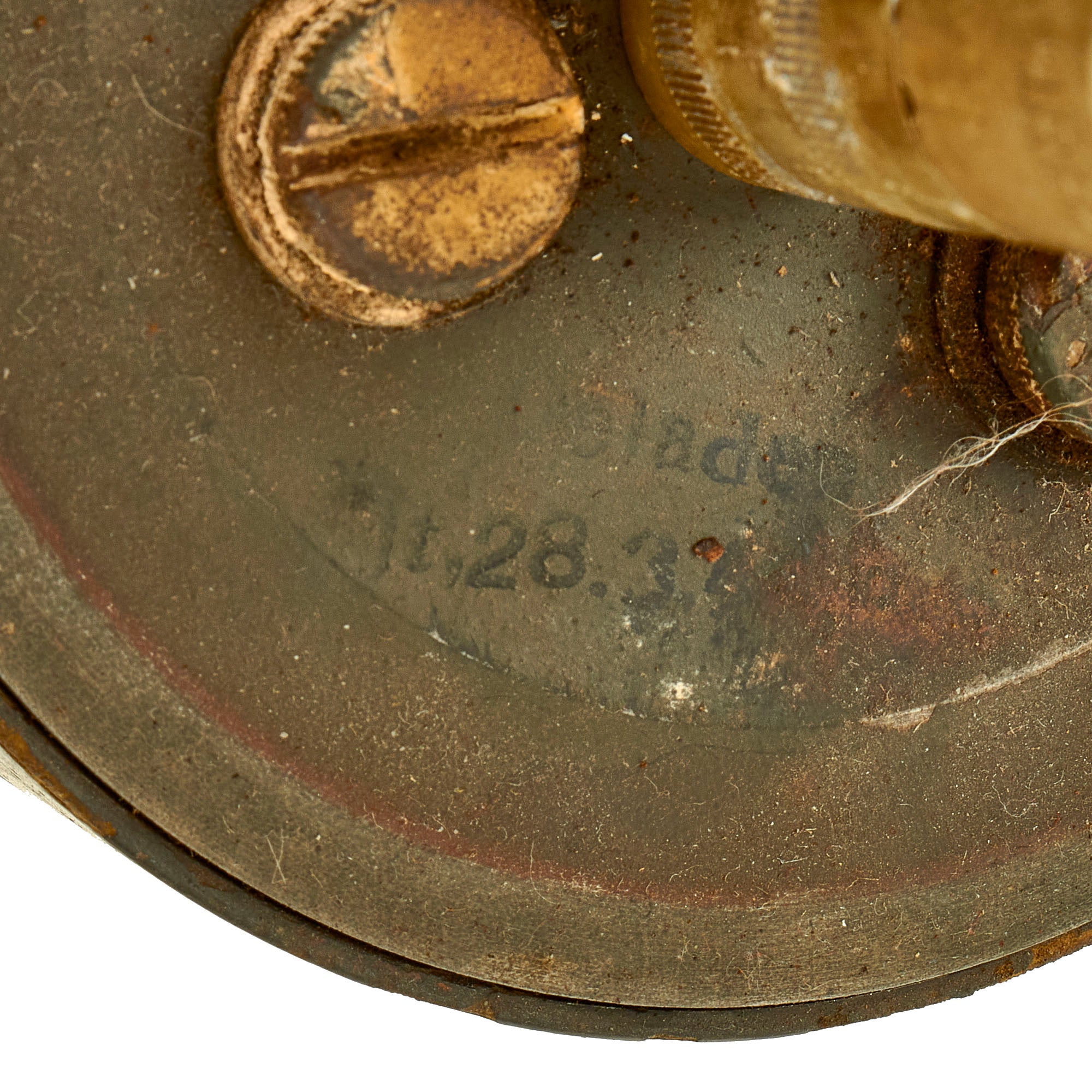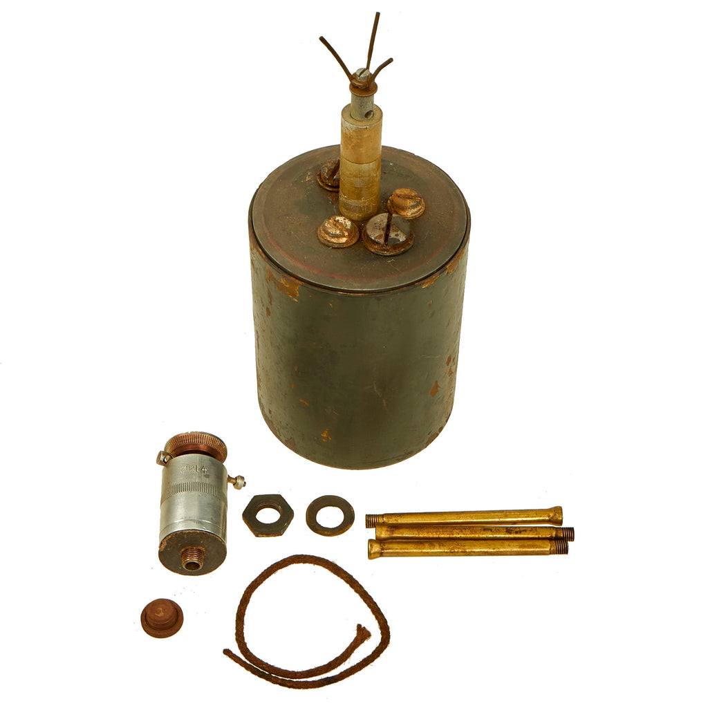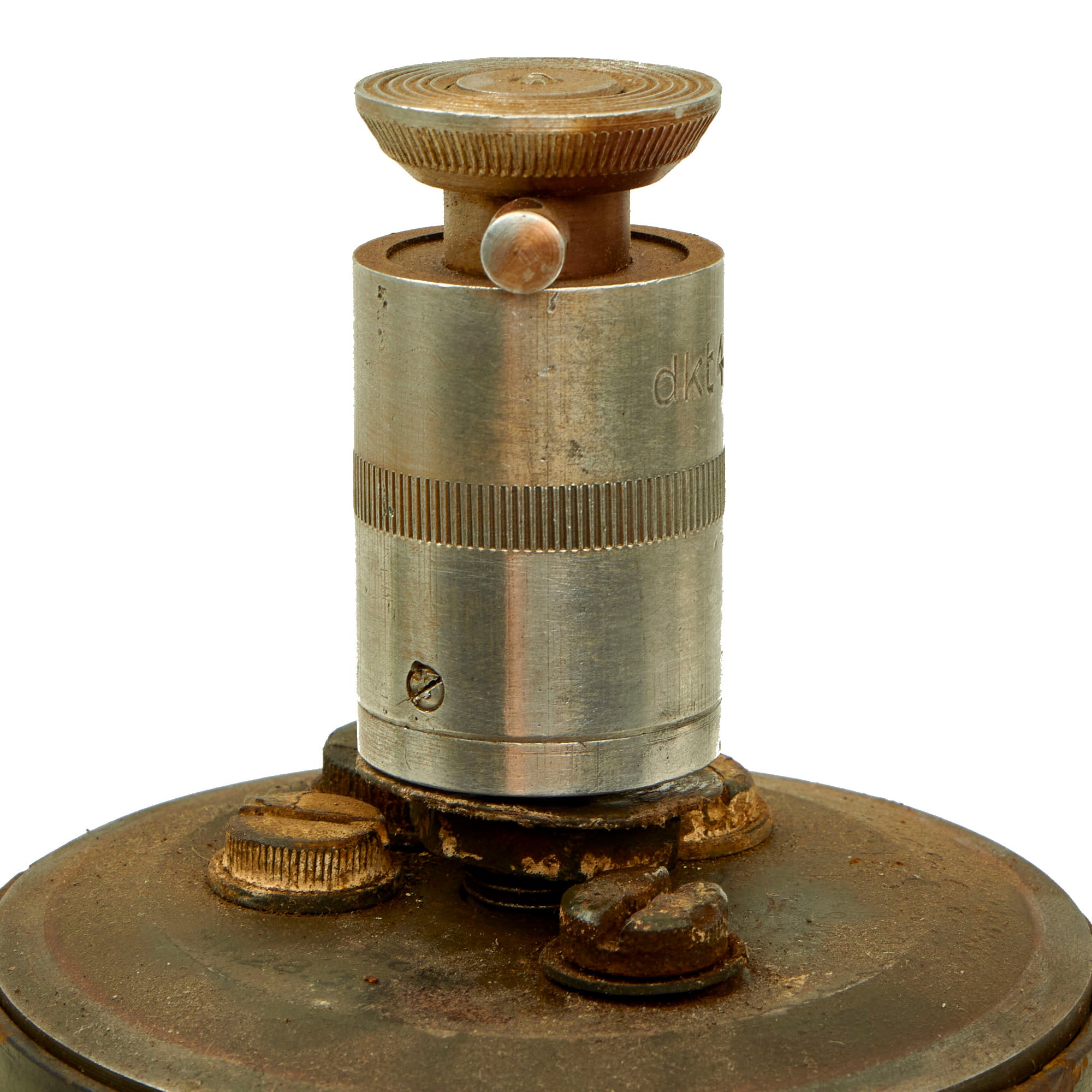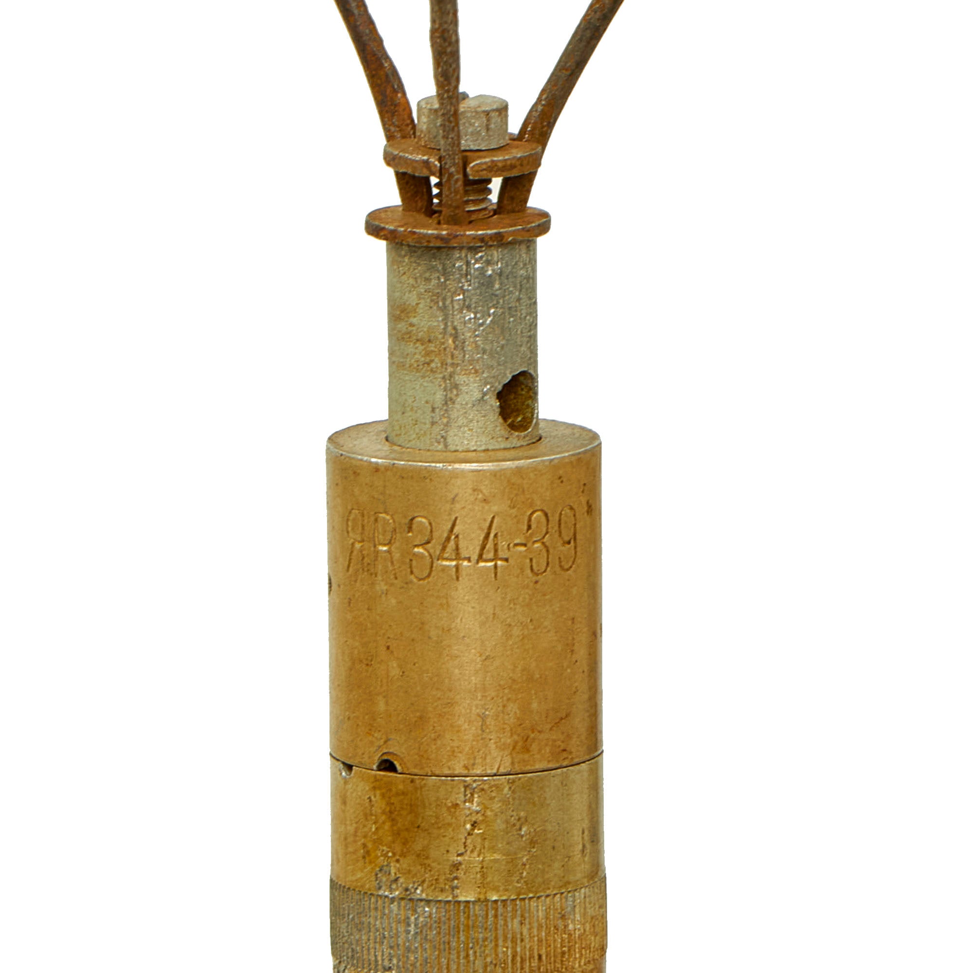 Original Item: Only One Available. This is an incredible, totally inert, BATF compliant original German WWII SMi.-35 S-Mine, with one pressure activated fuse that was designed to resemble blades of grass. This example comes with the larger pressure 35 fuse as well, and also includes the deactivated detonator tubes, installed on the fittings on the bottom of the inner housing. The space between the inner and outer housing is filled with shrapnel (used ball bearings), which are nearly identical to the shrapnel that would have been used during WWII. These give weight and authenticity to the mine. It also has what looks to be the original packing on top of the shrapnel, which would keep it from moving around during transport.