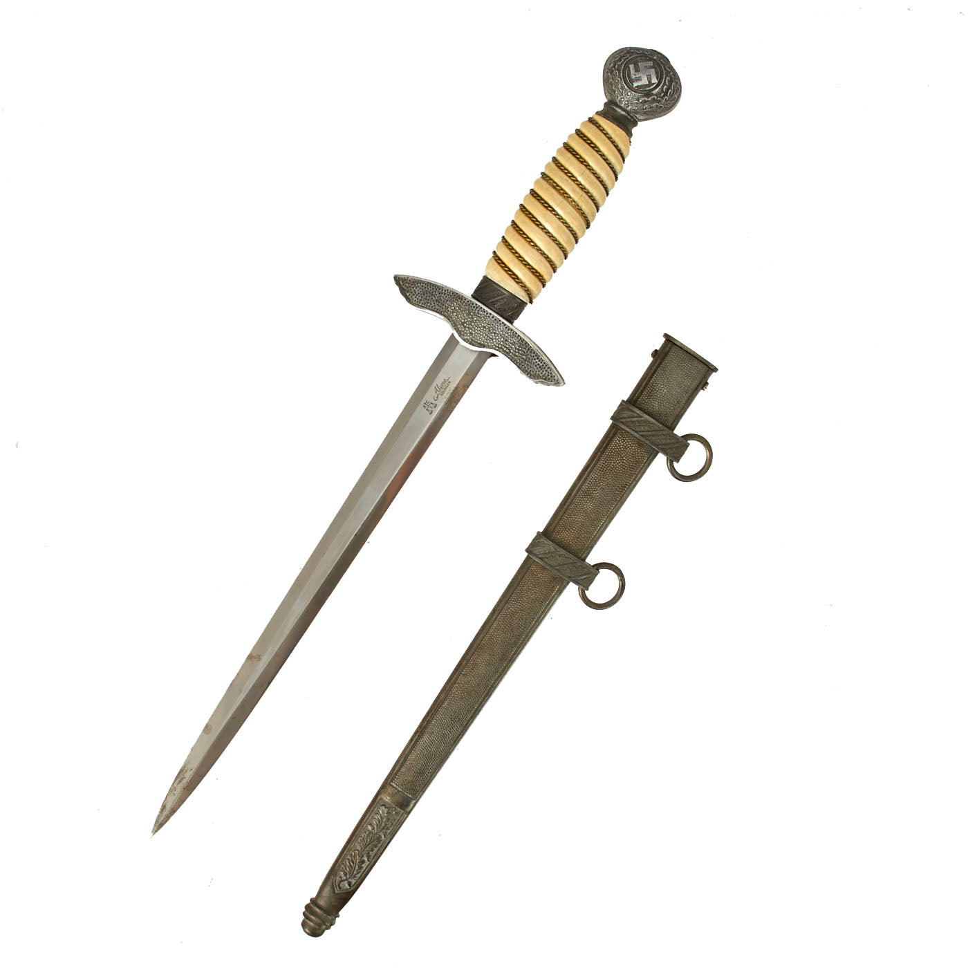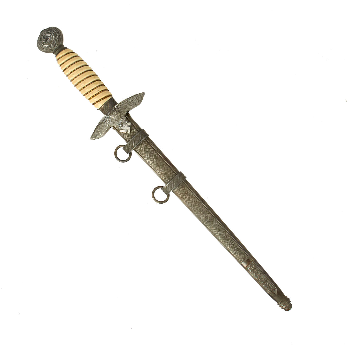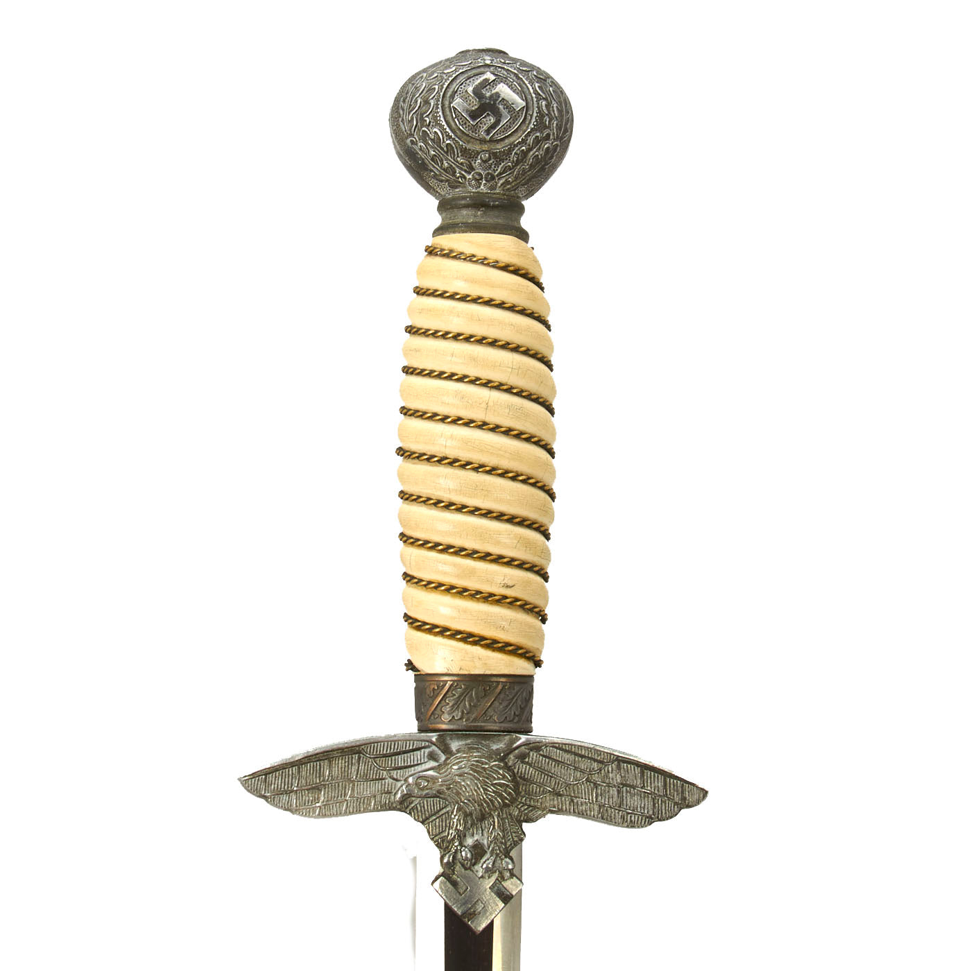 Original Item: Only One Available. This is a very nice example of a mid-war production 2nd Model Luftwaffe dagger. It is a fine Solingen-Produced example made by the Solingen-based firm of ALCOSO - Alexander Coppel & Co. KG, Stahlwarenfabrik. The celluloid grip of this dagger is a nice light ivory white color, and has not faded to orange as they so often do. It remains in good condition throughout, though there is surface cracking and checking visible. It has a nice slightly tapered shape, and is tightly wrapped with twisted wires.