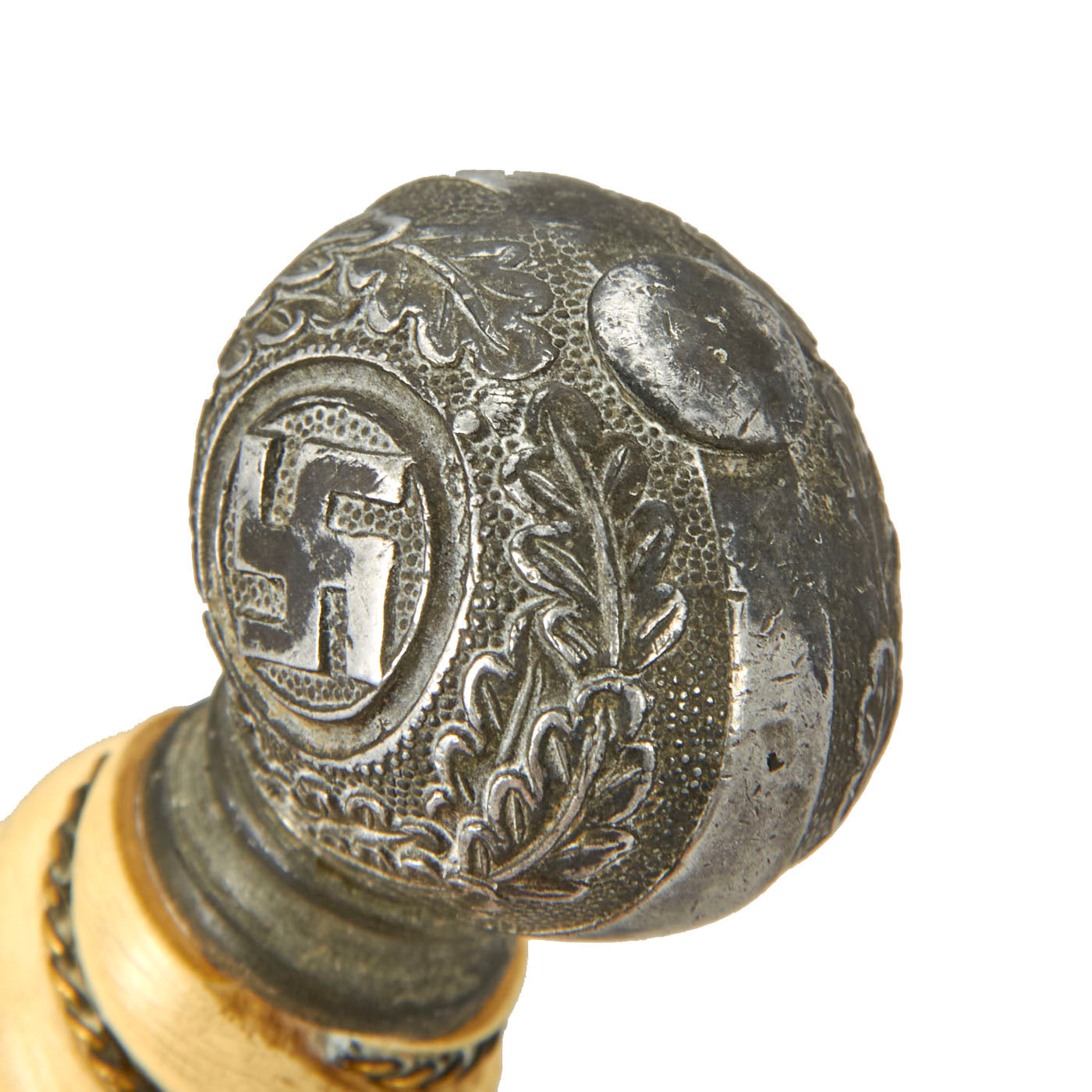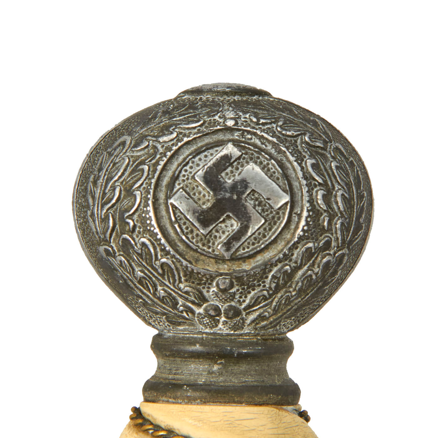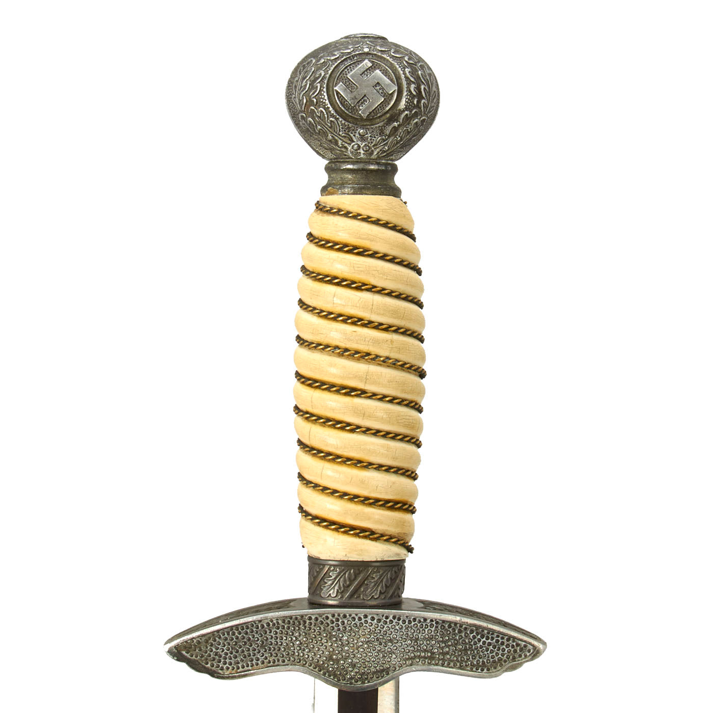 Original Item: Only One Available. This is a very nice example of a mid-war production 2nd Model Luftwaffe dagger. It is a fine Solingen-Produced example made by the Solingen-based firm of ALCOSO - Alexander Coppel & Co. KG, Stahlwarenfabrik. The celluloid grip of this dagger is a nice light ivory white color, and has not faded to orange as they so often do. It remains in good condition throughout, though there is surface cracking and checking visible. It has a nice slightly tapered shape, and is tightly wrapped with twisted wires.