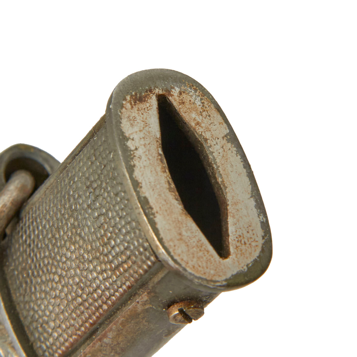 The scabbard is a typical Alcoso type, having the distinctive rounded shape to the shell. It has the correct airplane gray finish and good, fine pebbled surfaces. There is wear down to the base steel on the narrow sides, but there is no denting or other damage. The hanging bands are zinc, and have a lovely dark patina. The throat is held in placed by two "cheesehead" screws on the narrow sides of the scabbard, and show no signs of turning.