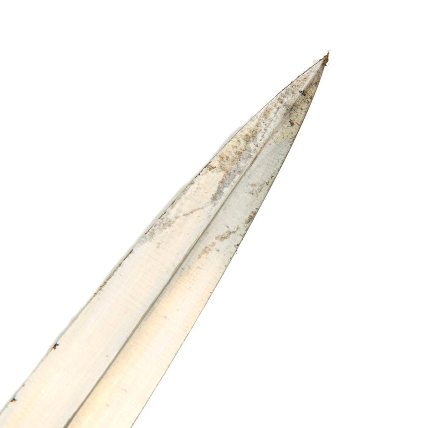 The blade is in excellent condition, with almost all of the factory final grind crossgrain visible on both sides. There is some runner wear and just a bit of light staining. The tip is as straight as any we have ever seen, and the edge is still in the correct factory unsharpened state. The original leather blade buffer is in place within the deep recesses of the guard.