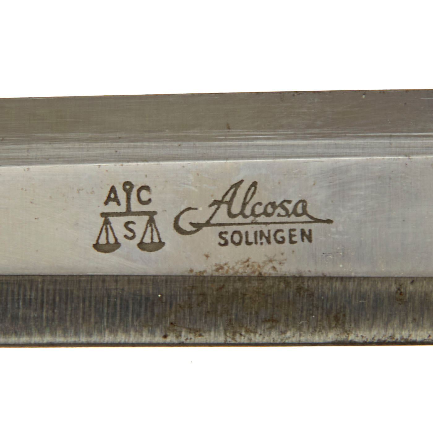 The blade on this example is not nickel plated, which is common for later produced blades. The reverse ricasso is etched with the trademark Alcoso used from 1936-1939. It depicts the scales with the firm's initials, ACS interspersed. To the right is the firm's name in in script, Alcoso, and below the town of business, SOLINGEN, the legendary "City of Blades" in Western Germany.
