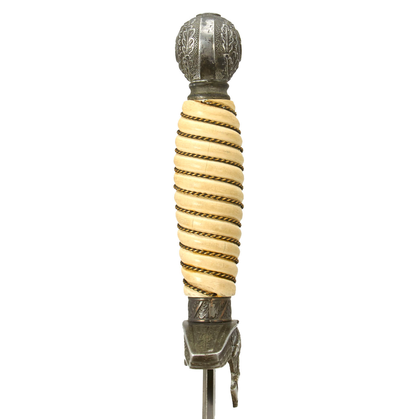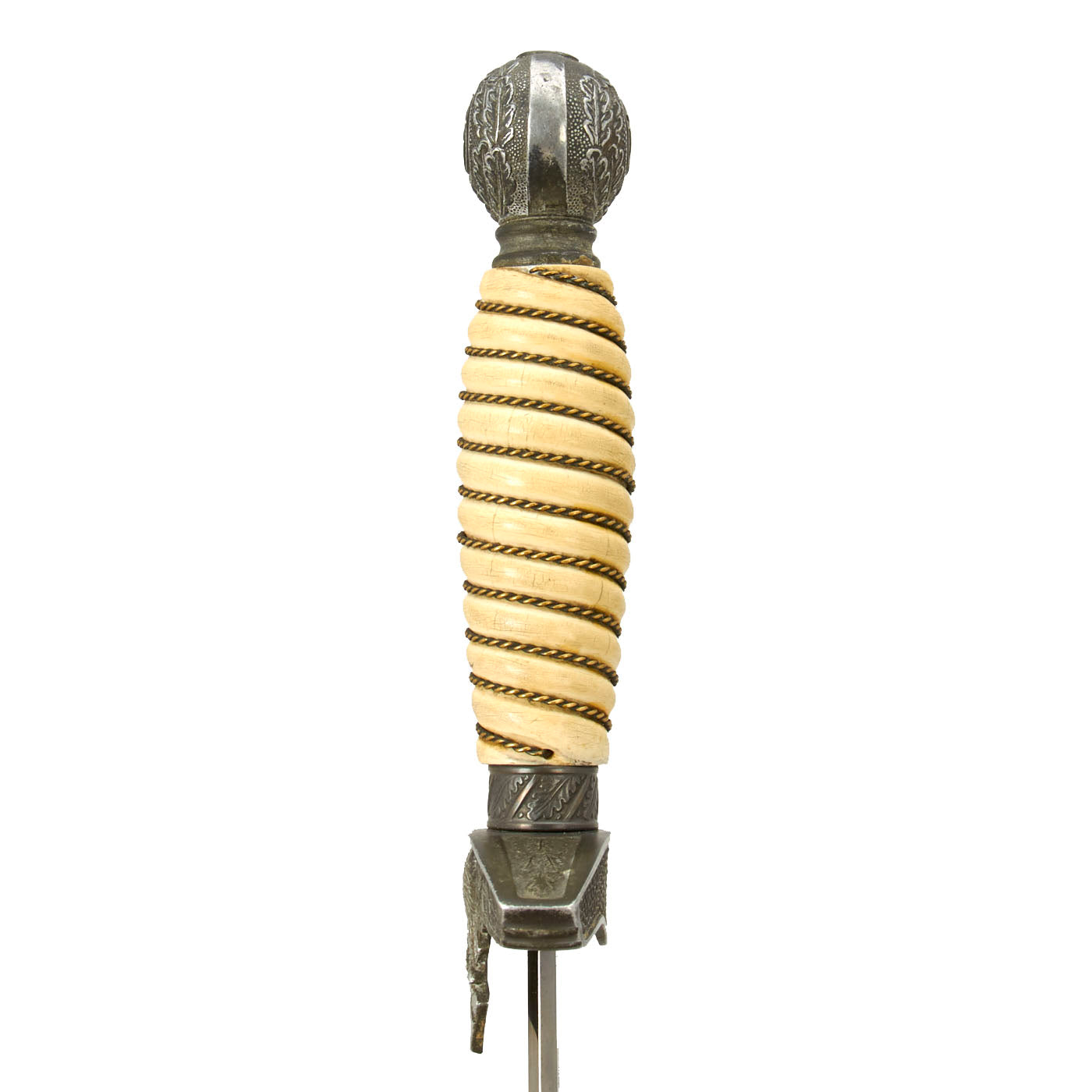 The hilt mounts are in similar condition with a lovely patina of age. The pommel is very good and still shows most of the original detail. The "mobile" swass on both sides are clear and the oak leaves around them are raised out and heavily hand enhanced. The pommel appears to be solid aluminum, and was probably originally plated, though now most of that is missing, with the remainder oxidized to a dark patina.