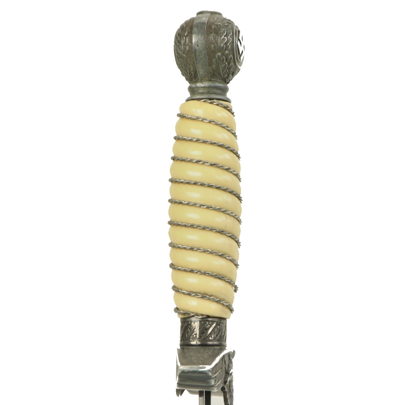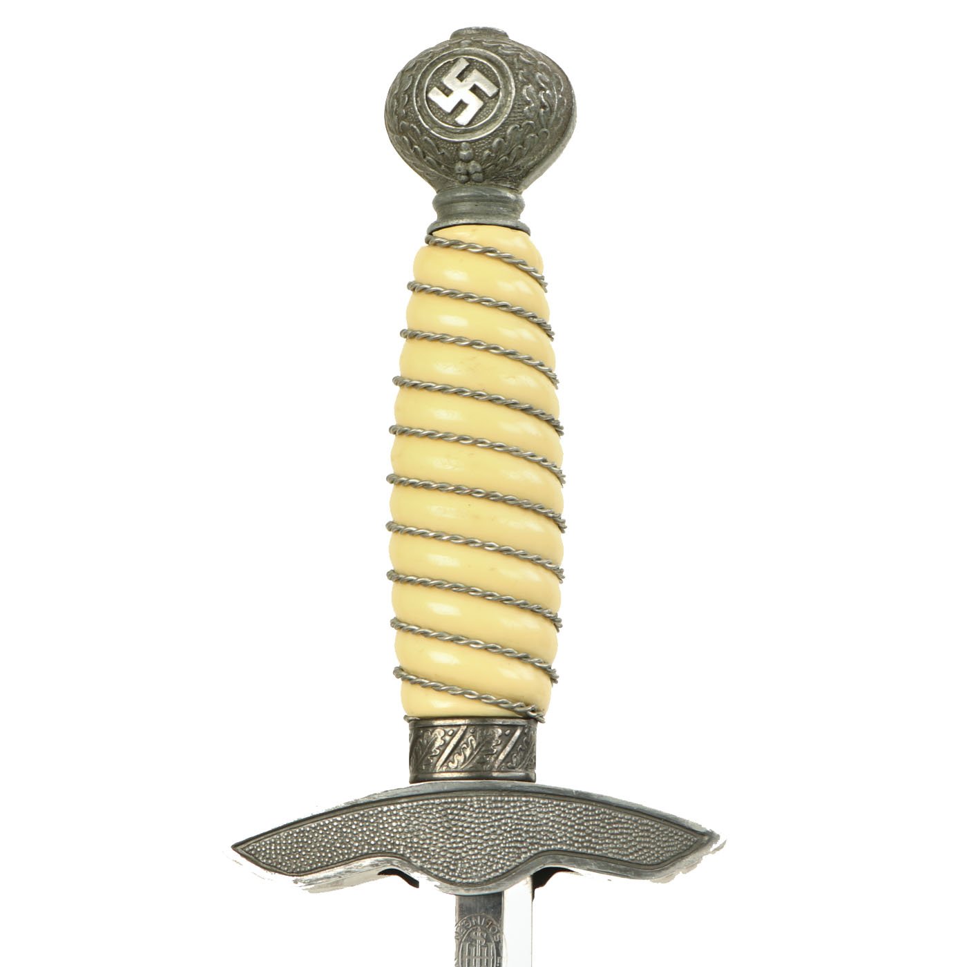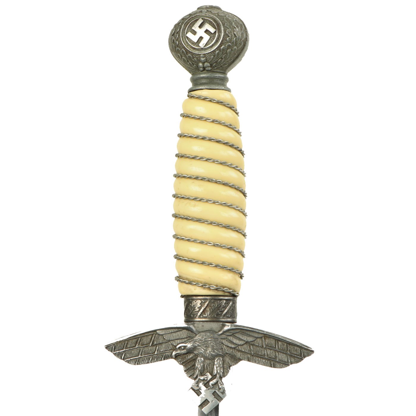 Original Item: Only One Available. This is a great example of a mid-war production 2nd Model Luftwaffe dagger. It is a fine Solingen-Produced example made by the well known firm of E. & F. Hörster. The celluloid grip of this dagger is a nice ivory color, which has not faded to orange or brown like so many do. It has a nice slightly tapered shape, and is tightly wrapped with twisted wires. There is no cracking we can see, just some scuffs and stains.