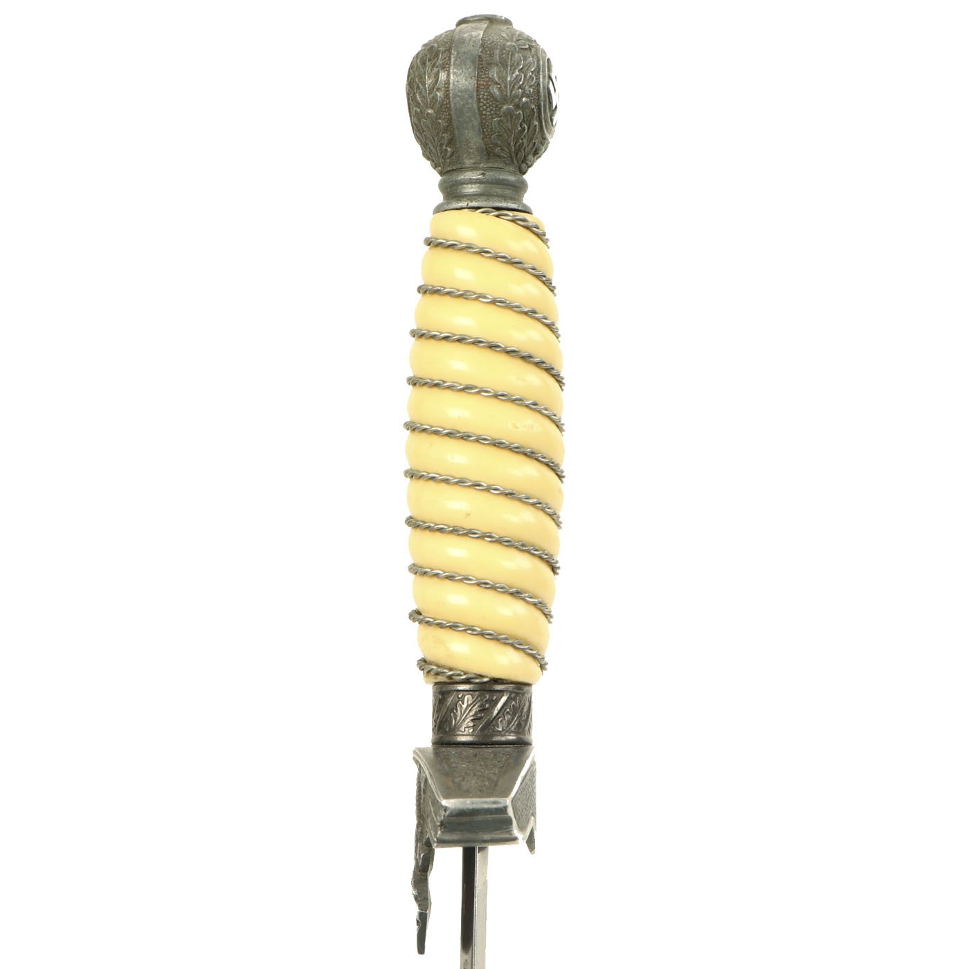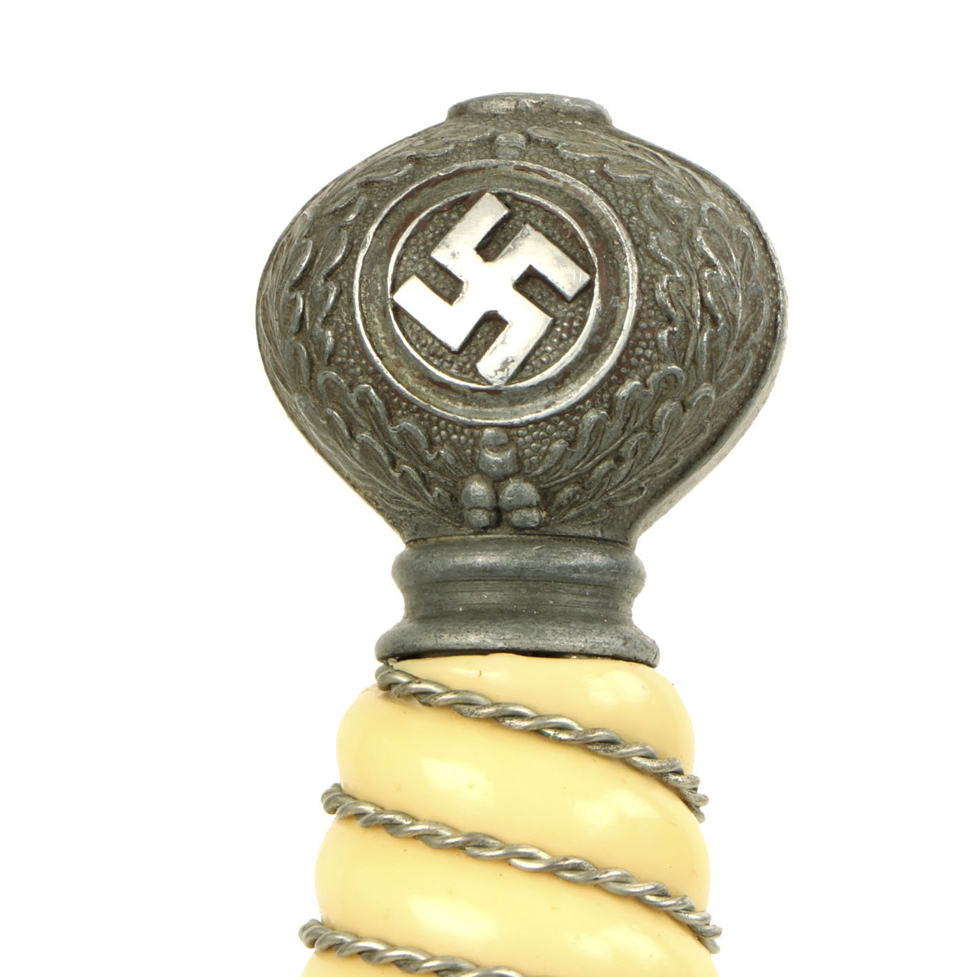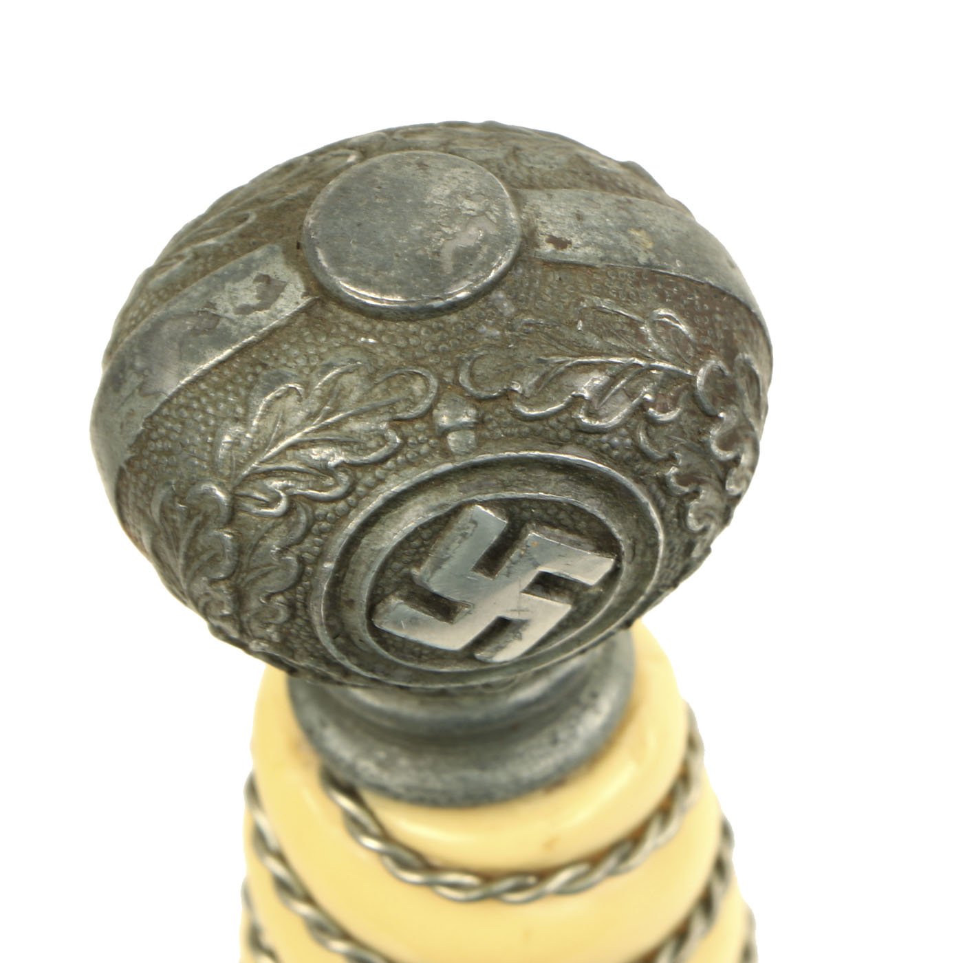The blade on this example is not nickel plated, which is common for later produced blades. The reverse ricasso of this dagger is acid etched with maker name E. & F. HÖRSTER / SOLINGEN in an oval "lozenge" around the company's trademark downward pointing sword piercing interlocking HHS initials. E. & F. Hörster & Co Gmbh, is a well-known maker from Solingen, the famous "City of Blades" in Western Germany, which marketed many fine edged weapons. Originally founded in 1850 as "Friedrich Hörster" in 1850, the company was renamed to E. & F. Hörster in 1870 at the behest of Friedrich Emil & Fritz Hörster. The firm lasted long after WWII, finally being declared insolvent in 1996. For more information please see GERMAN KNIFE AND SWORD MAKERS by J. Anthony Carter.