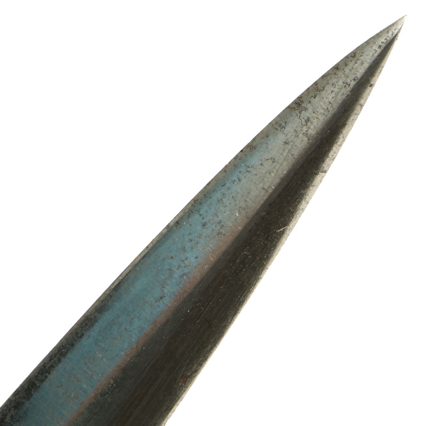 The blade is in very good condition, and bright, though it has been polished and cleaned over the years, removing all of the factory cross grain. There is some runner wear and areas of light staining. The tip is as straight as any we have ever seen, and the edge is still in the correct factory unsharpened state.