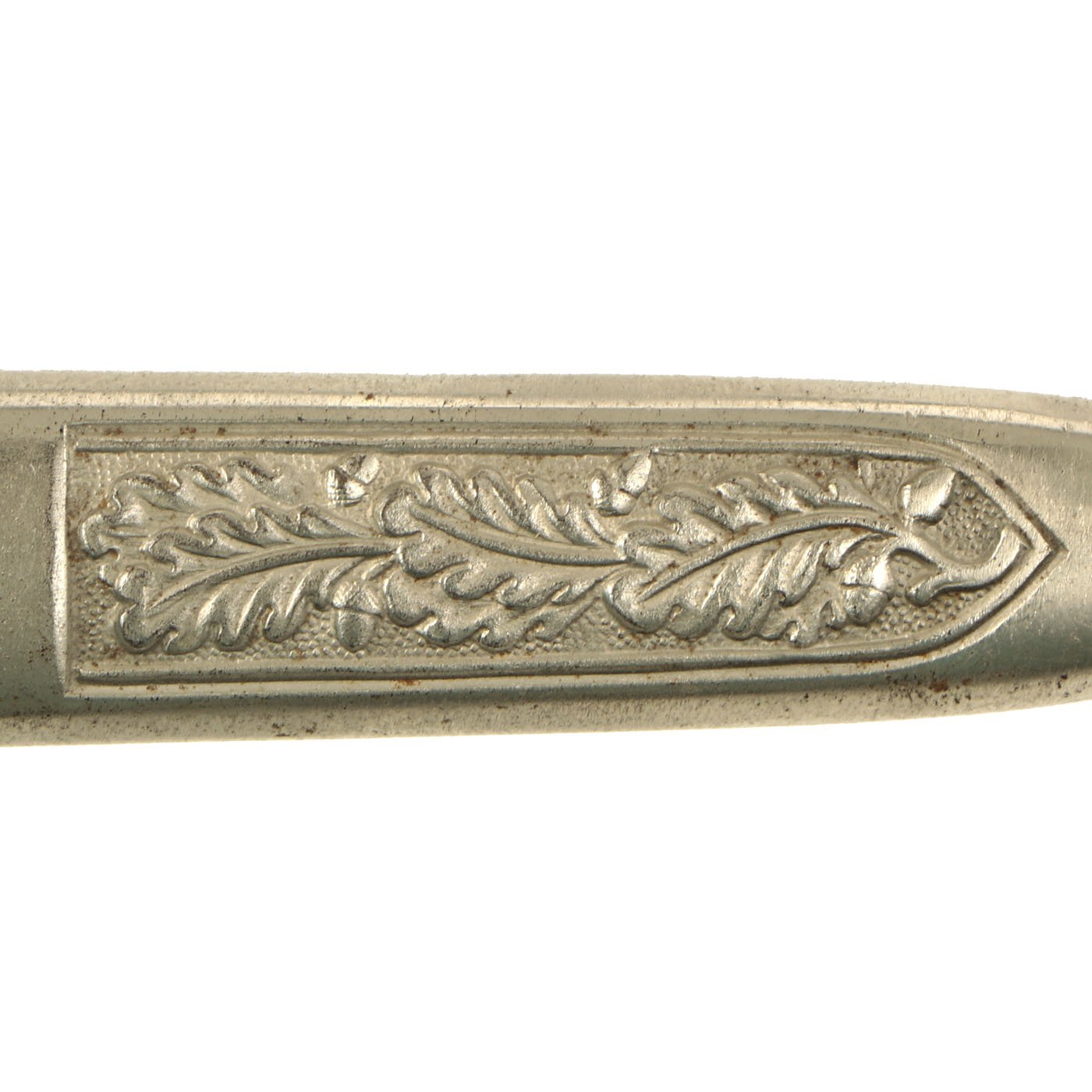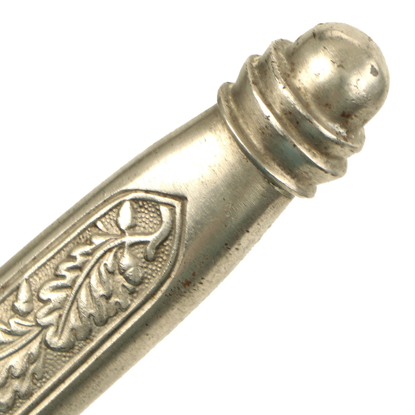 The hilt mounts are in similar condition with a lovely patina of age. The pommel is very good and still shows most of the original detail. The "mobile" swass on both sides are clear and the oak leaves around them are raised out and heavily hand enhanced. The pommel appears to be solid aluminum, which was given a dark finish overall, with the raised areas polished.. It does have a bit of wear around the edges.