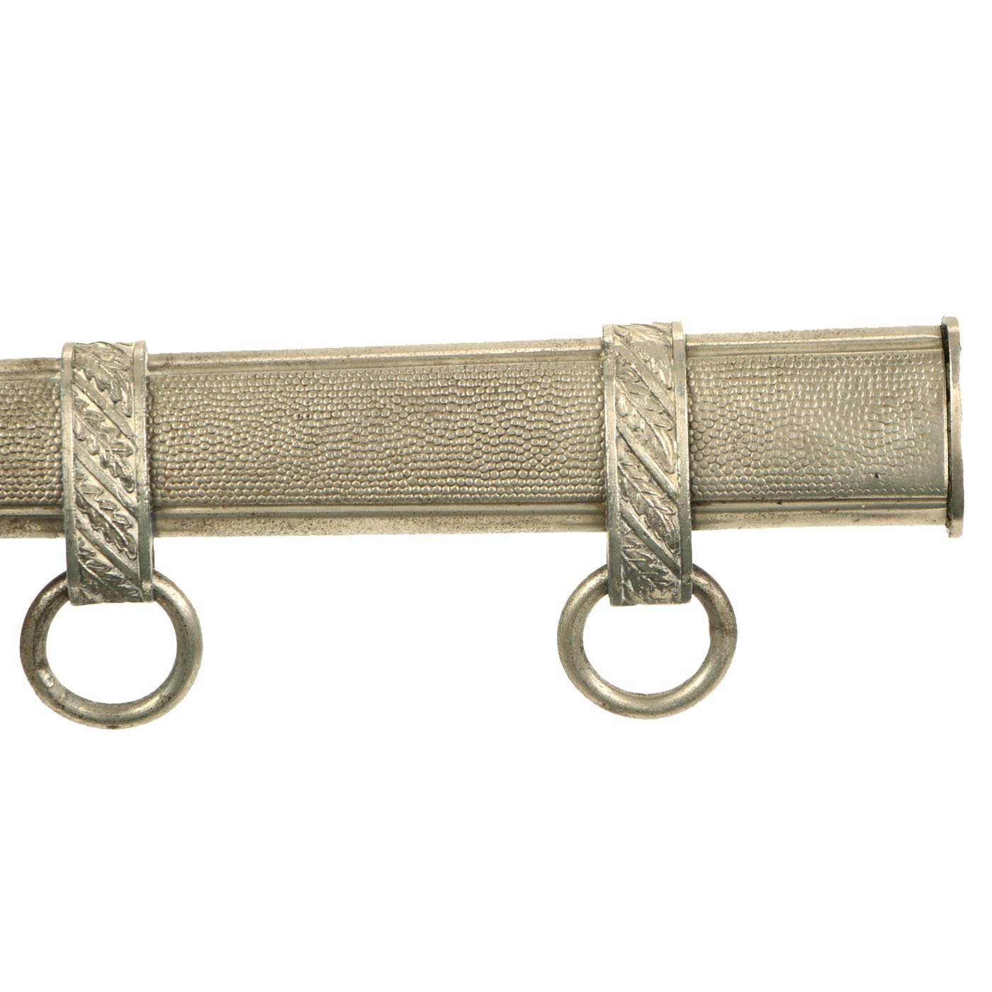 This steel scabbard is in very good condition, dent free and with a lot of the original plating intact. The hanger bands are plated zinc alloy, and are well defined and have hand enhanced oak leaves tipped at a 45 degree angle. The throat is retained by a single flathead screw on the rear, and is the narrower version seen. The screws do not appear to have been messed with at all.