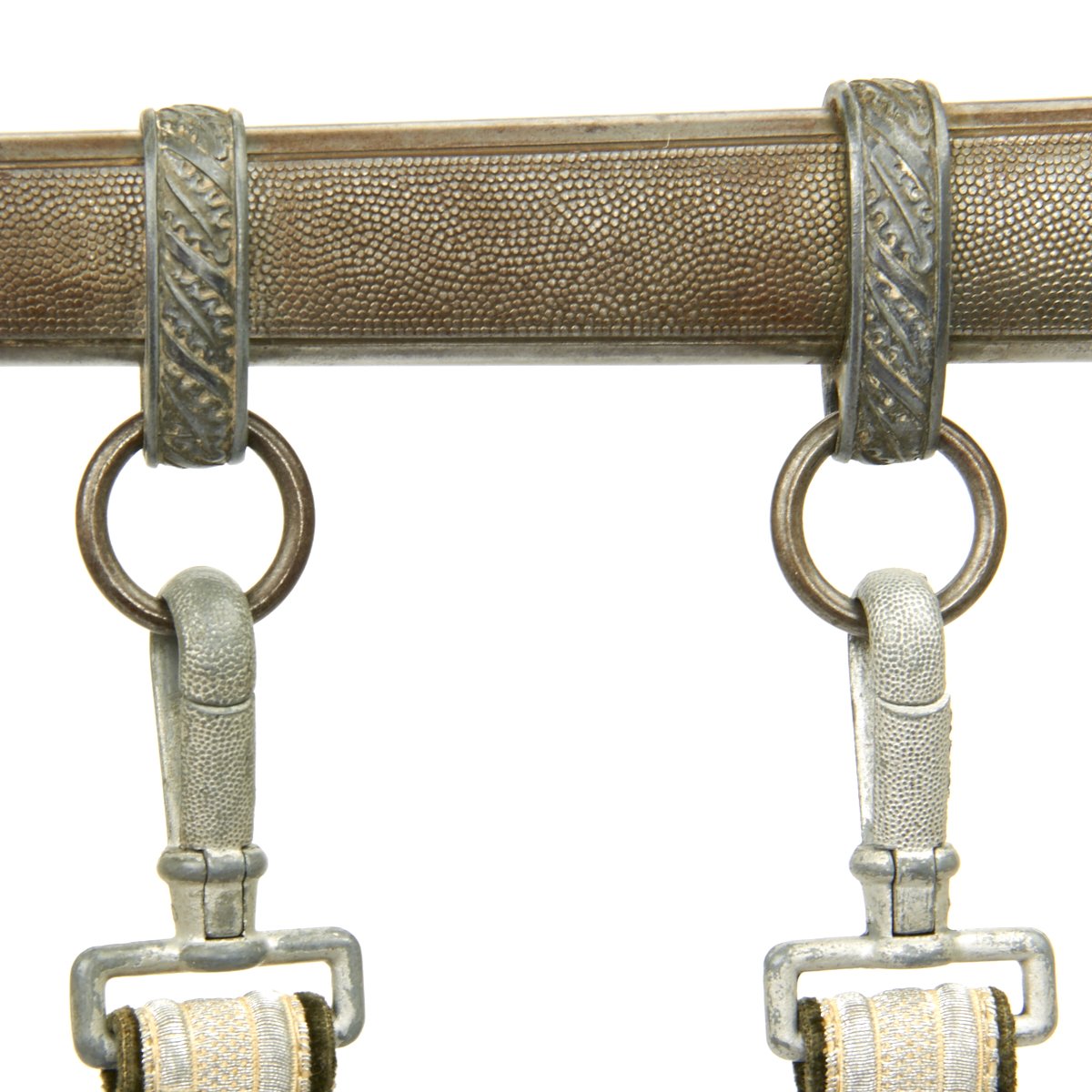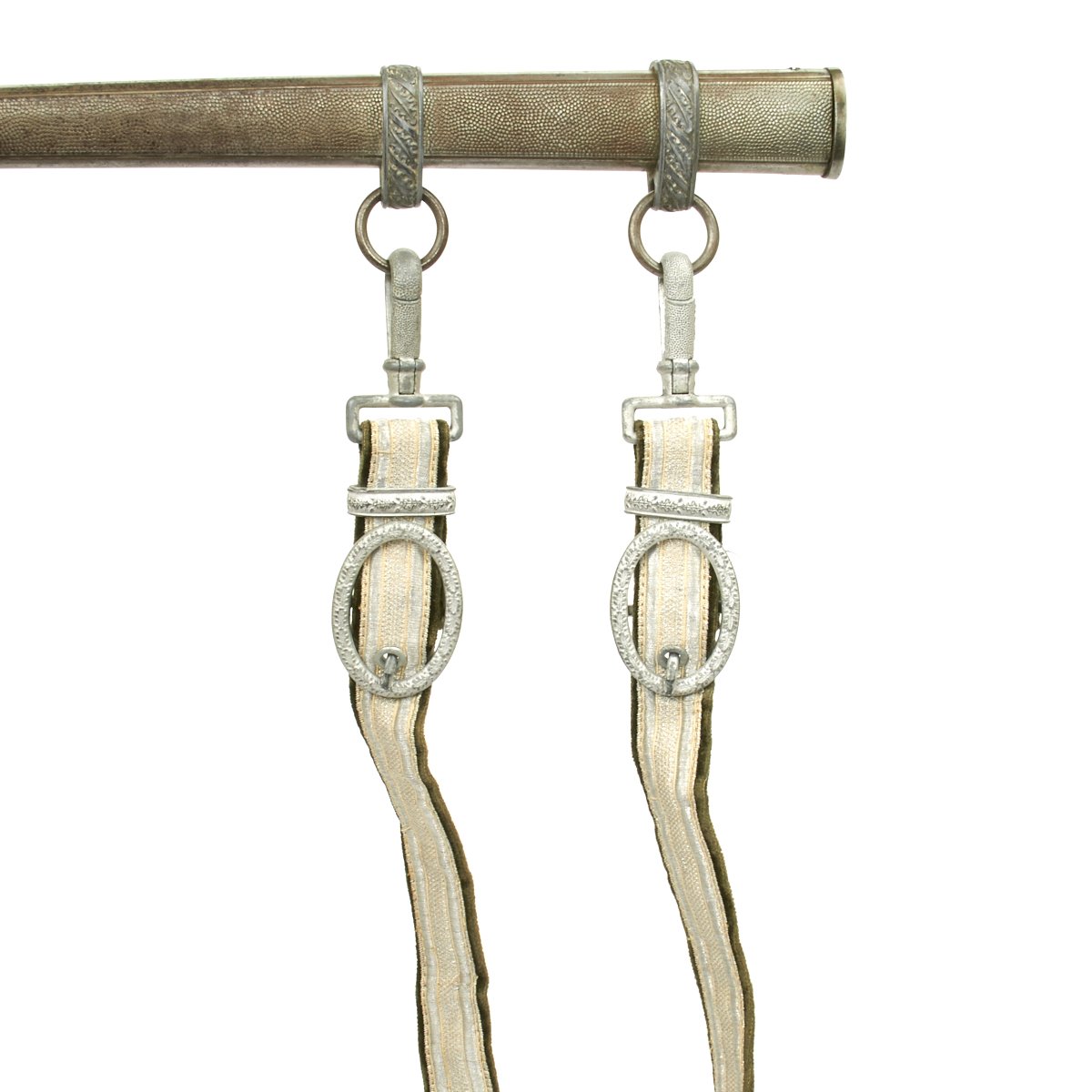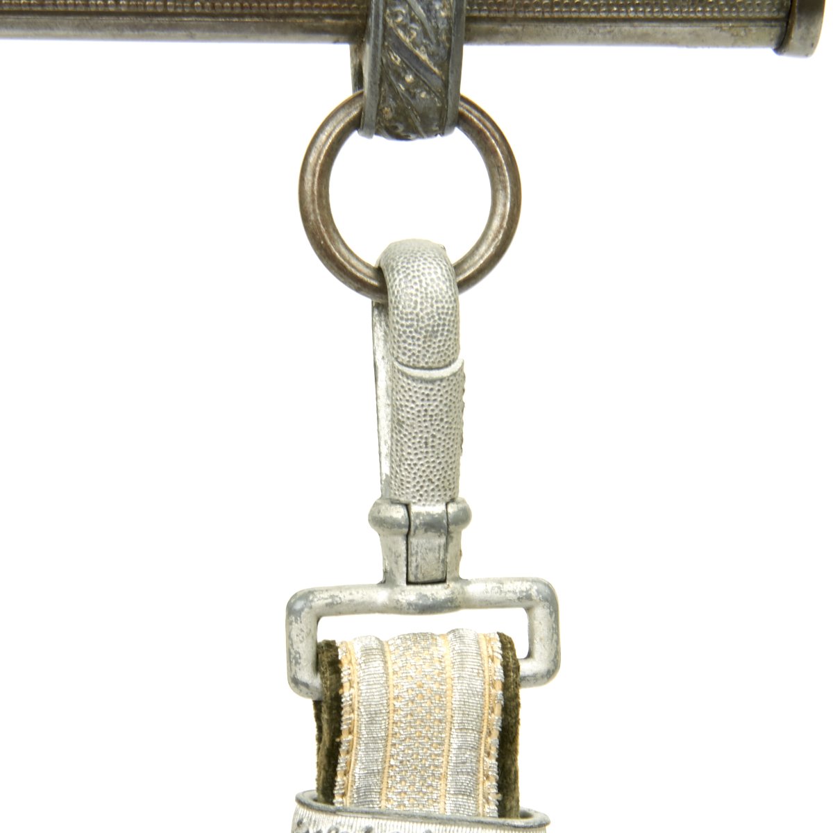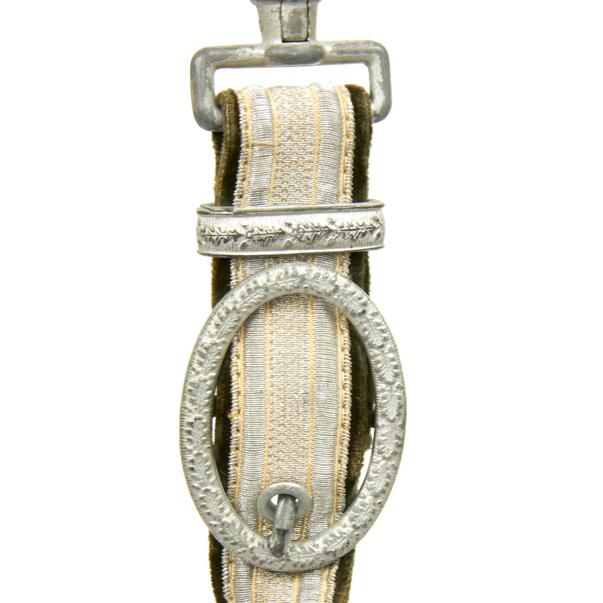 Attached to the scabbard is the original set of hanging straps. These straps are bright in both the brocade and the reverse velvet. The hardware consists of a plain, unmarked snap clip with matching gray rectangular buckles and slides decorated with oak leaves. The snaps are the push-in type and also bright with 90% finish remaining. The belt hanging hook as broken away and been lost.