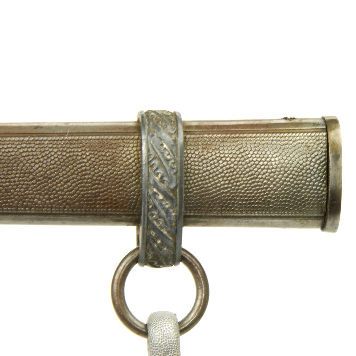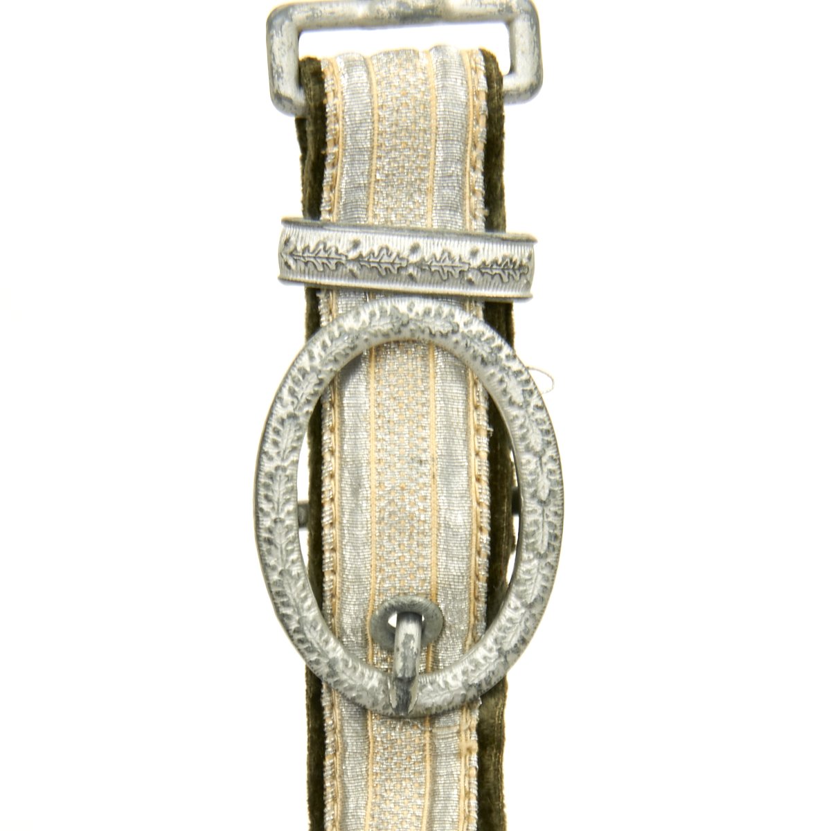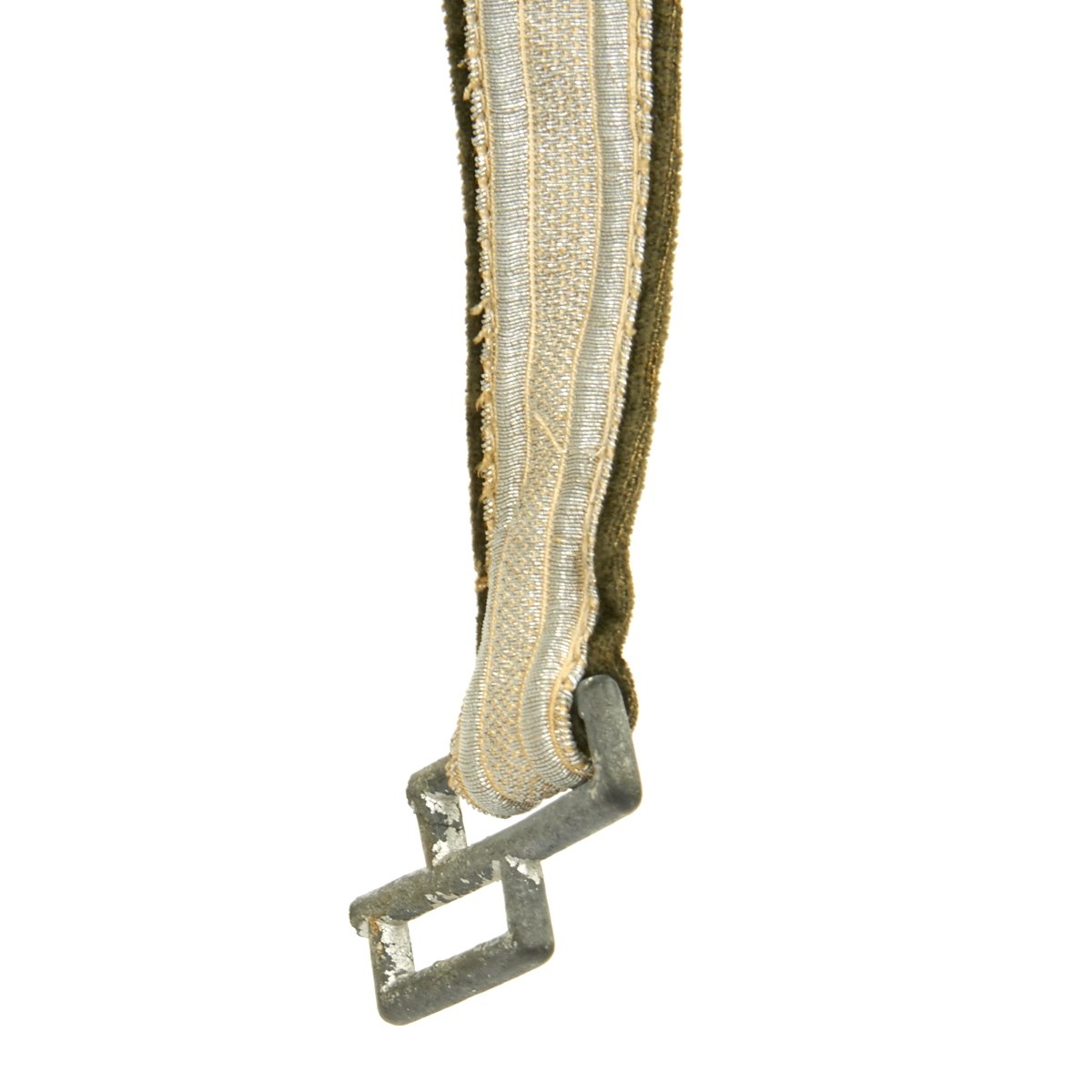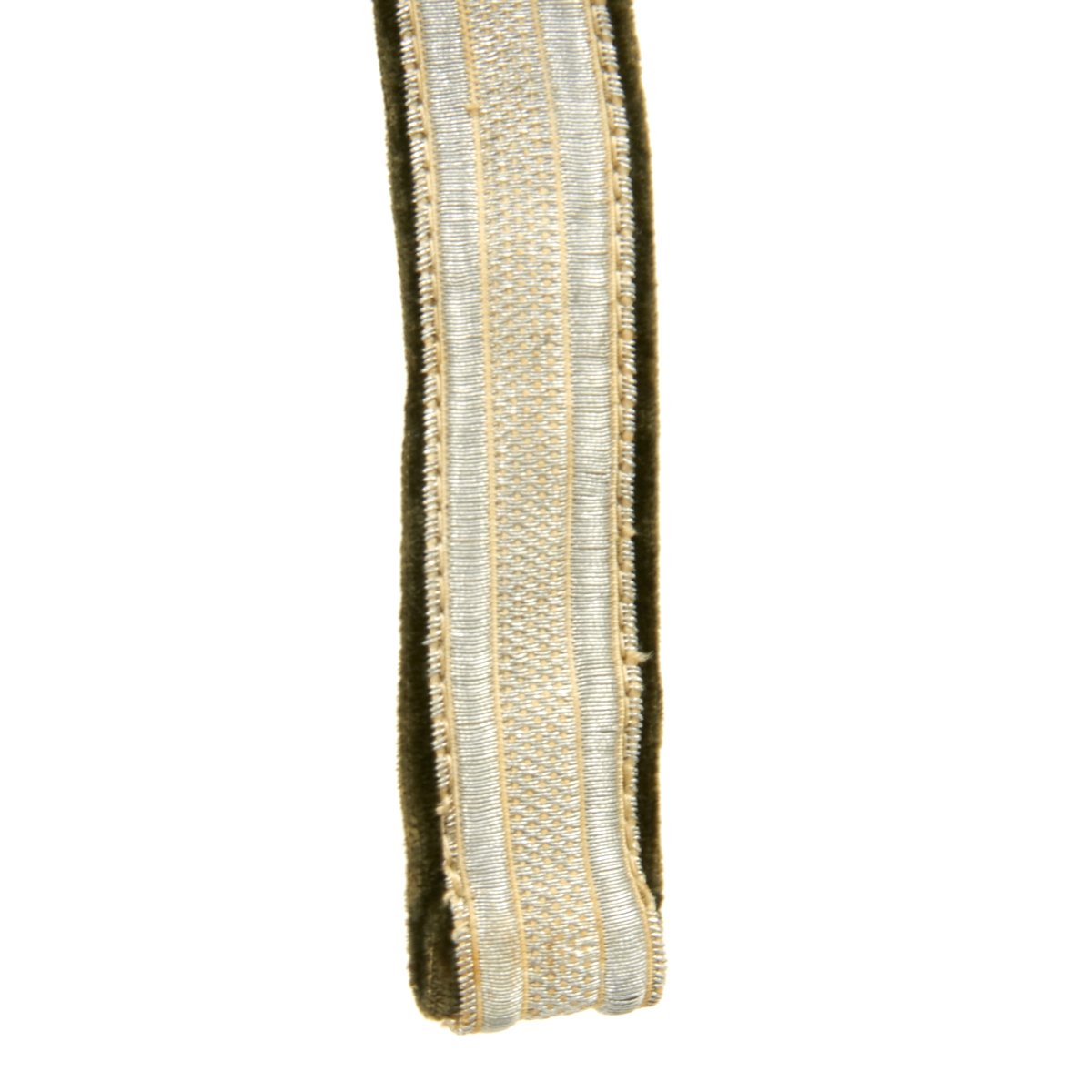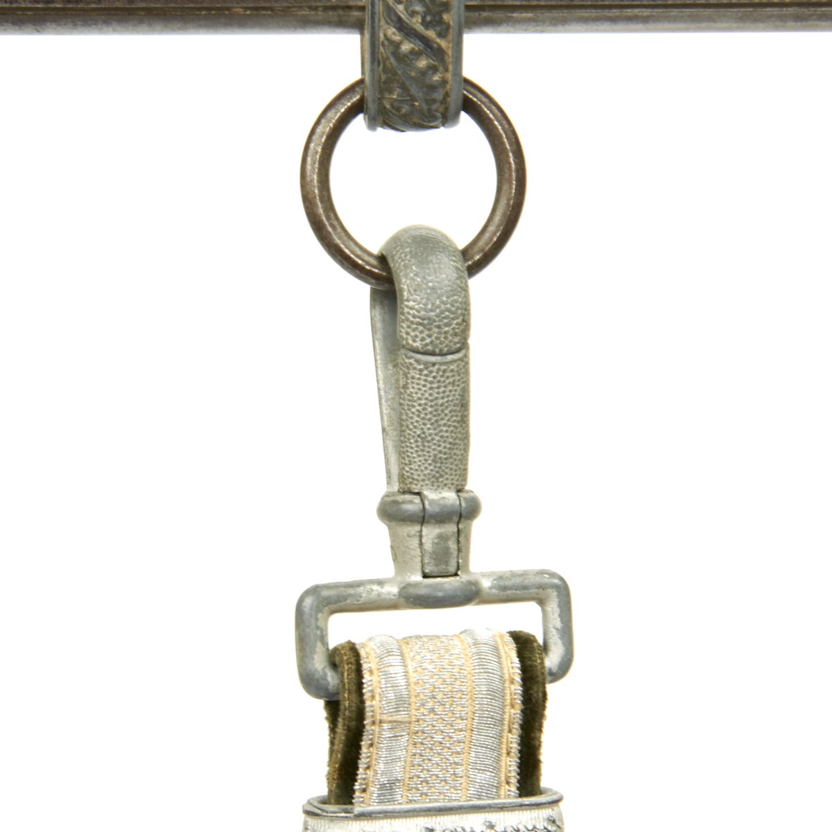Attached to the scabbard is the original set of hanging straps. These straps are bright in both the brocade and the reverse velvet. The hardware consists of a plain, unmarked snap clip with matching gray rectangular buckles and slides decorated with oak leaves. The snaps are the push-in type and also bright with 90% finish remaining. The belt hanging hook as broken away and been lost.