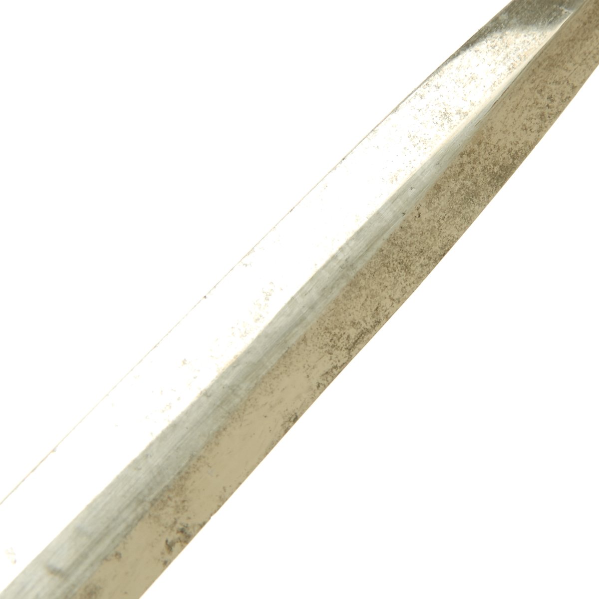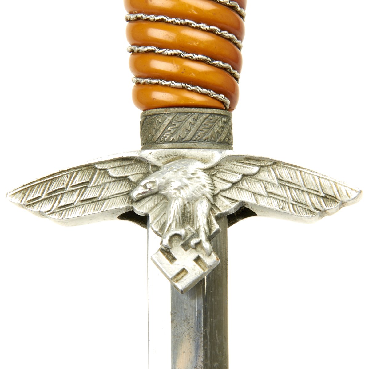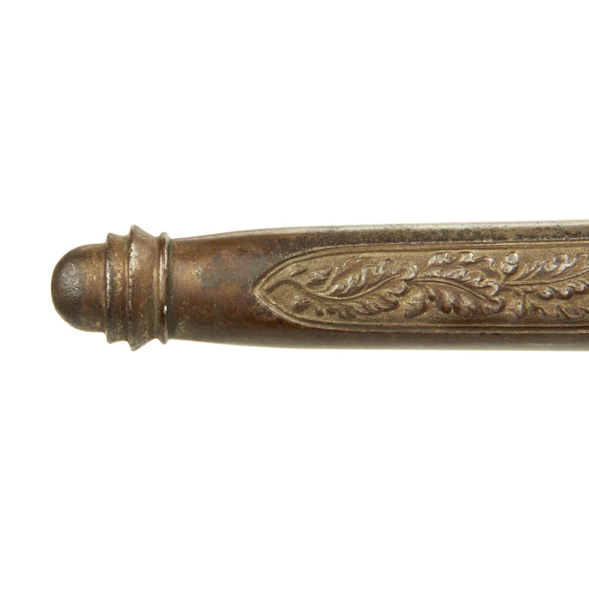 The crossguard is also classic SMF. The fine guard eagle flies to the viewer’s left and retains very fine detail to his feathering, talons and swas. The reverse panel retains nearly 90% of the original airplane gray darkening over the pebbled surface. The upper quillon arms have a panel of finely engraved oak leaves and acorns.