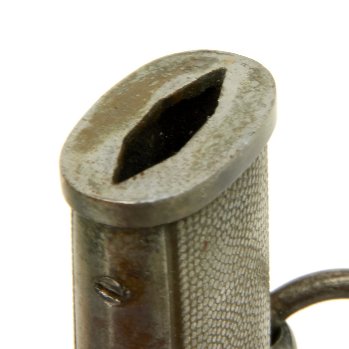 The scabbard is textbook SMF, with the airplane gray finish intact on the surface. The pebbled panels are nice and crisp. The carrying bands are the contrasting aluminum types only seen on pieces from SMF. The scabbard throat is in natural metal, retained by a pair of headless side screws.