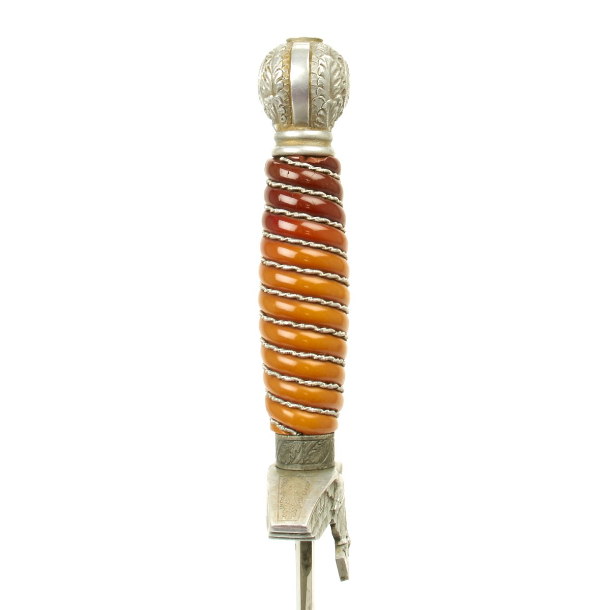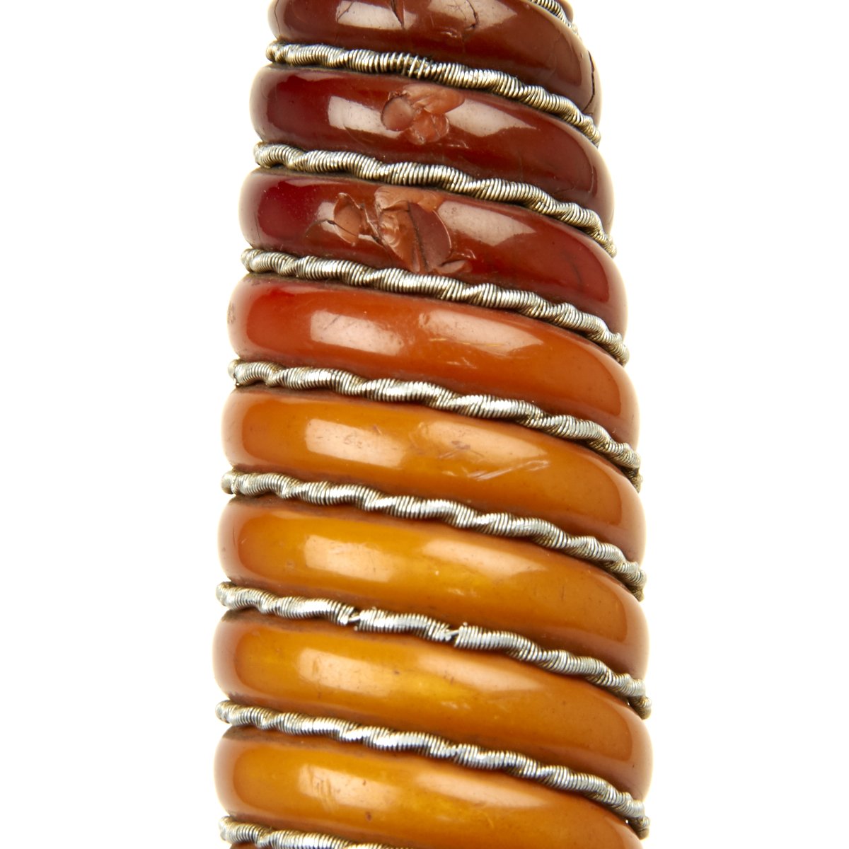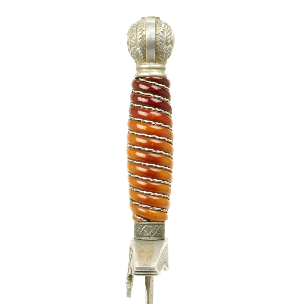 The grip of this dagger is choice shade of tangerine orange with a deepening to pumpkin at the upper part. It is in wonderful condition with a small surface chip on the reverse and tightly wrapped with springy aluminum wire.