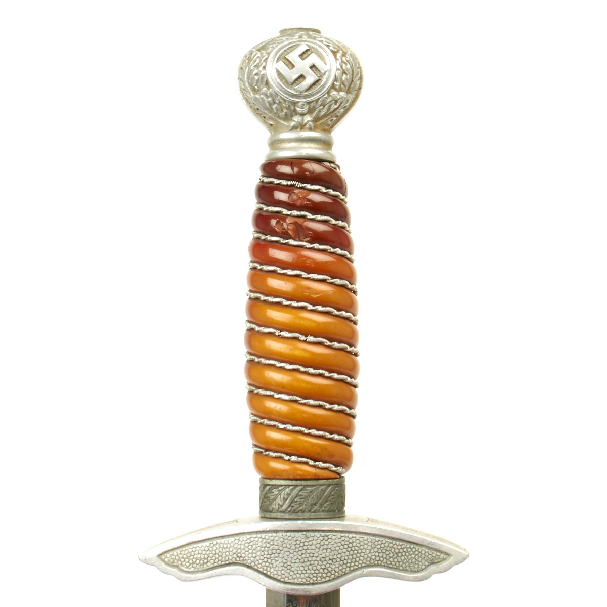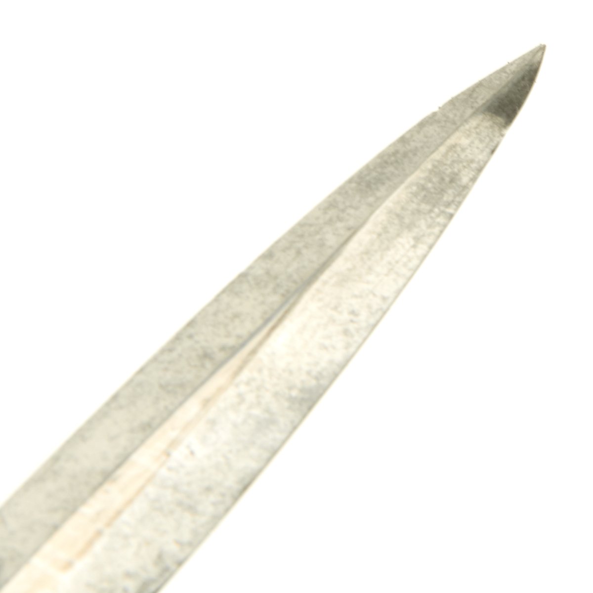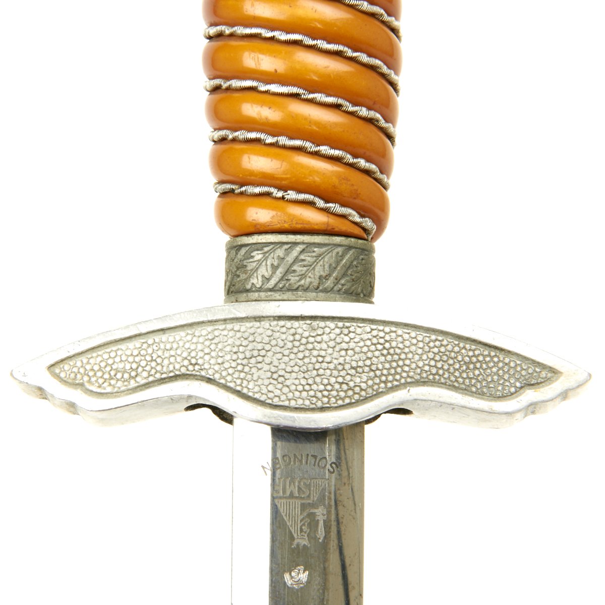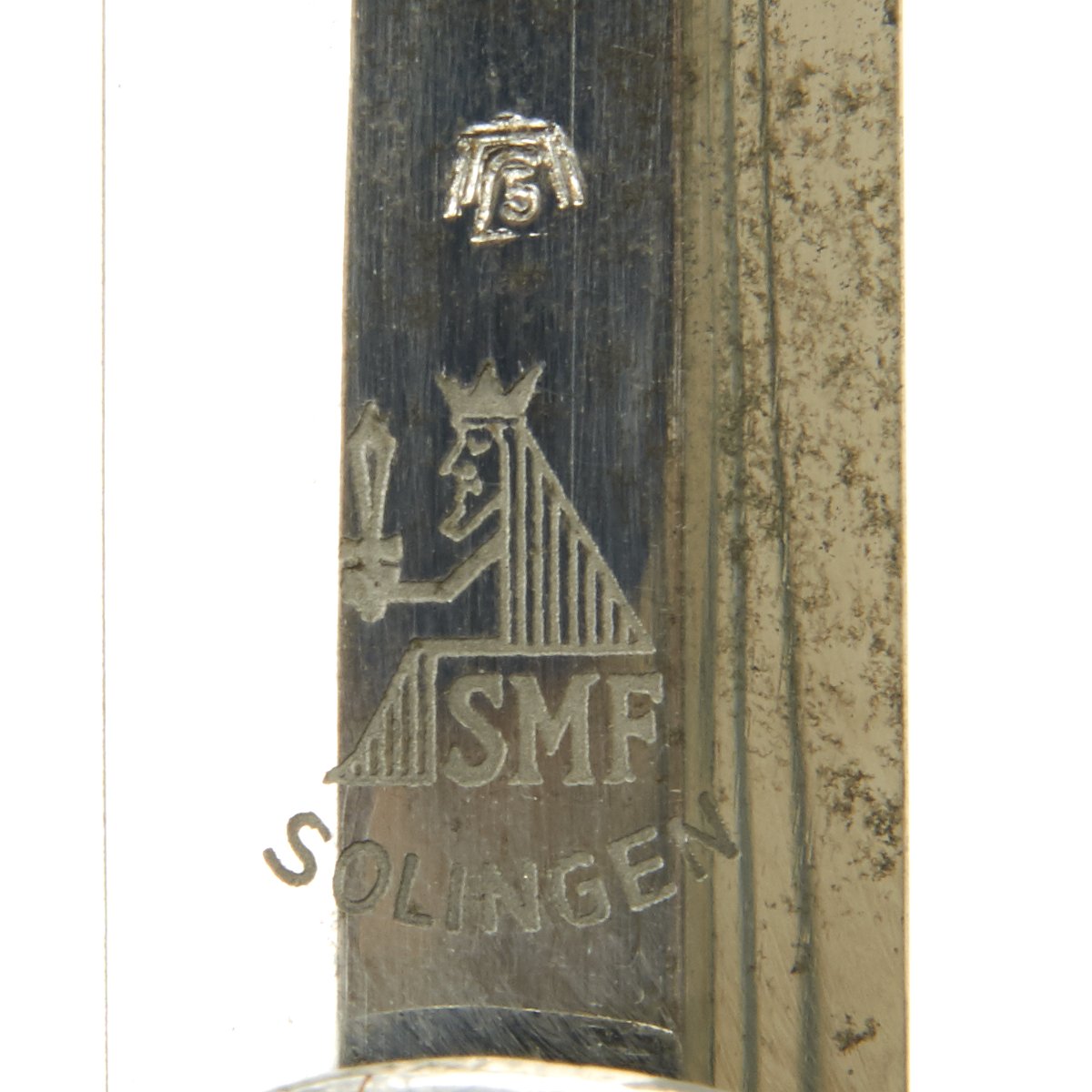 The blade of this dagger is a real beauty, with a highest quality nickel-plated finish. It is very bright with spots of minor discoloration, a mirror bright surface, and a needle-like tip. The reverse ricasso is deeply stamped with a stickbird waffenamt marked 5 in his belly. Below the waffenamt is the classic SMF Seated King trademark.