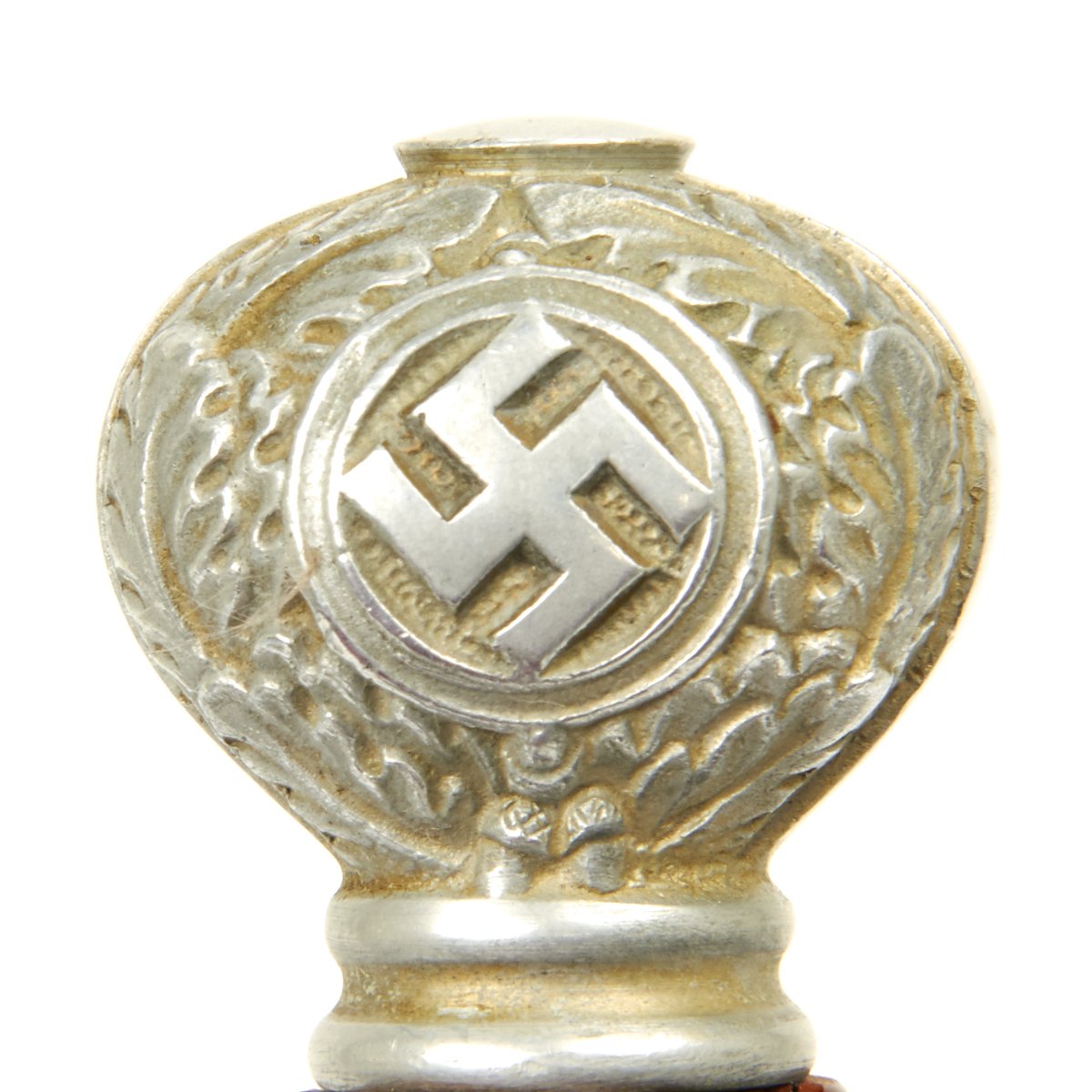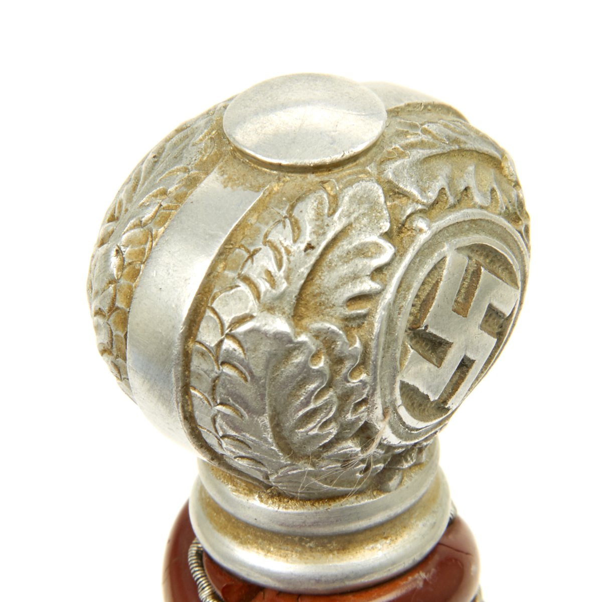 The pommel is the classic SMF type. This pommel has perfect oak leaves around the 100% gilded swass on both sides. These oak leaves have fine hand work in the areas where they meet the center ridge of the pommel.