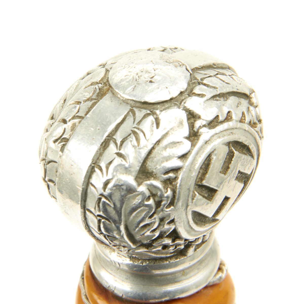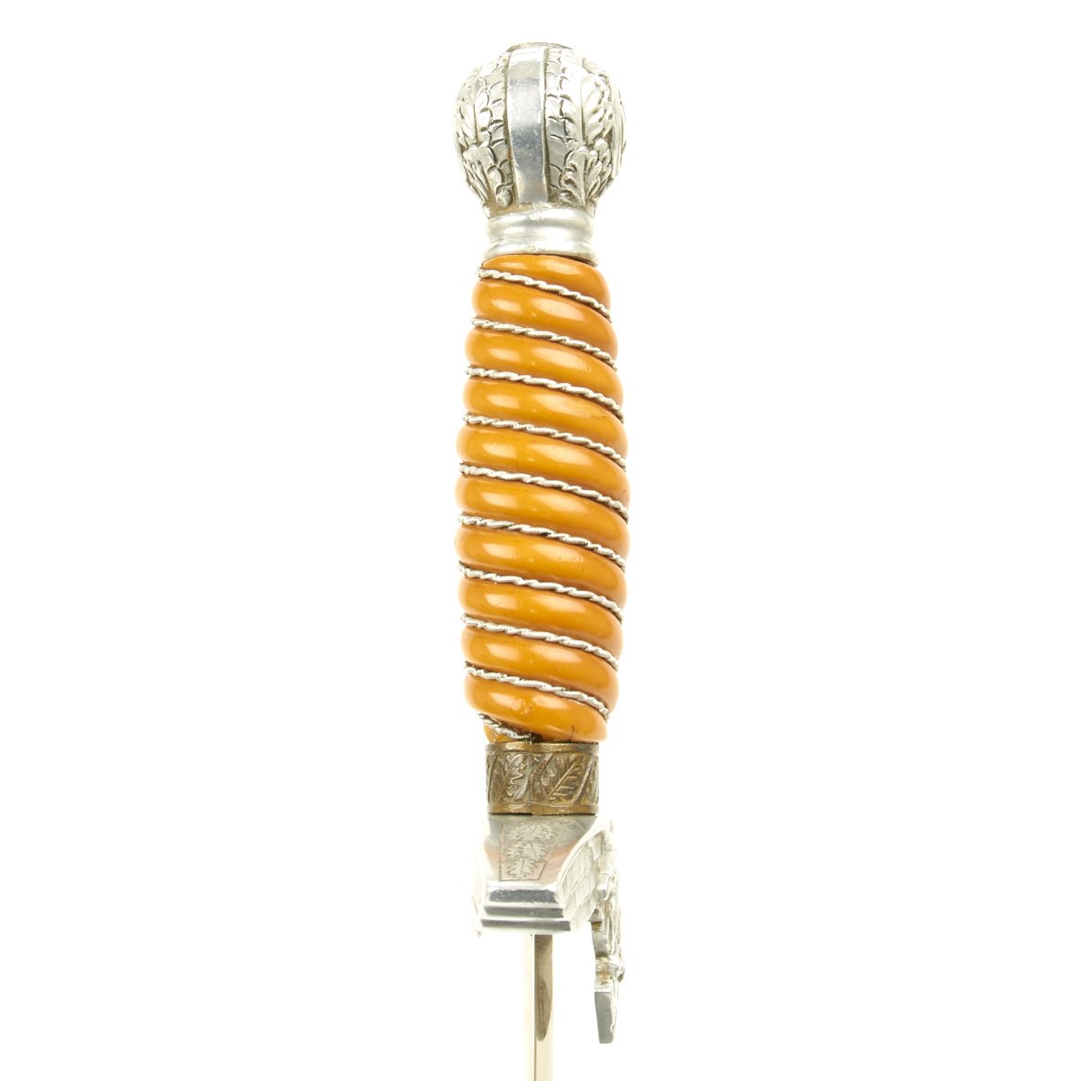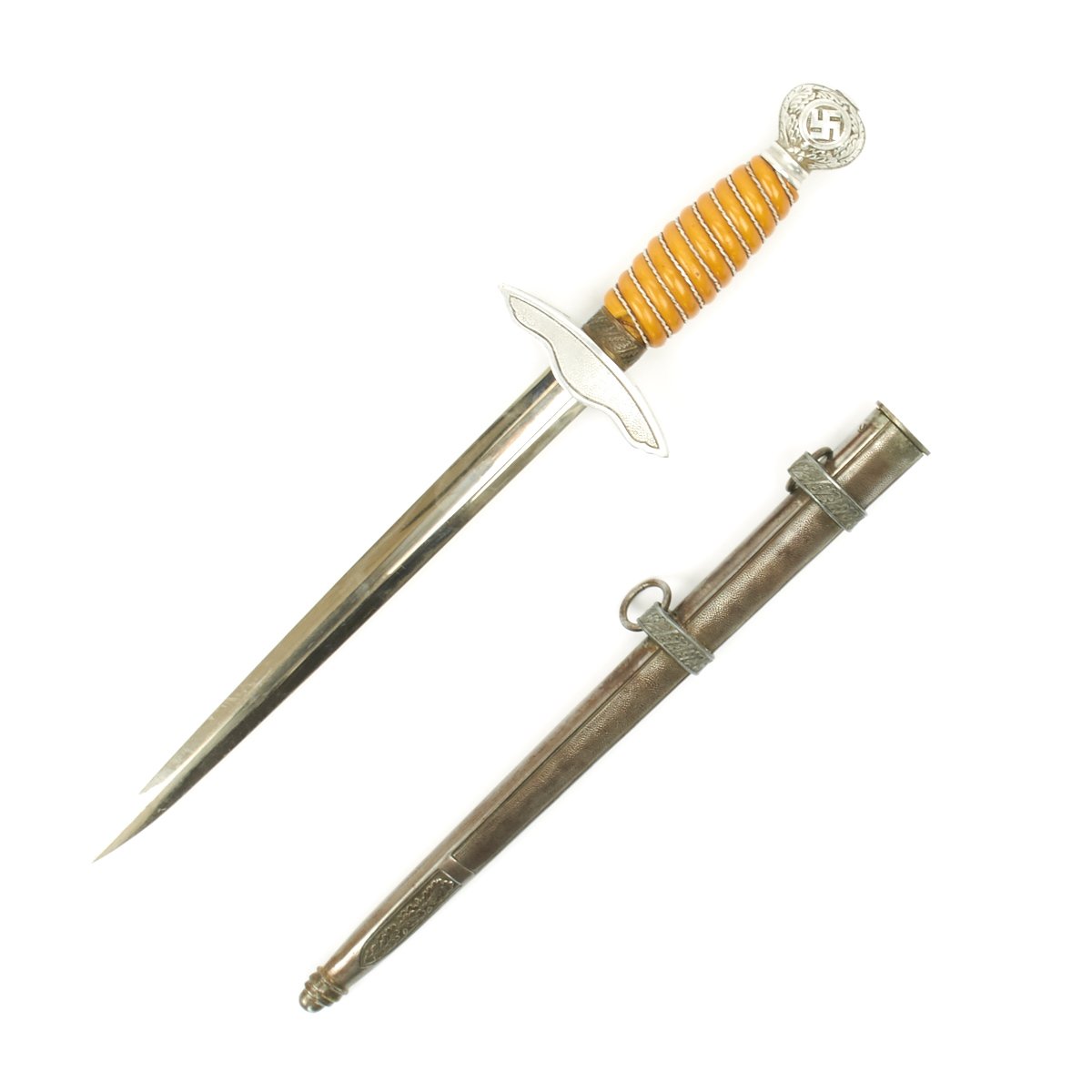 Original Item: Only One Available. The grip of this 2nd Model Luftwaffe Dagger is a nice orange and in fine condition. Aside from some cracking at the cross guard end, it is excellent, and is tightly wrapped with twisted brass wire. If you look at the chipped portion, a lighter color can be seen. A beautiful grip here, demonstrating perfectly the amazing transformations nature can affect on a chemically volatile substance like celluloid.