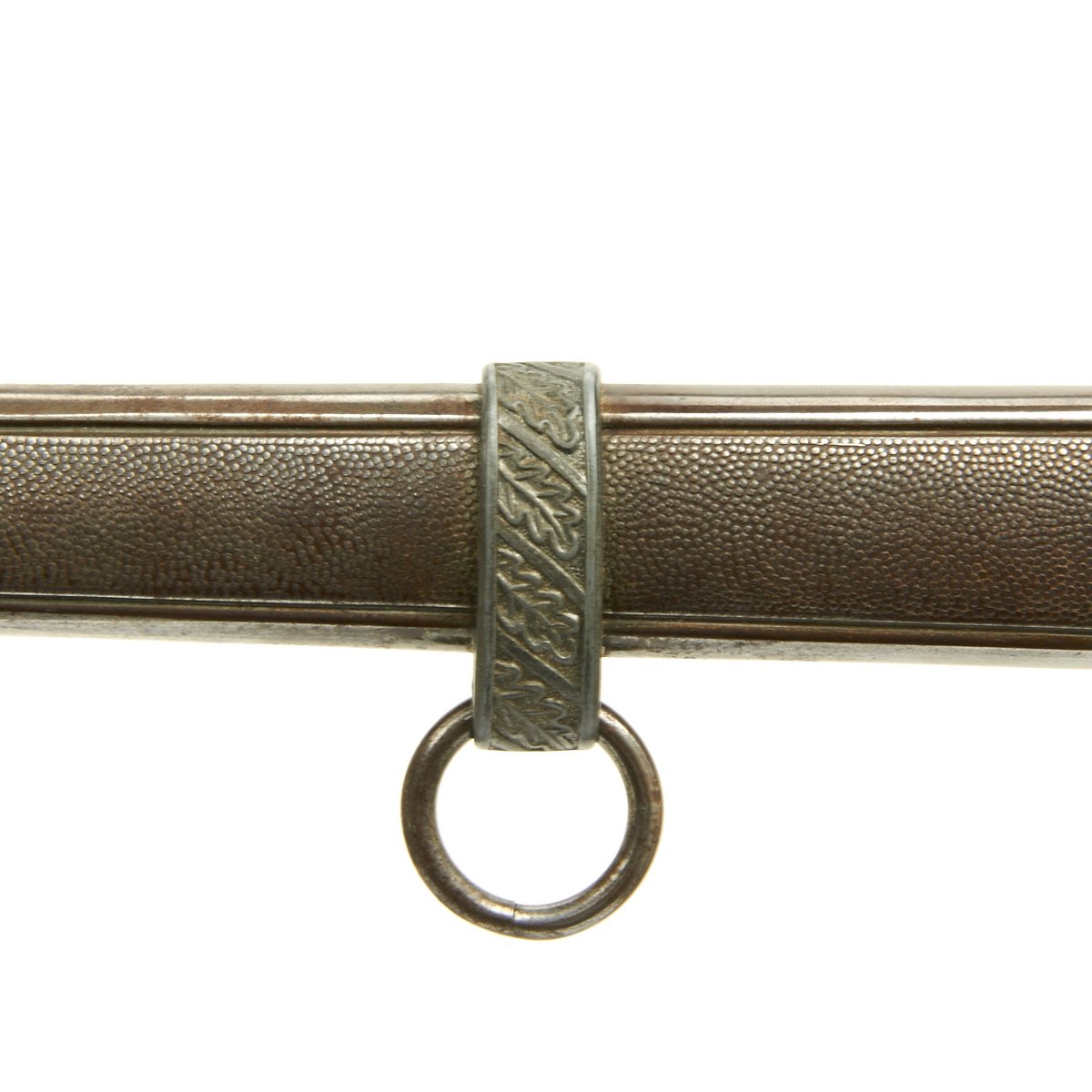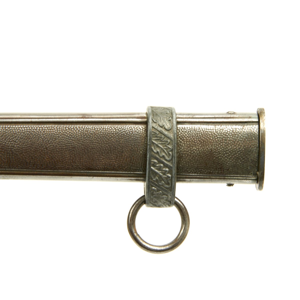 This scabbard is a fine, straight example, with only a few small dents. The original grey finish is mostly gone due to years of thorough cleaning and wear. The bands are well defined and have outstanding hand enhanced oak leaves tipped at a 45 degree angle. The throat is retained by a single steel screw.