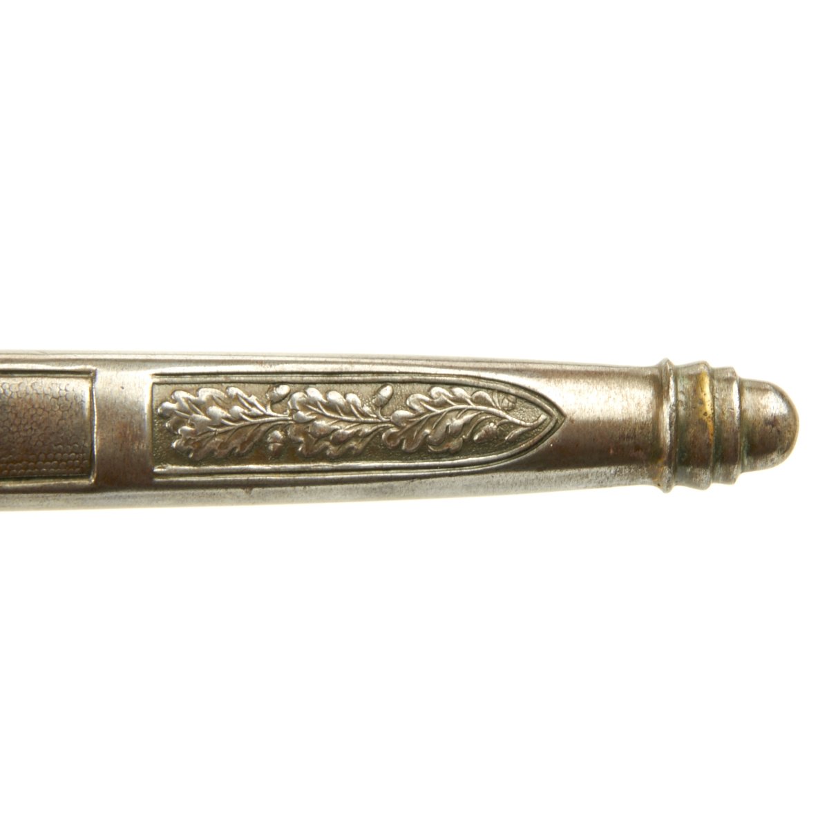 The hilt mounts are similarly great on this dagger. The pommel is crisp and excellent. The swas on both sides is extremely bold, and the oak leaves around it is raised out and heavily hand enhanced. The aluminum pommel also has much of the original factory blackening in the backgrounds.