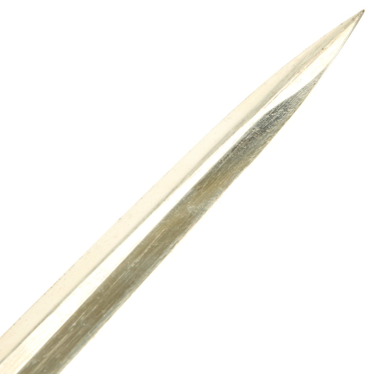 The blade of this example is a nickel-plated type. It still remains nice and bright and is in very good bright condition with a needle-like tip. Almost all of the original nickel plate it still present. The original leather blade washer is in place deep within the recesses of the guard.