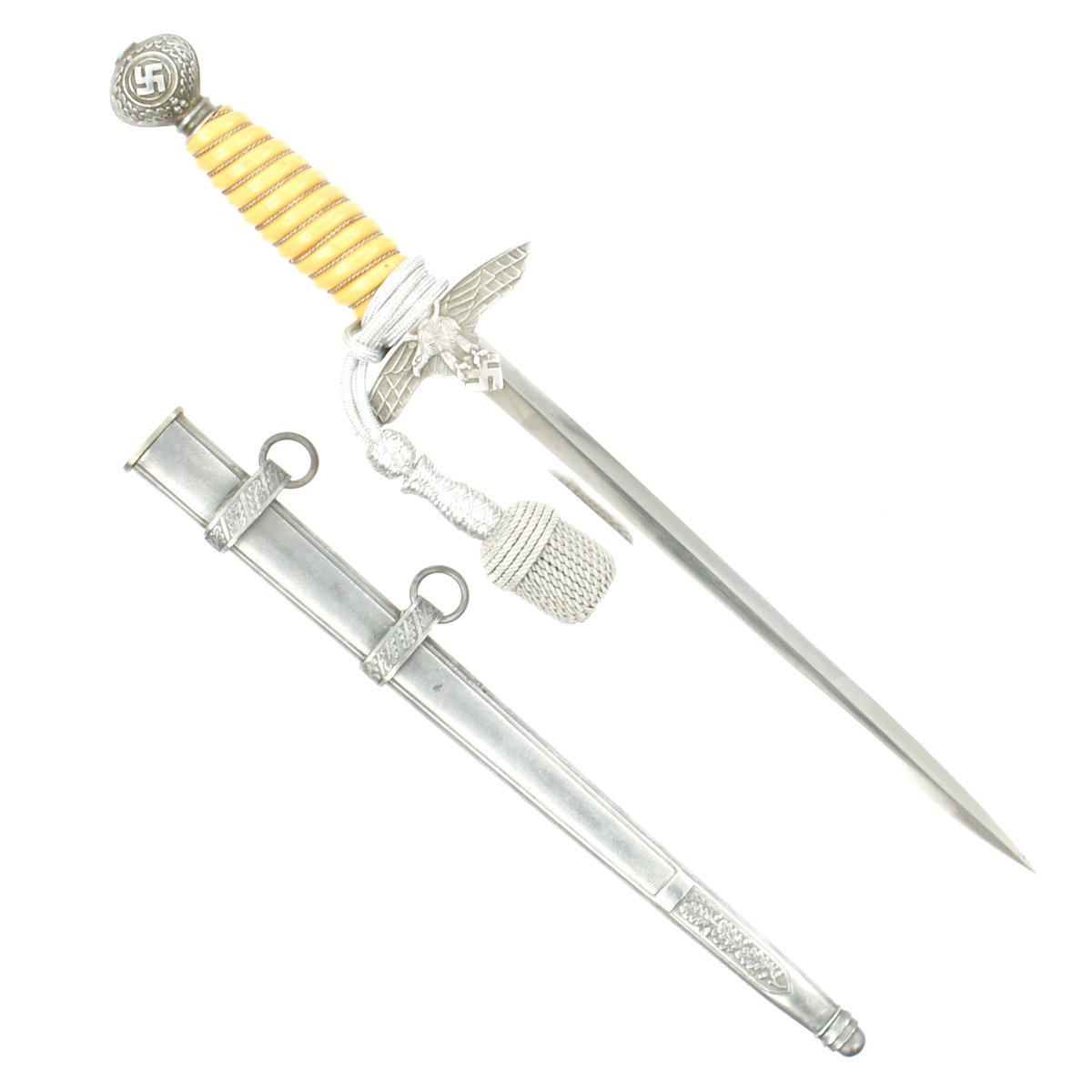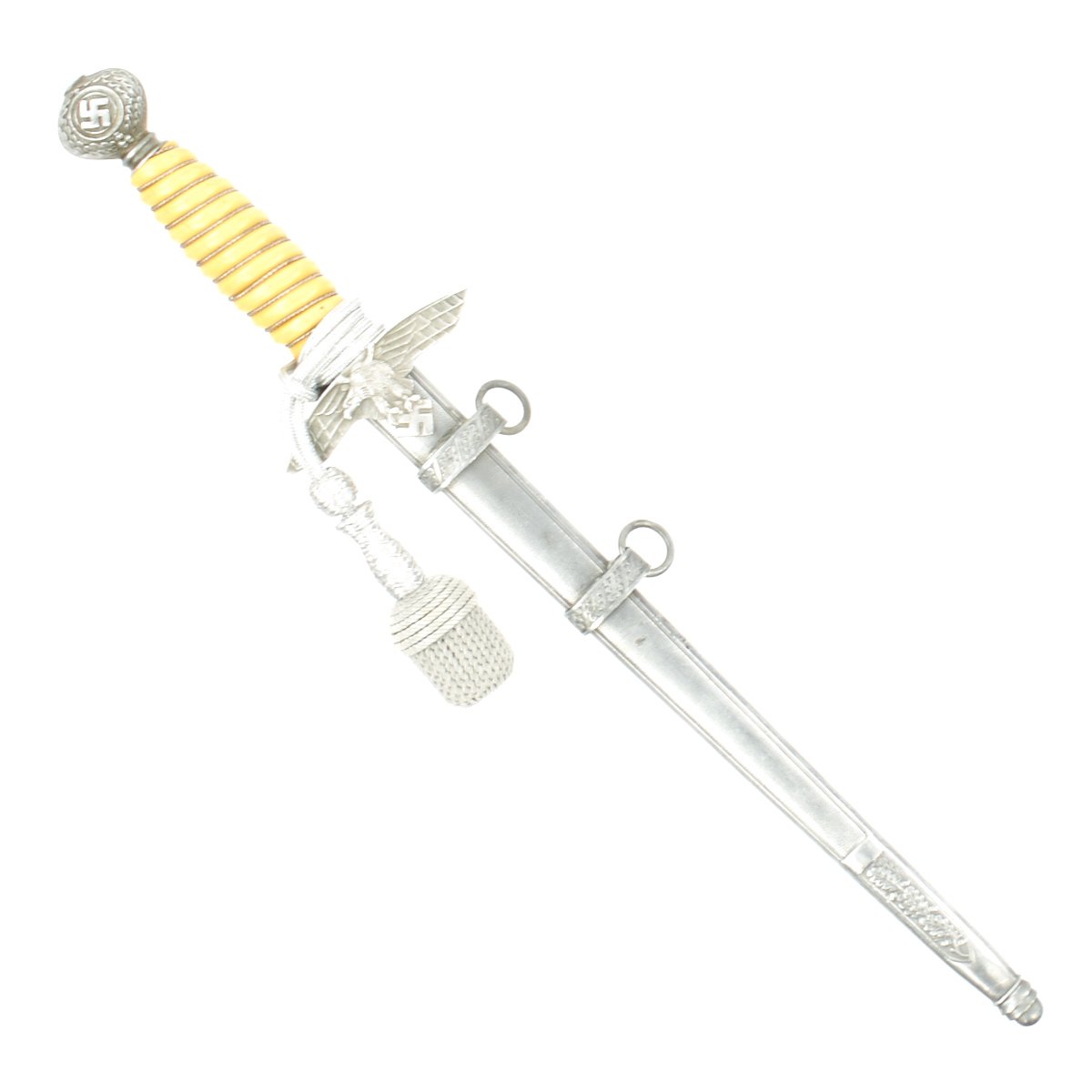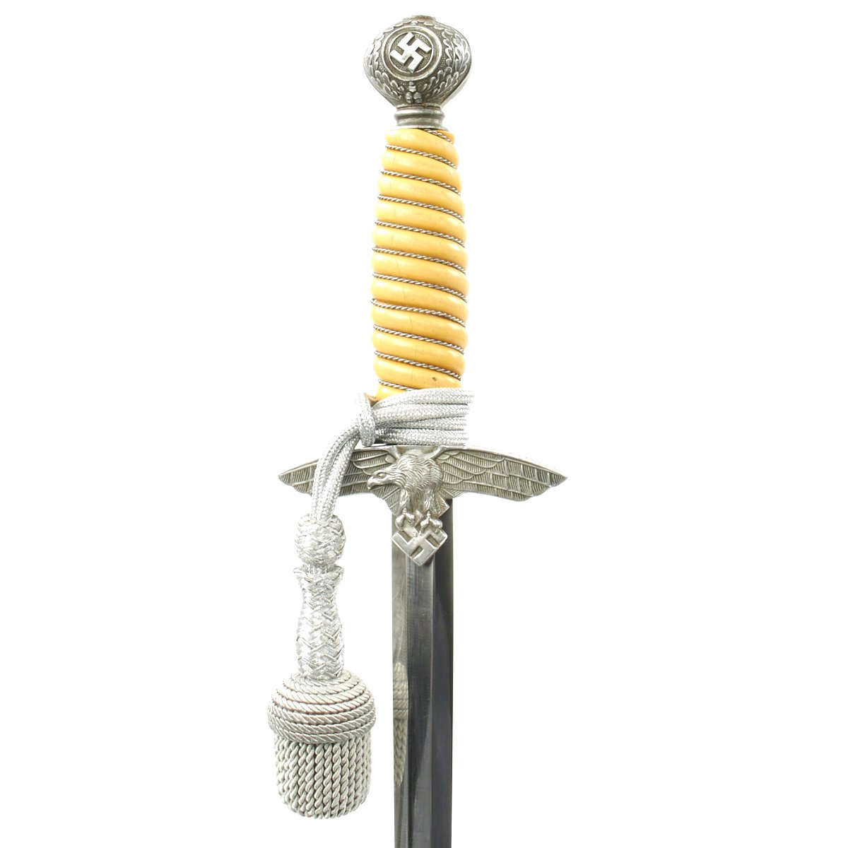 Original Item: Only One Available. This is a great example of a late-war production 2nd Model Luftwaffe dagger. It is not maker marked, which is not unusual for later war examples. The celluloid grip of this dagger is a nice yellowed ivory color, and remains in good condition throughout, with some scratches and wear. It has a nice slightly tapered shape, and is tightly wrapped with twisted silver-colored wire.