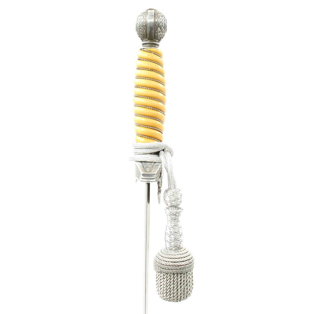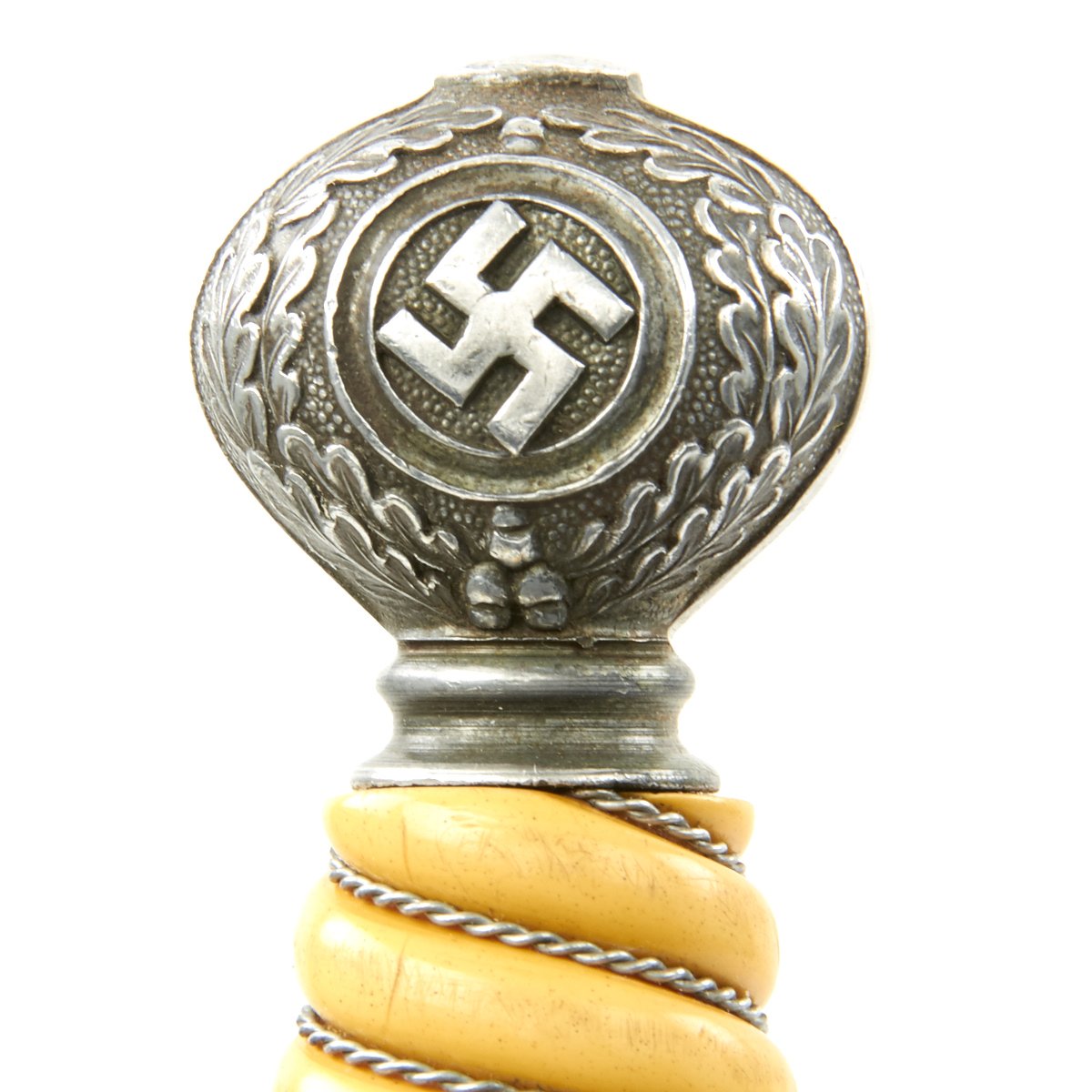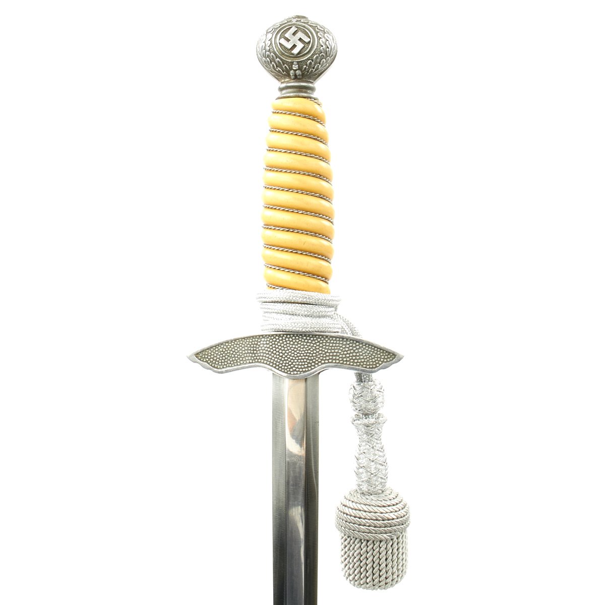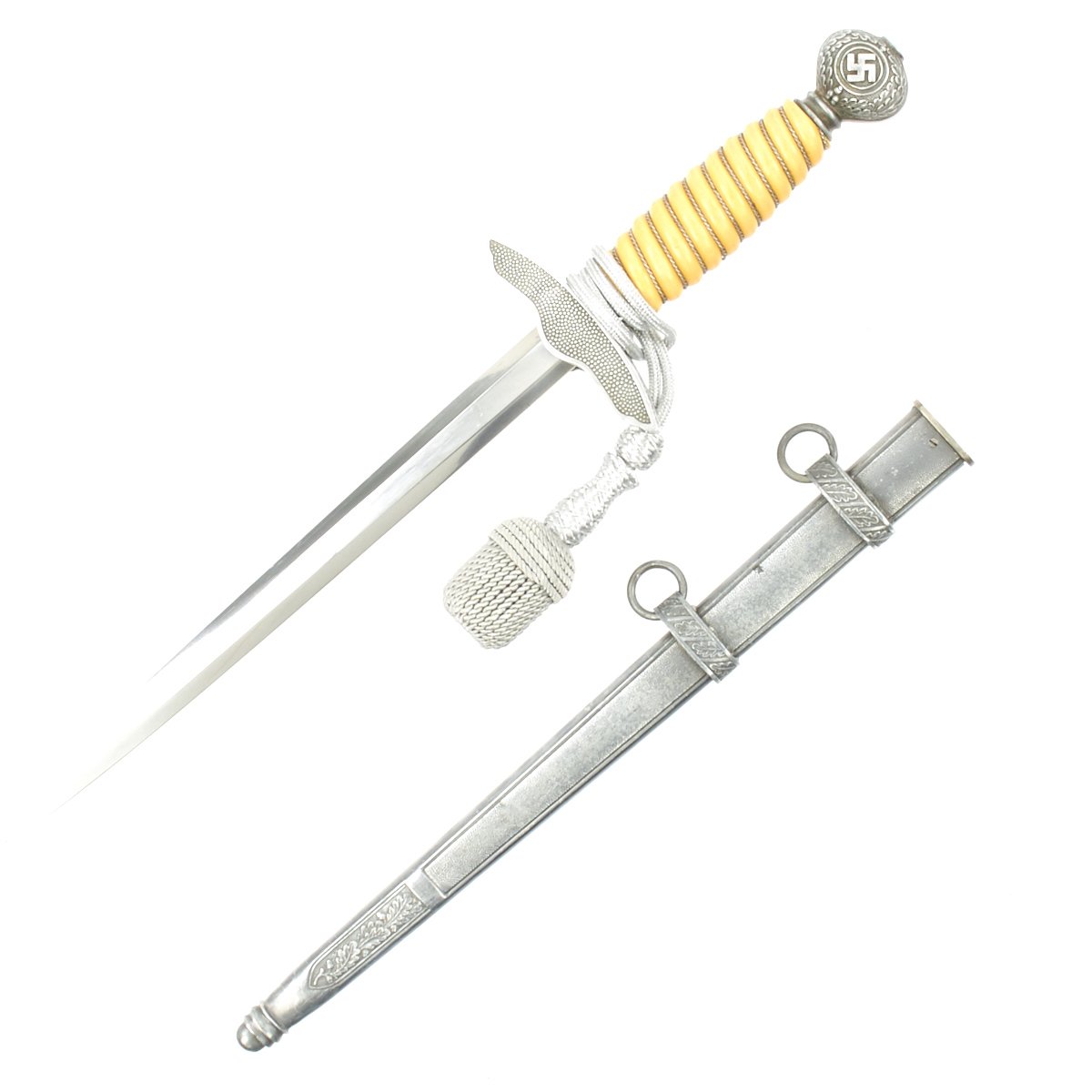 Original Item: Only One Available. This is a great example of a late-war production 2nd Model Luftwaffe dagger. It is not maker marked, which is not unusual for later war examples. The celluloid grip of this dagger is a nice yellowed ivory color, and remains in good condition throughout, with some scratches and wear. It has a nice slightly tapered shape, and is tightly wrapped with twisted silver-colored wire.