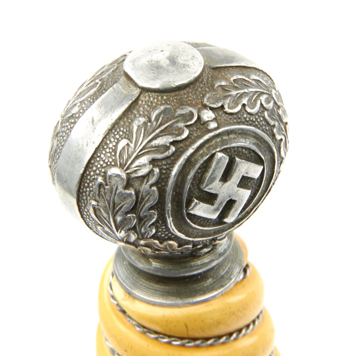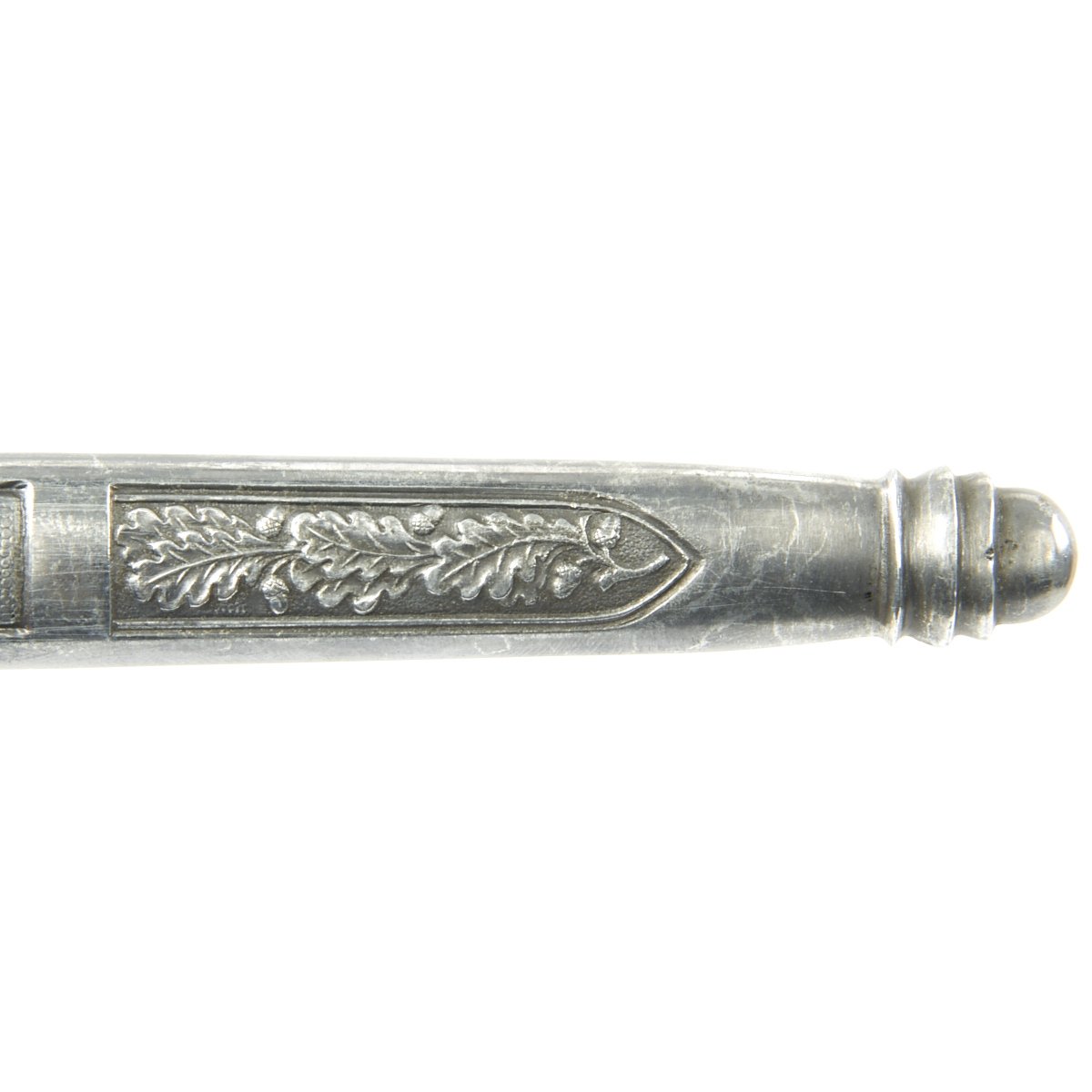 The hilt mounts are similarly in good condition on this dagger. The pommel is crisp and excellent. The swass on both sides are clear, and the oak leaves around it is raised out and heavily hand enhanced. The pommel appears to be solid aluminum, and not plated, with the usual darkening of the background. It does have a bit of wear around the edges.