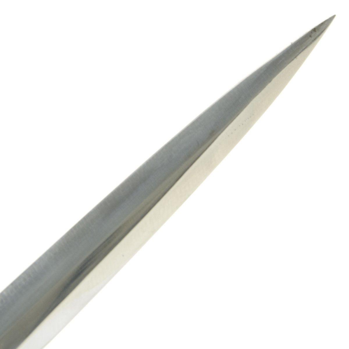 The blade on this example is not nickel plated, which is common for later produced blades. The blade is in excellent, nearly unissued condition, with just a bit of runner wear. The factory cross-grain is strong, and we do not see any evidence of sharpening or polishing. The blade is not marked, but was definitely made by a quality producer. The original leather blade buffer is in place within the deep recesses of the guard.