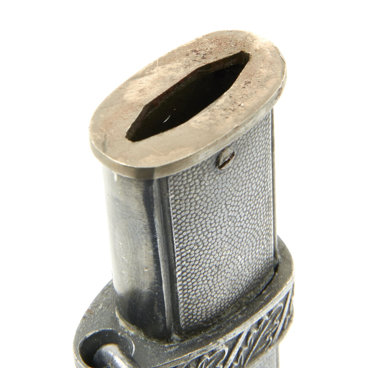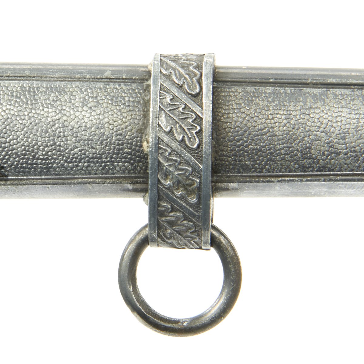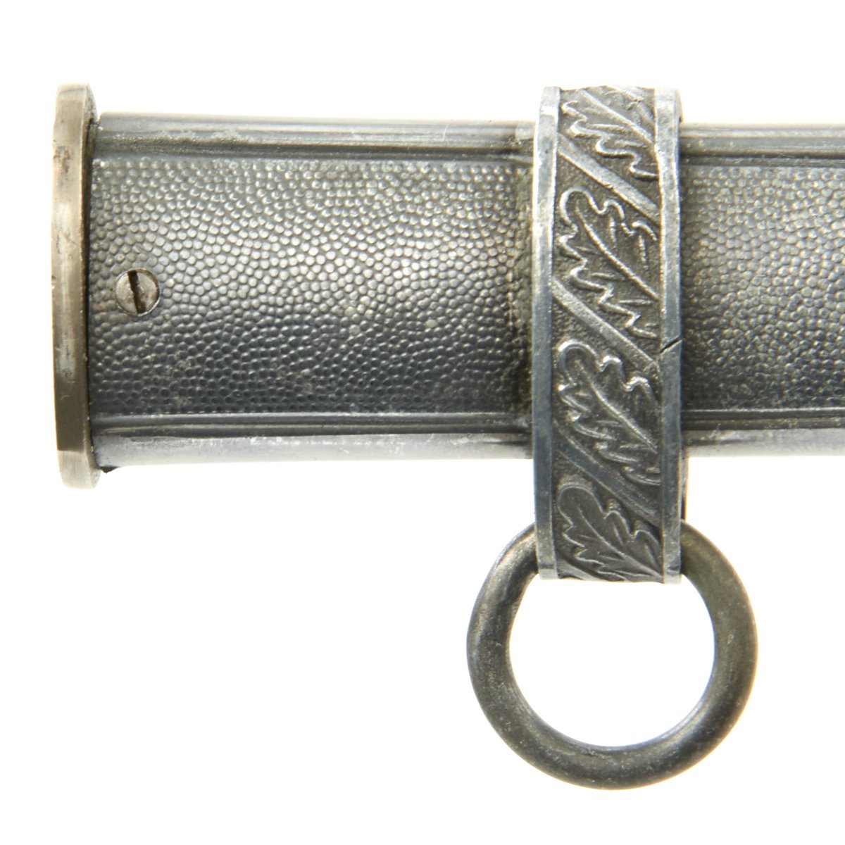 This scabbard is a fine, straight example, having most of the original zinc-plated finish, with a lovely patina. There are a few places where the plating has worn through the underlying steel. The aluminum bands are well defined and have outstanding hand enhanced oak leaves tipped at a 45 degree angle, with some wear. The throat is retained by one screw on the back, and is the wider version seen.