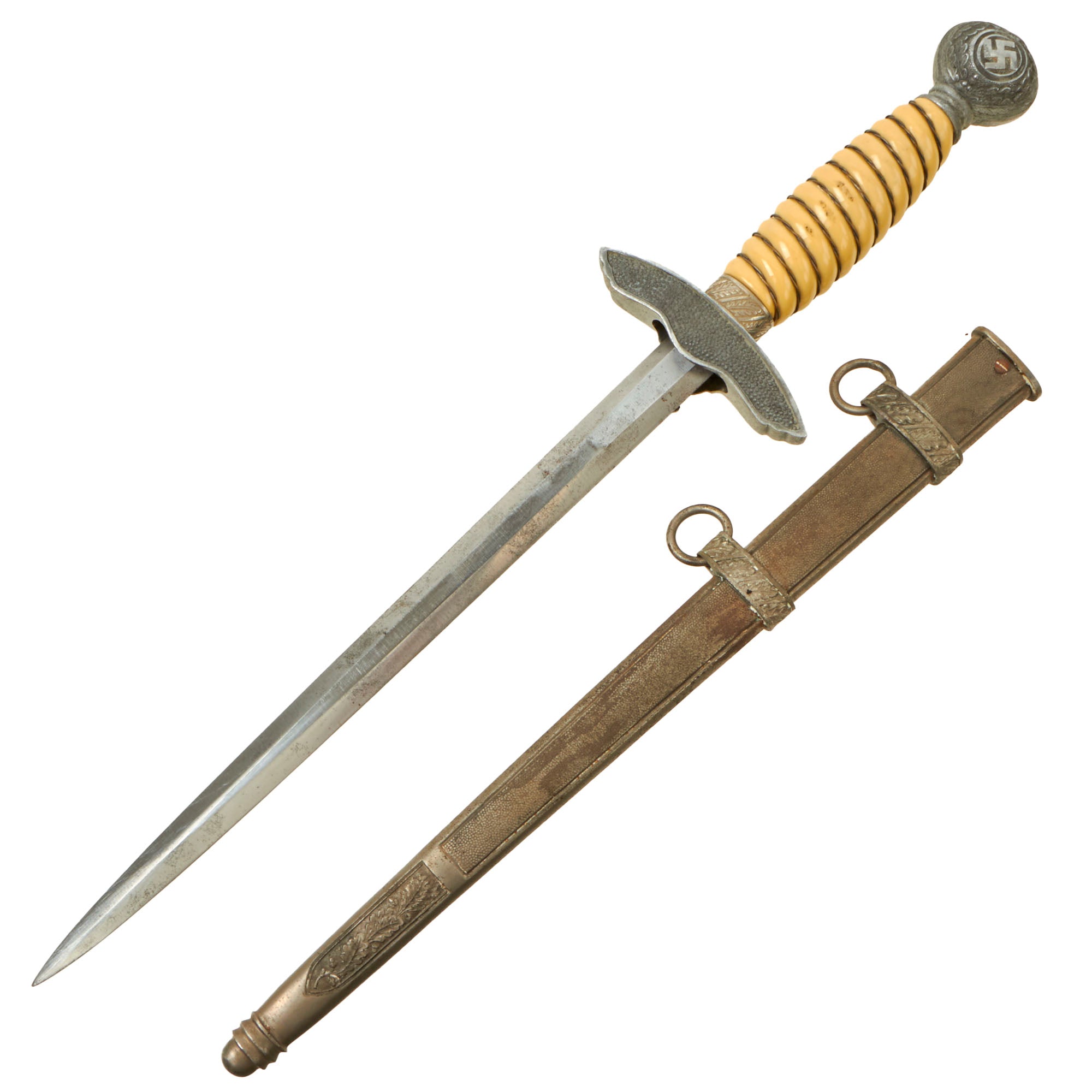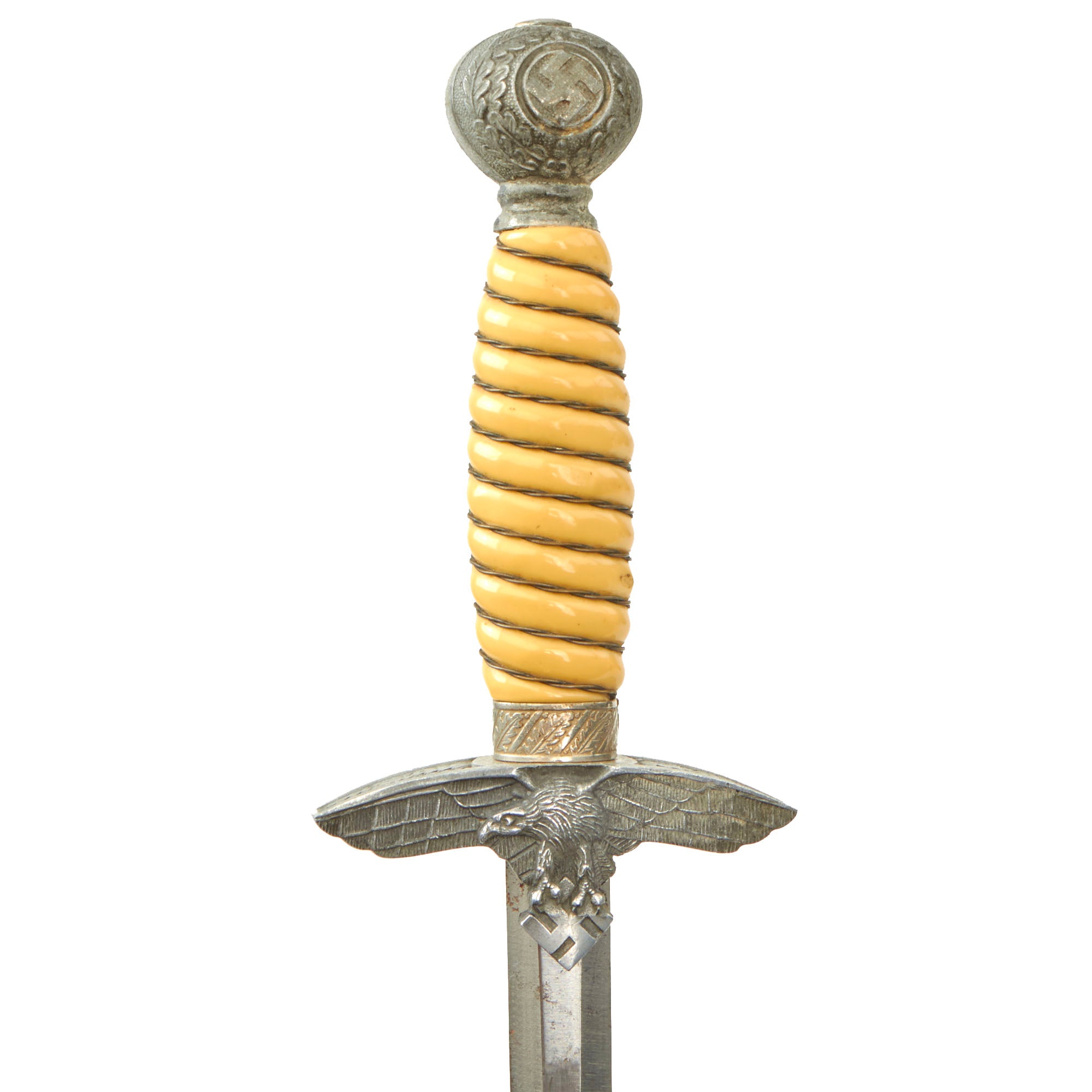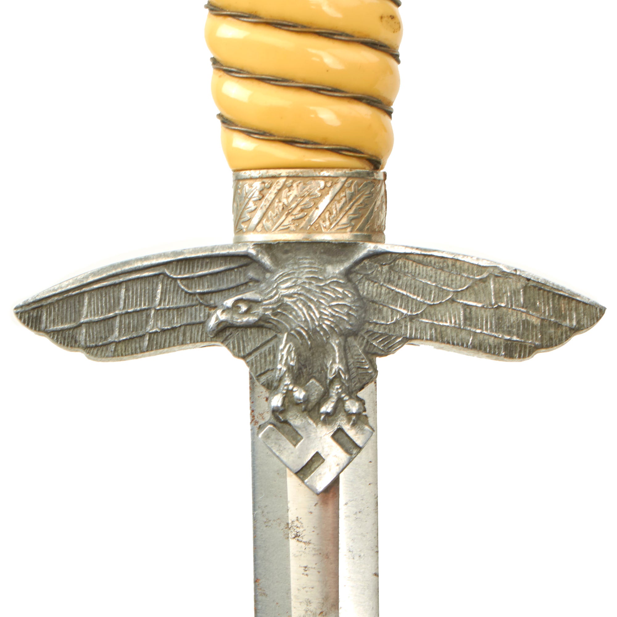 There are no maker marks that we can see, but that is not uncommon for Luftwaffe and Army officer daggers. Outfitters often purchased unmarked blades from major makers, and would do the fitting themselves. The unique cross grain is definitive for WWII German production.