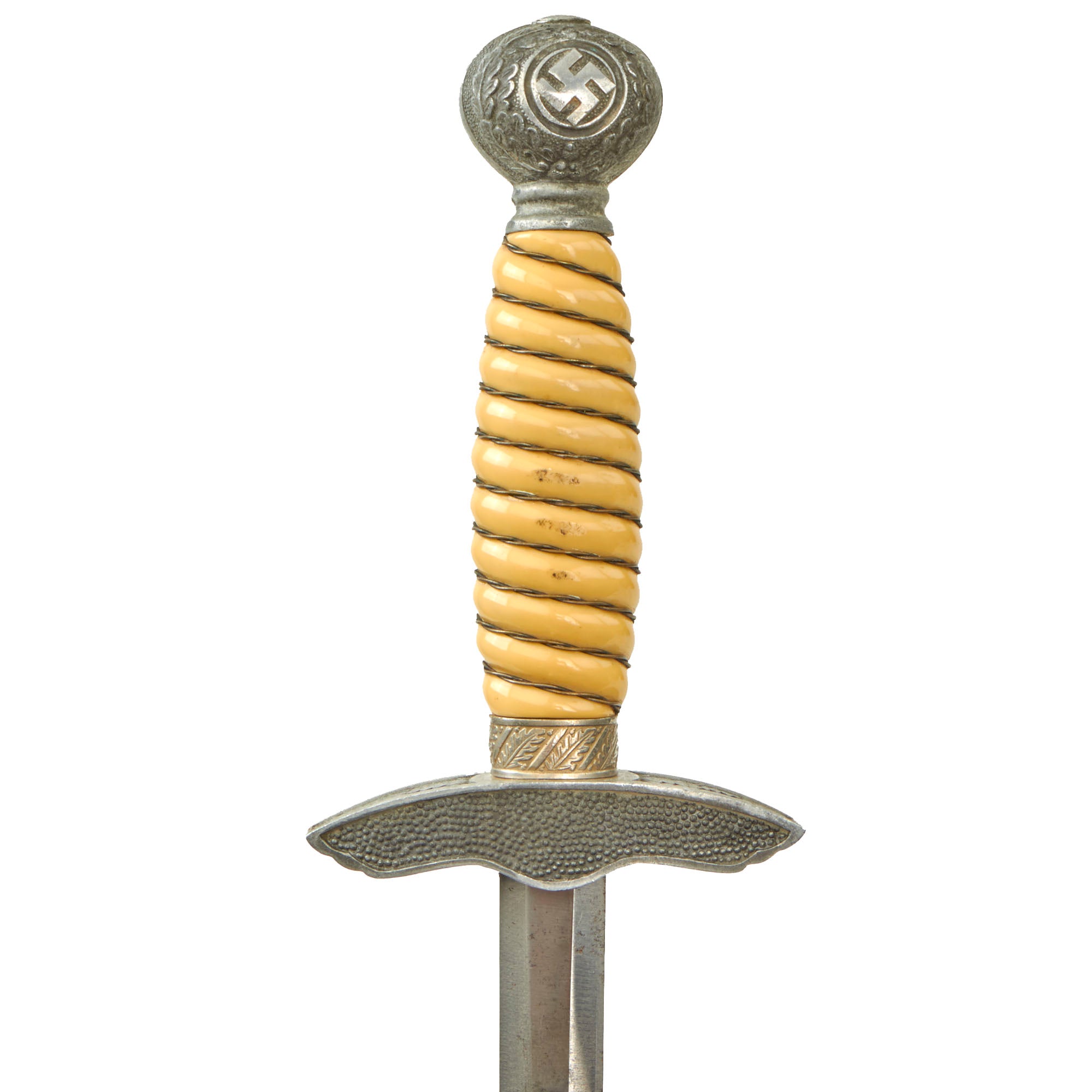 The crossguard is also made of Aluminum, which was an "Air Age" material, used to make most airplanes. It was considered fitting and desirable for the eagle-shaped guard to be made of this material. The front side is an eagle with a breast and talon area that is vaulted out much more so than the crossguards seen on other types of daggers. This guard shows little wear and has great feathering on the eagle. The bird, of course, flies to the left and grasps a mobile swas (hook cross) in his talons. The reverse panel is decorated with small pebbling, which is still clear. The plating is well retained except on the swas and some raised areas, which now show the bare aluminum. The ferrule looks to be plated steel, and it is still in very good condition, with the plating almost completely intact.