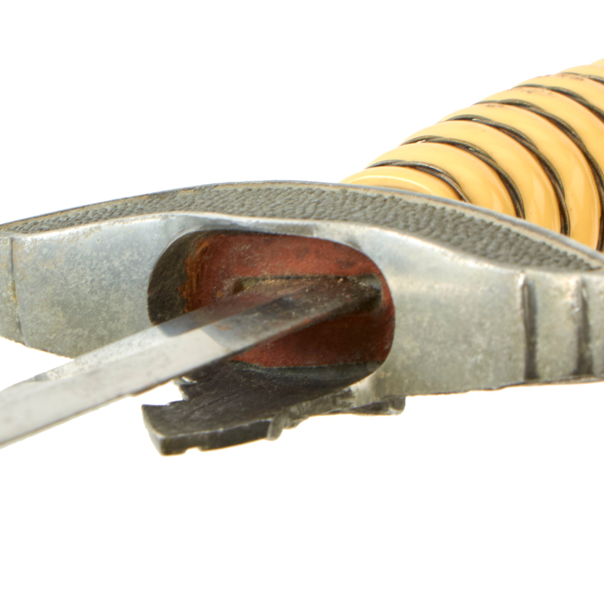 Unlike most example that we see, the celluloid over wood grip of this dagger still retains the original ivory color! These almost always faded to orange or darker over the years as the material degrades due to light exposure. It remains in great shape throughout, and has a nice tapered shape, still tightly wrapped with plated twisted wire. There is just a bit of wear and light staining, and not any major cracks or other damage, and the wrapping also shows some oxidation staining.