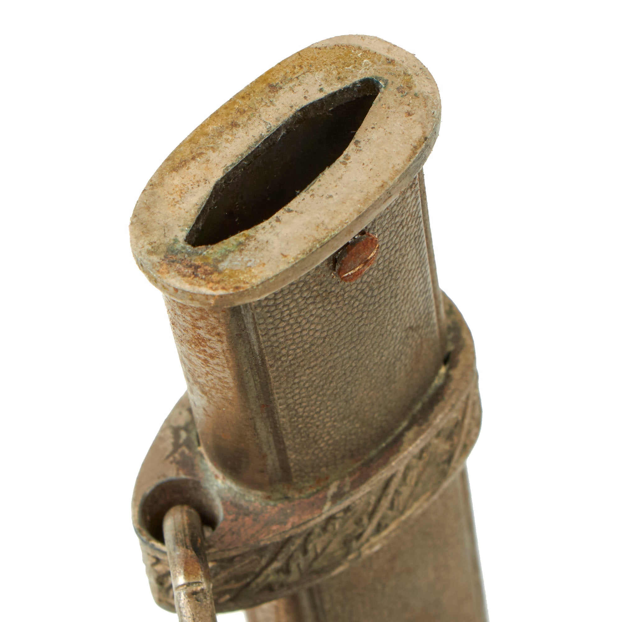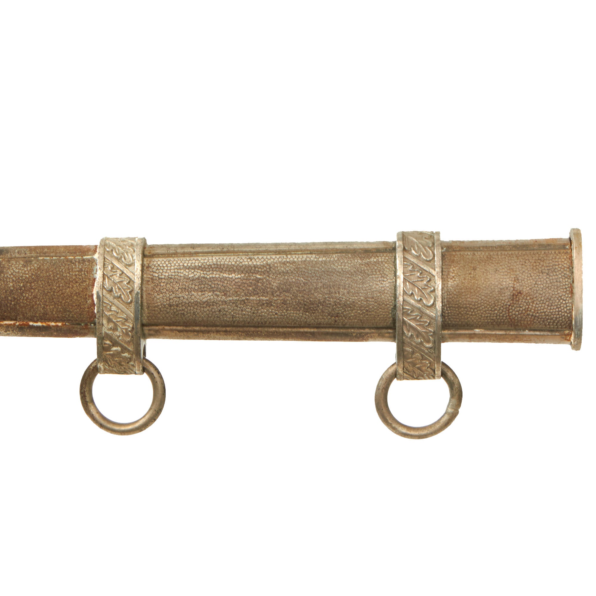 This steel scabbard is in very good condition, dent free and with much of the original plating intact. It looks to originally have been zinc plated, which has oxidized and degraded a bit over the years, exposing the underlying steel. The hanger bands are plated zinc, and are well defined with have hand enhanced oak leaves tipped at a 45 degree angle. They show light wear, with the plating partly intact, and some "white rust" around the edges of the lower fitting. The throat is the wider version seen, secured by a single "cheese head" screw on the back of the scabbard.