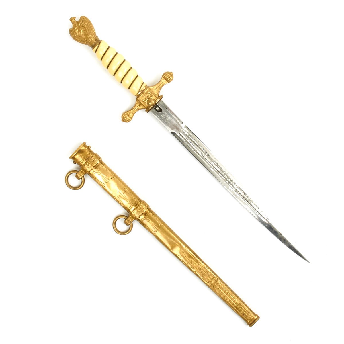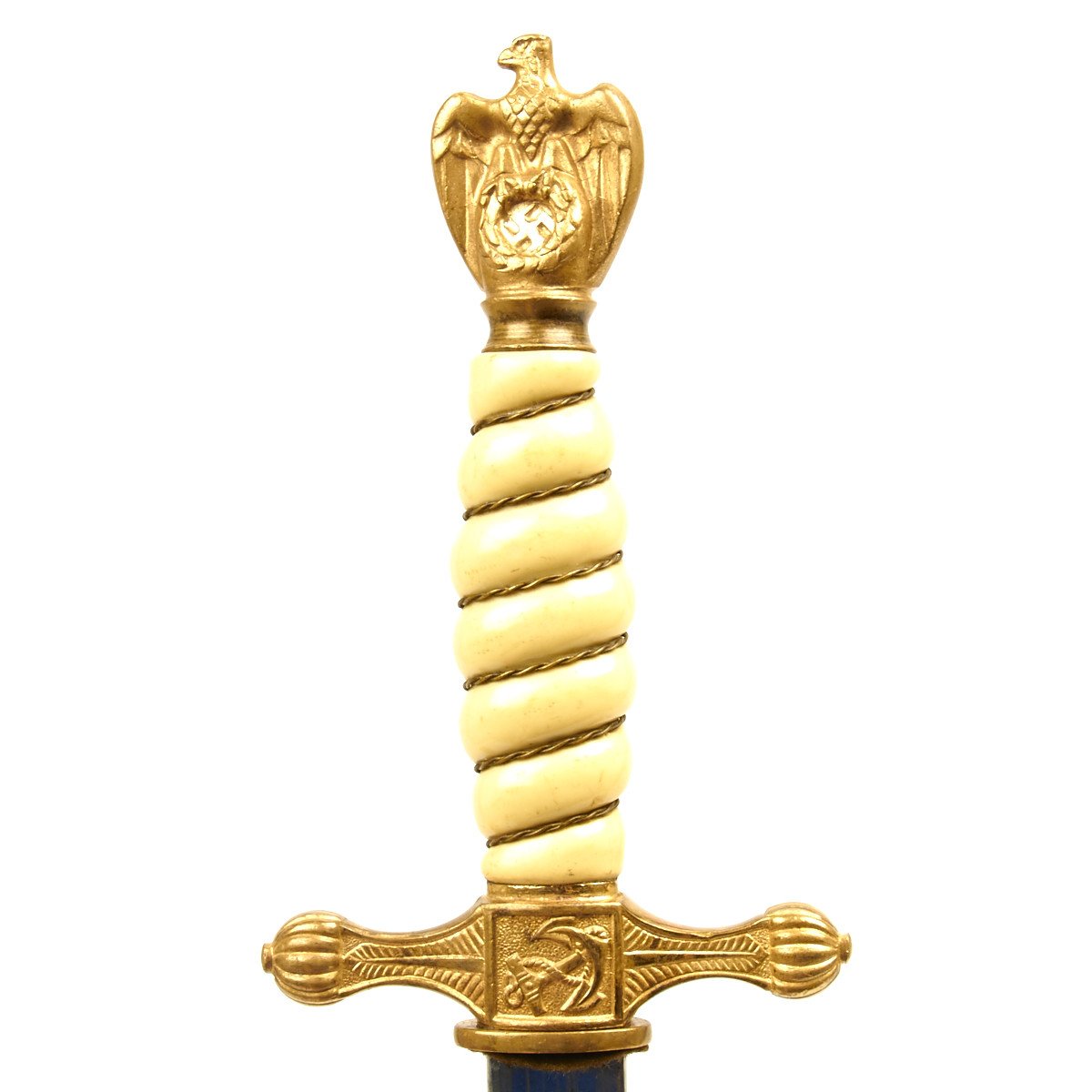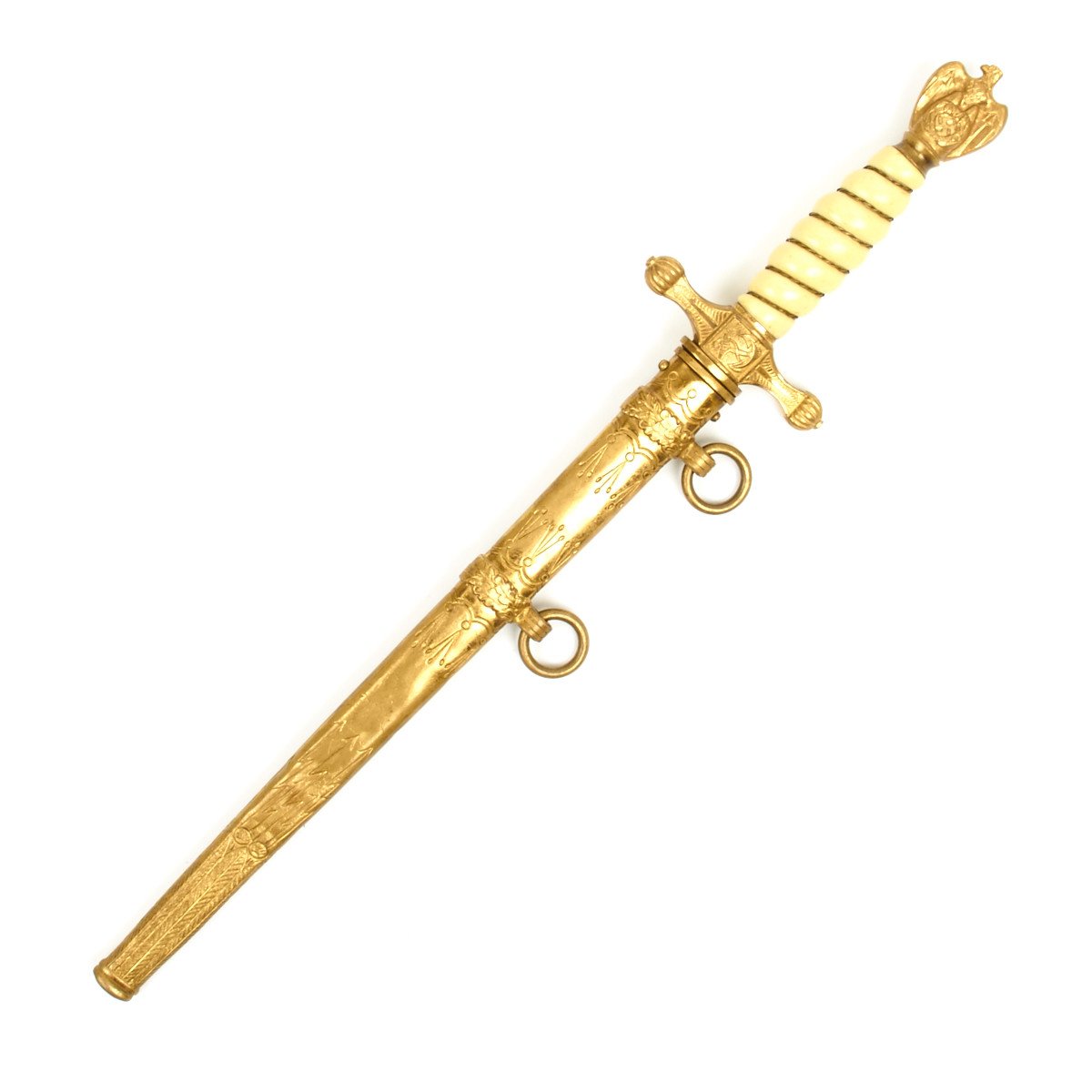 This 2nd Model Naval Dagger was almost certainly purchased by a high ranking officer early in the period as the pommel is a 1938 changeover type. It has very deeply inset wings and an impressive vault wreath. The details to this bird are also choice, with a striking eye, beak and breast. The crossguard is a standard Eickhorn type.