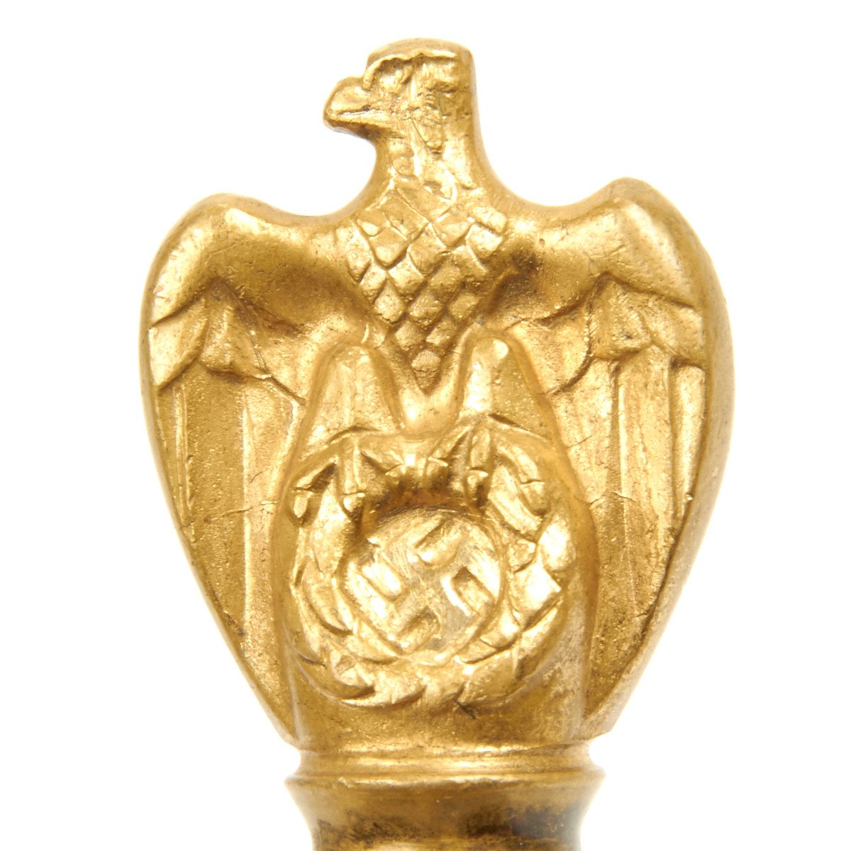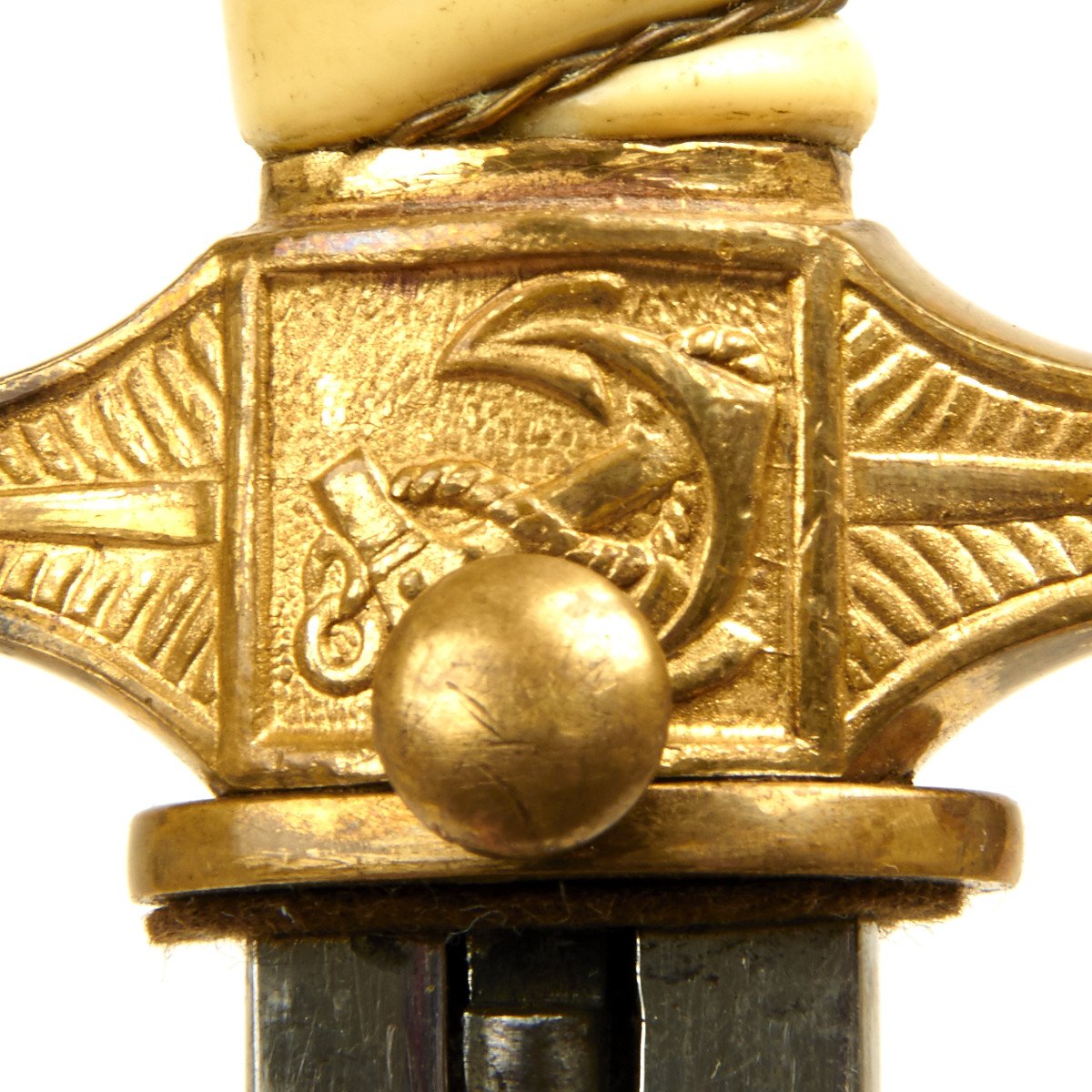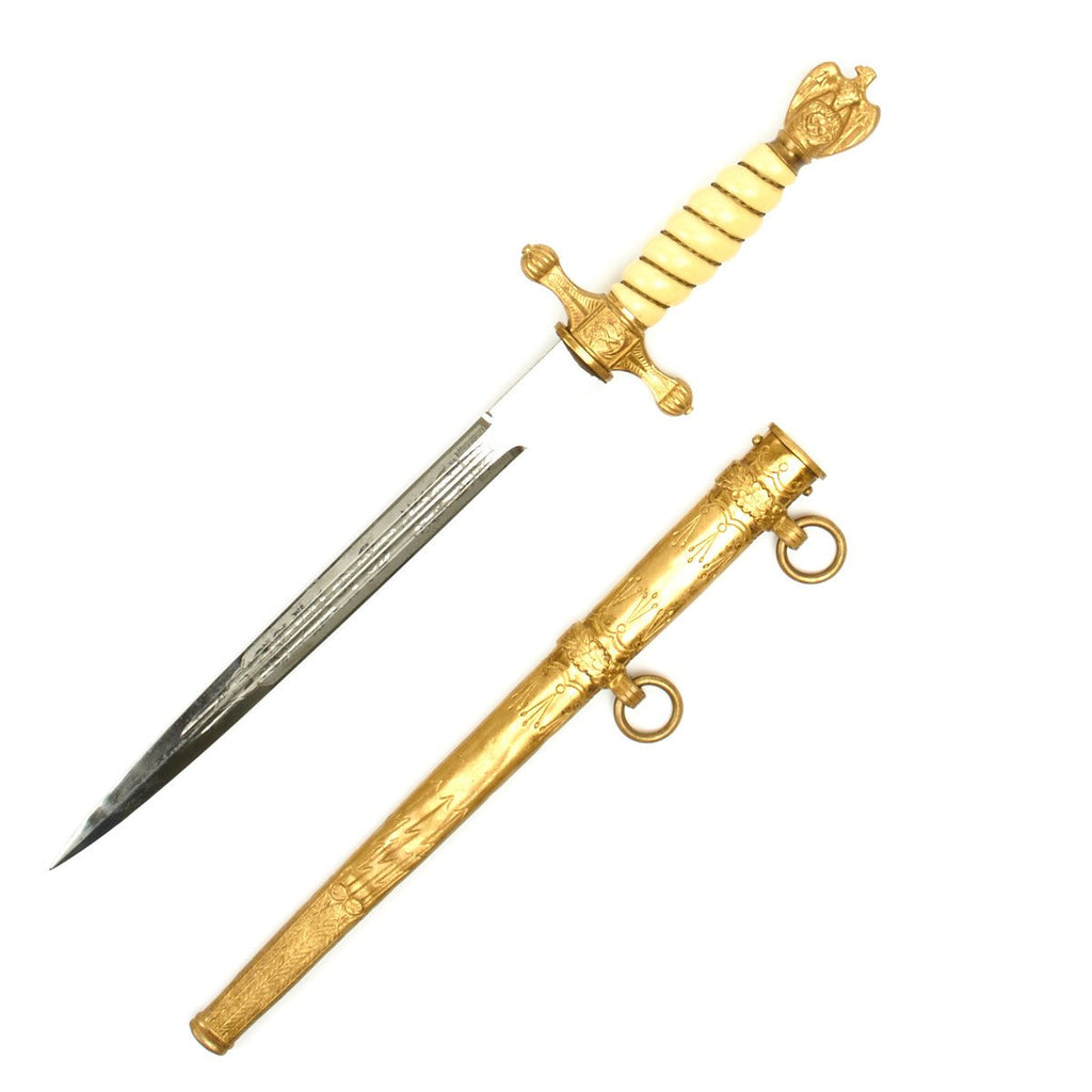 This 2nd Model Naval Dagger was almost certainly purchased by a high ranking officer early in the period as the pommel is a 1938 changeover type. It has very deeply inset wings and an impressive vault wreath. The details to this bird are also choice, with a striking eye, beak and breast. The crossguard is a standard Eickhorn type.