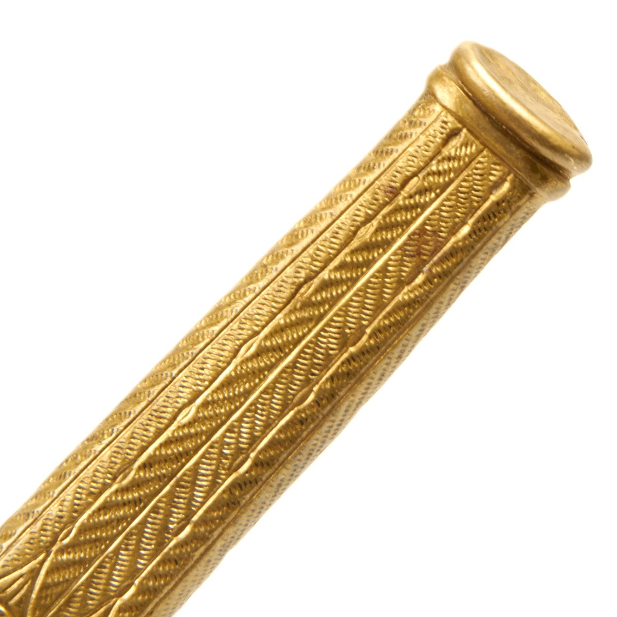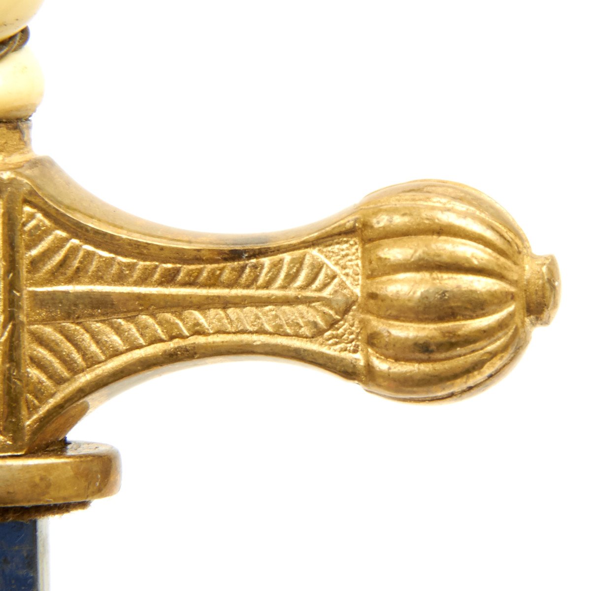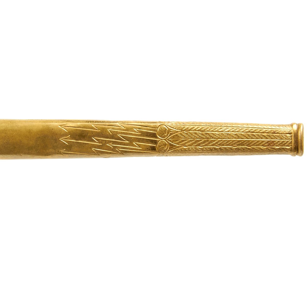 The lightning bolt scabbard is straight and shows very little wear, The scabbard is stamped with well-defined palmettes around the bands and lightning bolts, ermine feet and acanthus leaves down to the chape. The bands feature overlapping oak leaves and acorns. The rings are the triple serrated type and also show little wear. The throat is retained by two dome head screws. The ball end has taken a knock.
