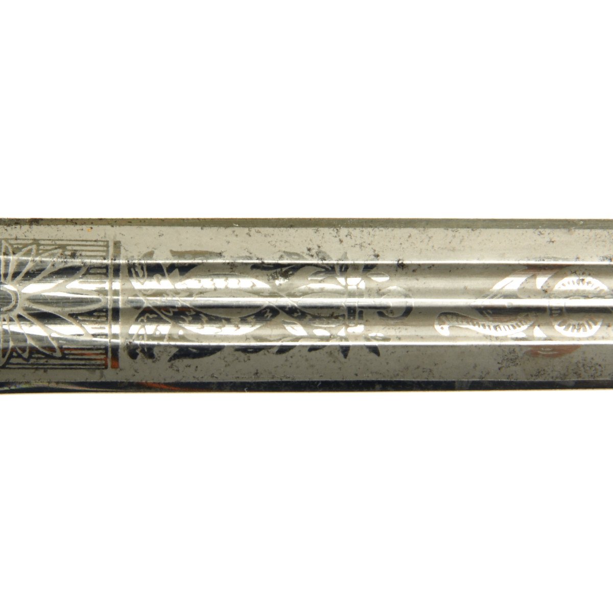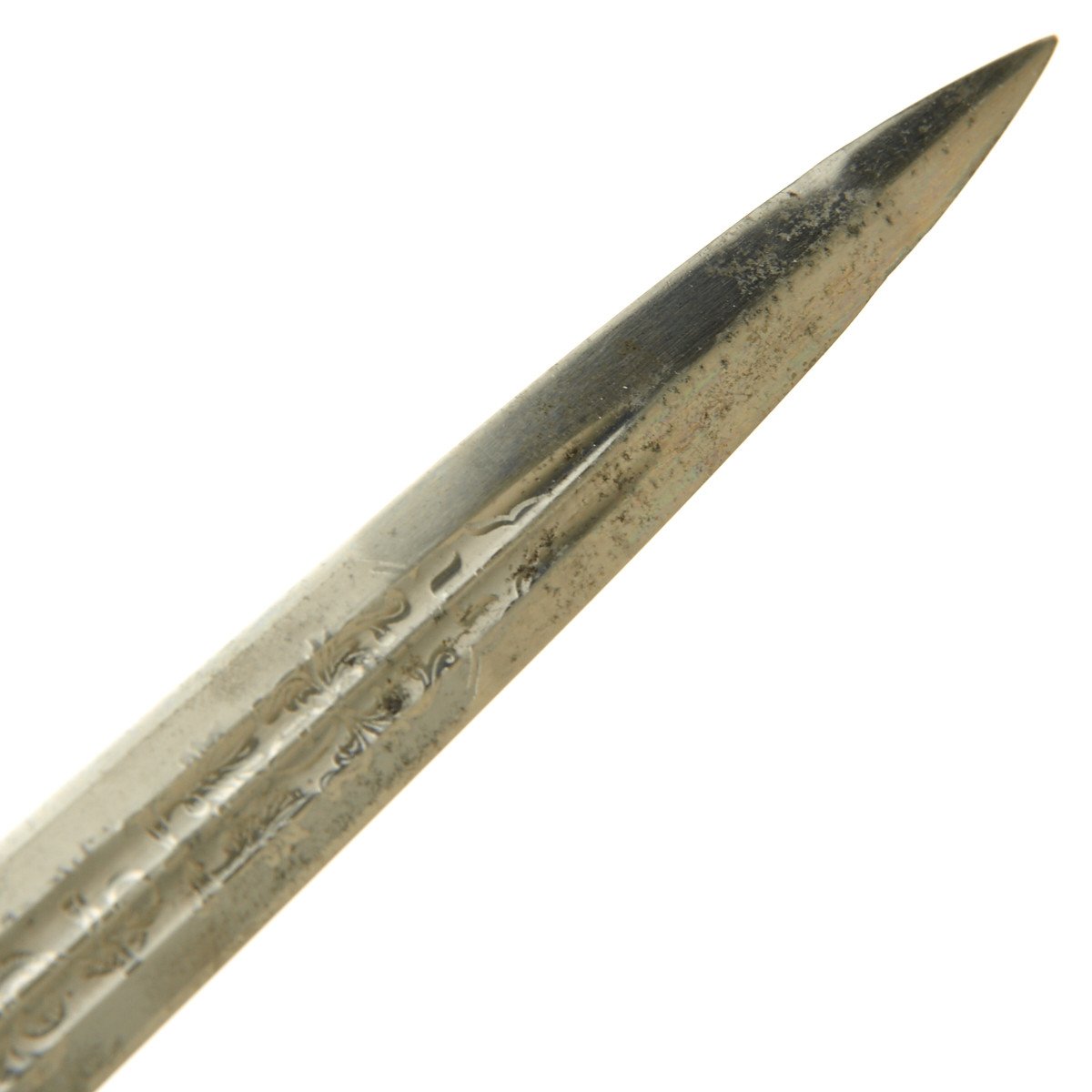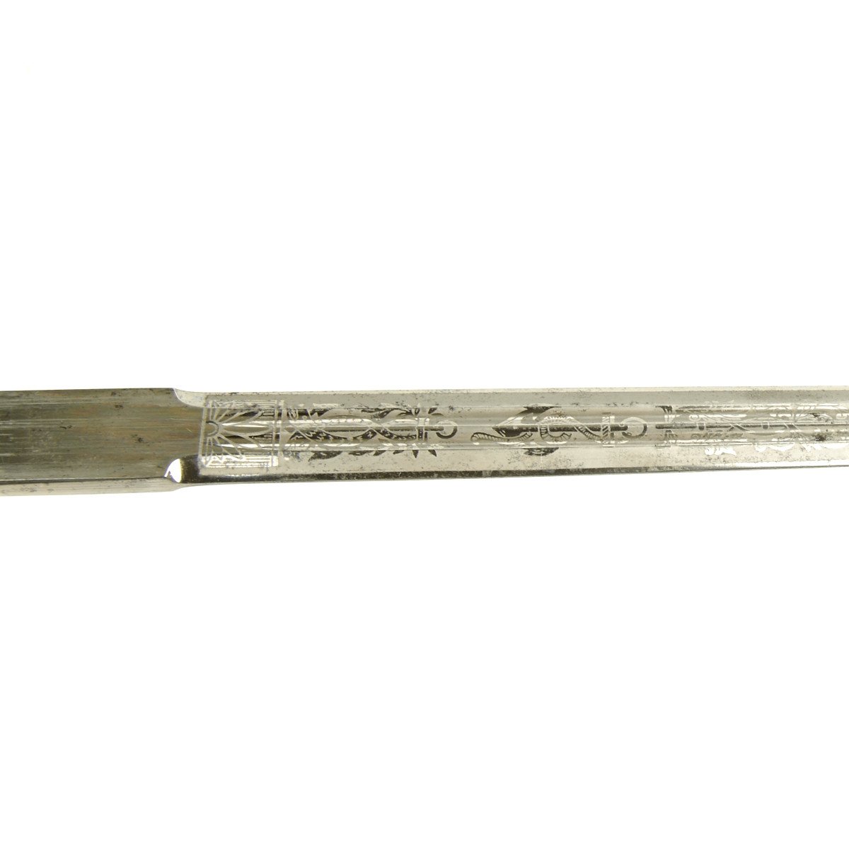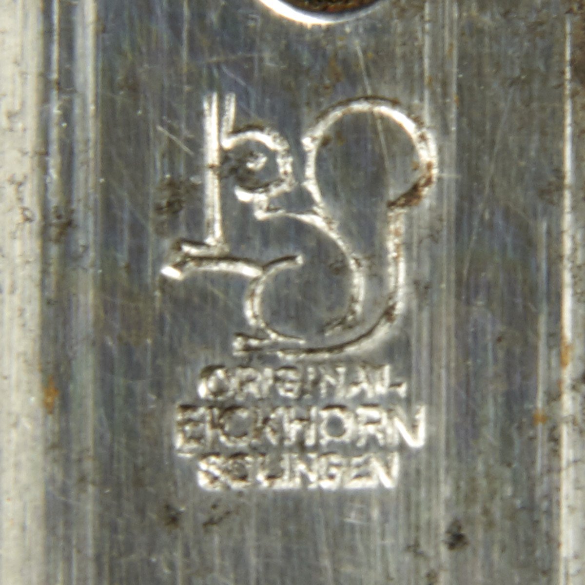 The blade is an very nice example, with a high quality nickel-plated finish and an excellent fouled anchor etch. The etch is beautiful, retaining 90% of the frosted backgrounds. The reverse ricasso is stamped with the 1935-41 Eickhorn trademark: a seated squirrel holding a sword, with the word ORIGINAL above and the firm's name and location, Eickhorn / SOLINGEN below. The original felt blade buffer is in place and tip of the blade is perfect.