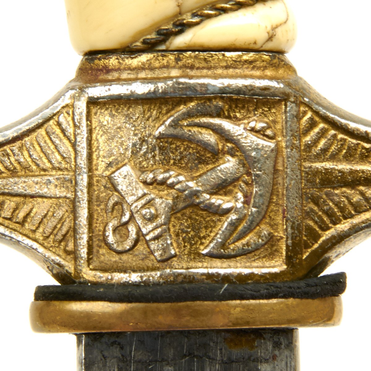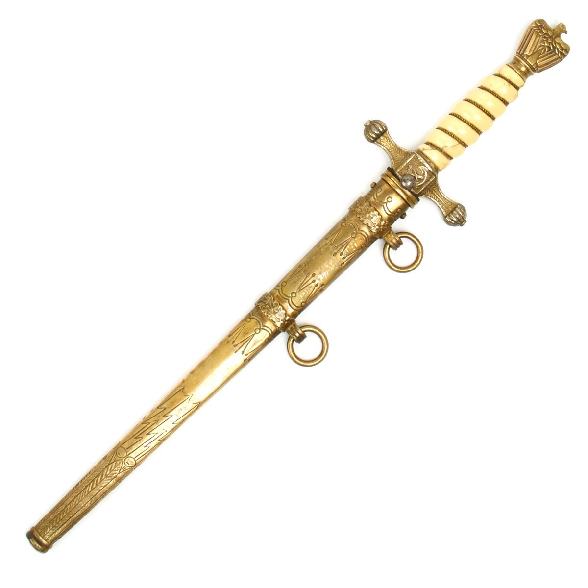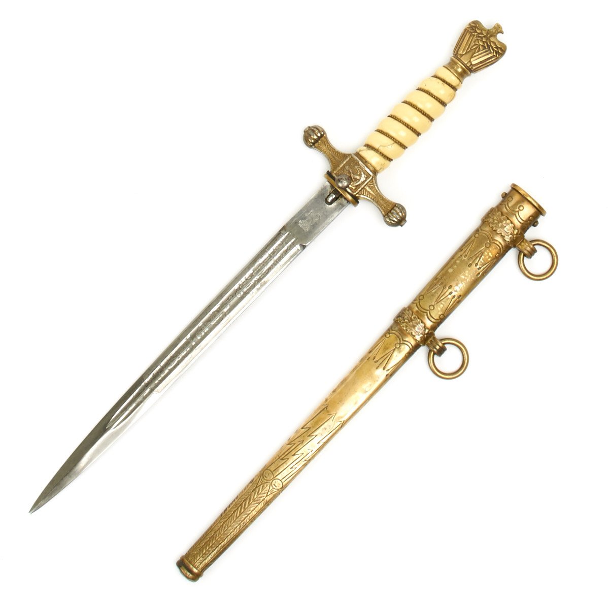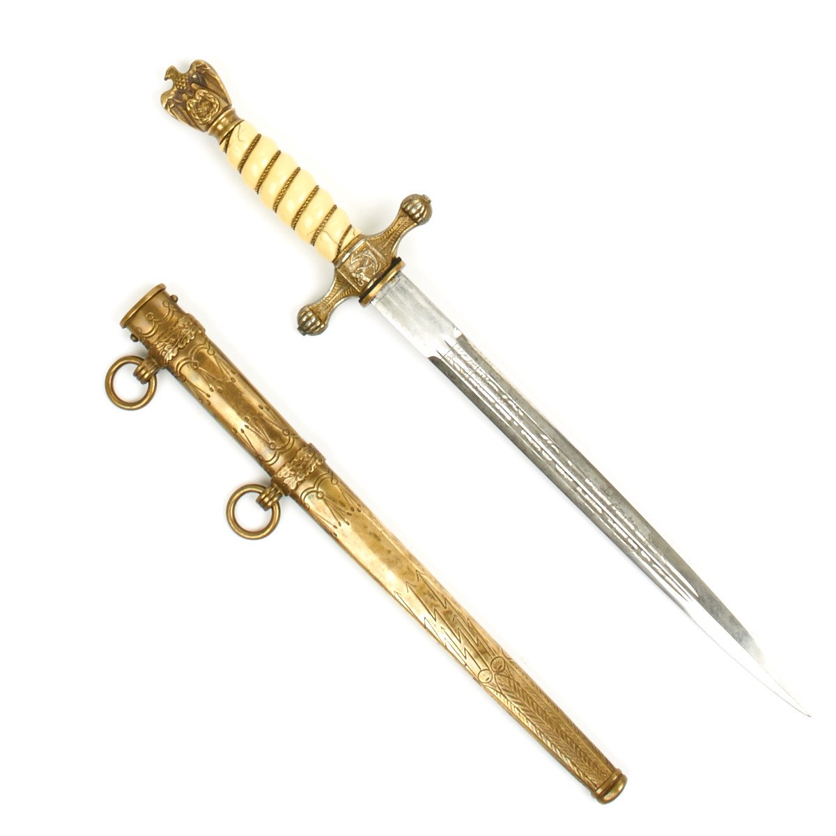 This 2nd Model Naval Dagger was probably purchased by a high ranking officer early in the period as the pommel is a 1938 changeover type. It has very deeply inset wings and an impressive vault wreath. The details to this bird are also choice, with a striking eye, beak and breast. The crossguard is a standard Eickhorn type.