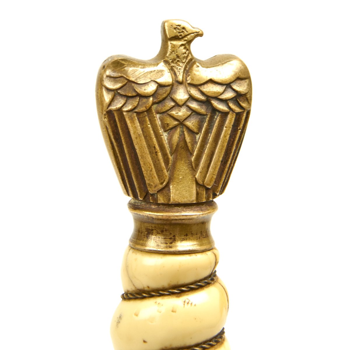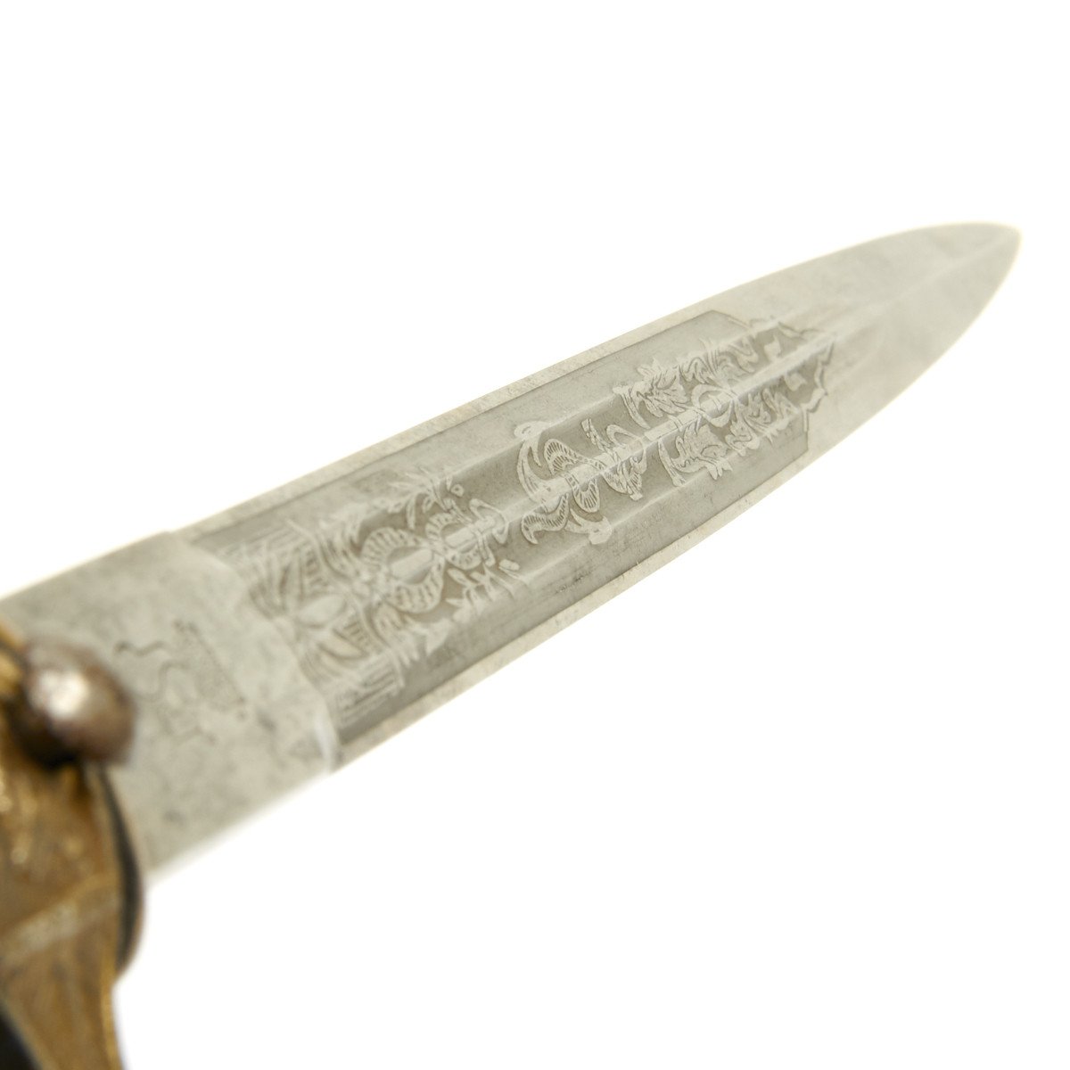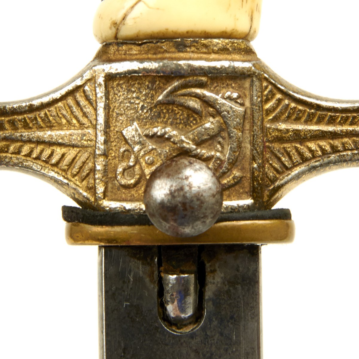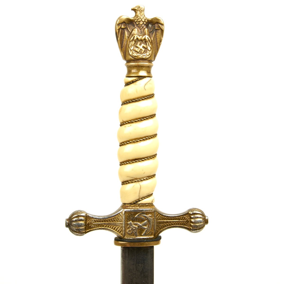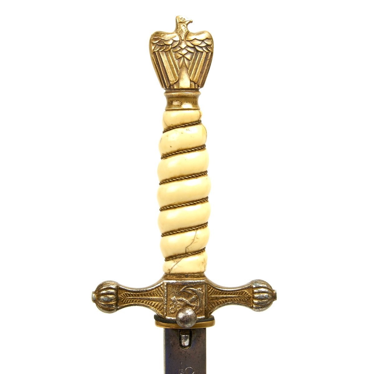 This 2nd Model Naval Dagger was probably purchased by a high ranking officer early in the period as the pommel is a 1938 changeover type. It has very deeply inset wings and an impressive vault wreath. The details to this bird are also choice, with a striking eye, beak and breast. The crossguard is a standard Eickhorn type.