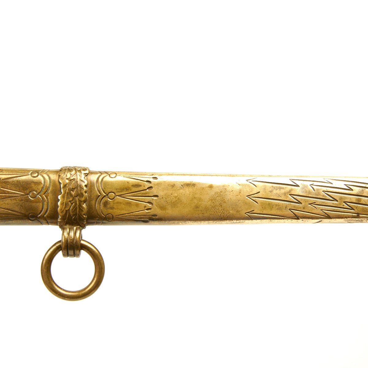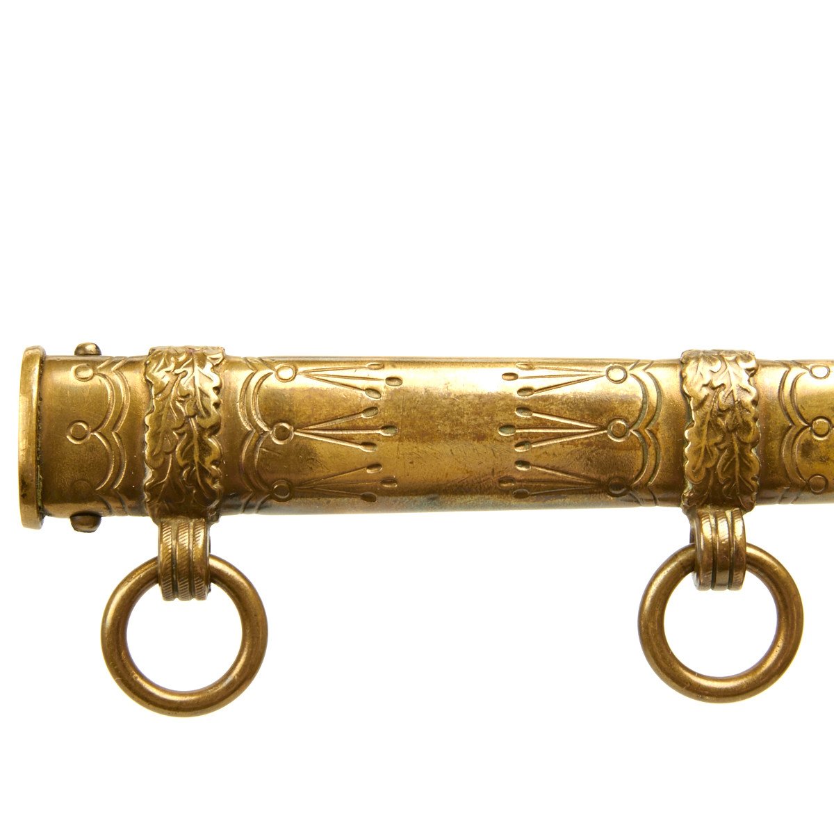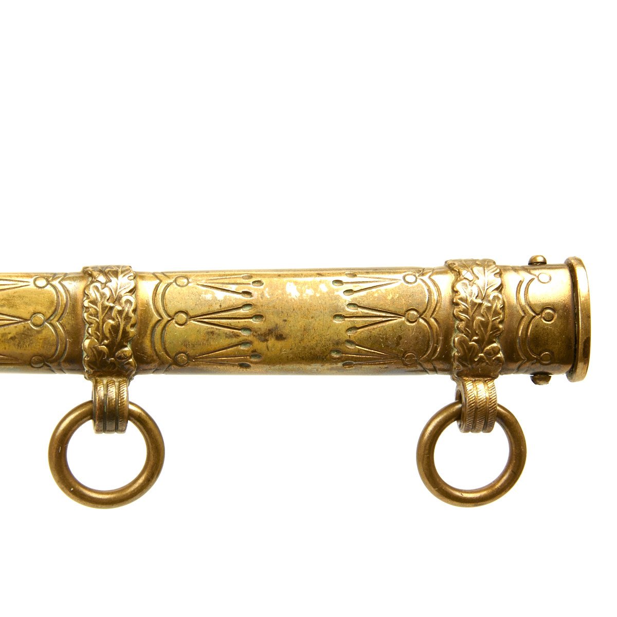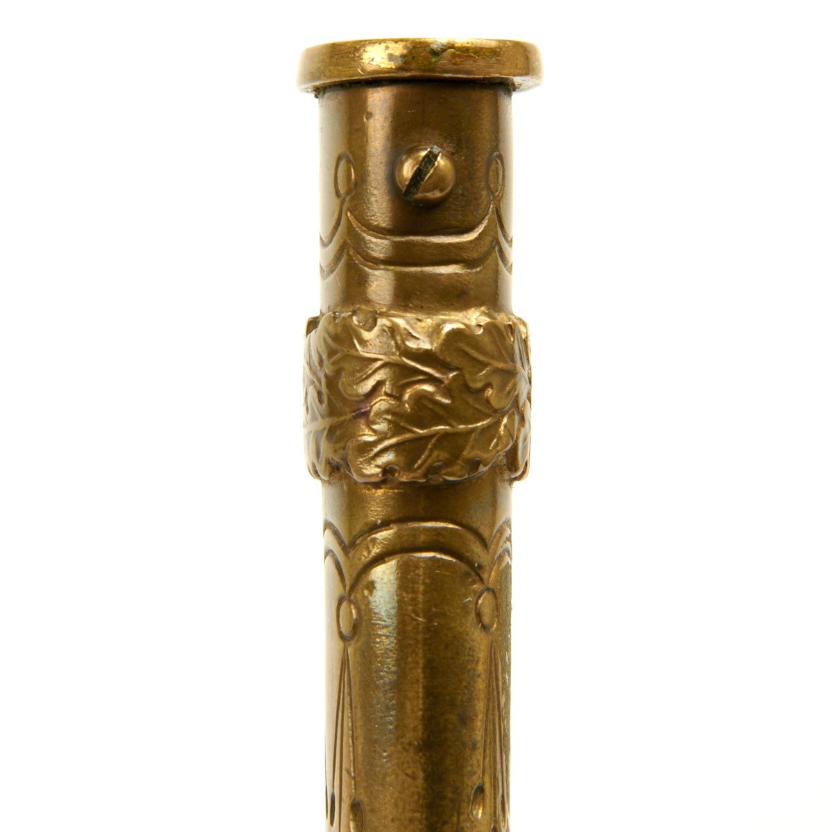 The lightning bolt scabbard is straight and shows hand wear, but that is to be expected as this dagger was worn throughout the period. The scabbard is stamped with well-defined palmettes around the bands and lightning bolts, ermine feet and acanthus leaves down to the chape. The bands feature overlapping oak leaves and acorns. The rings are the triple serrated type and also show little wear. The throat is retained by two dome head screws.