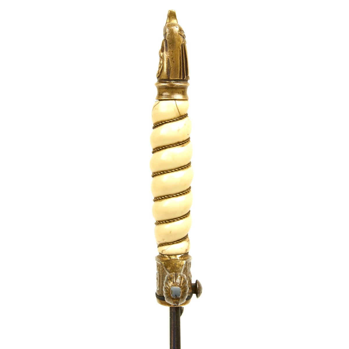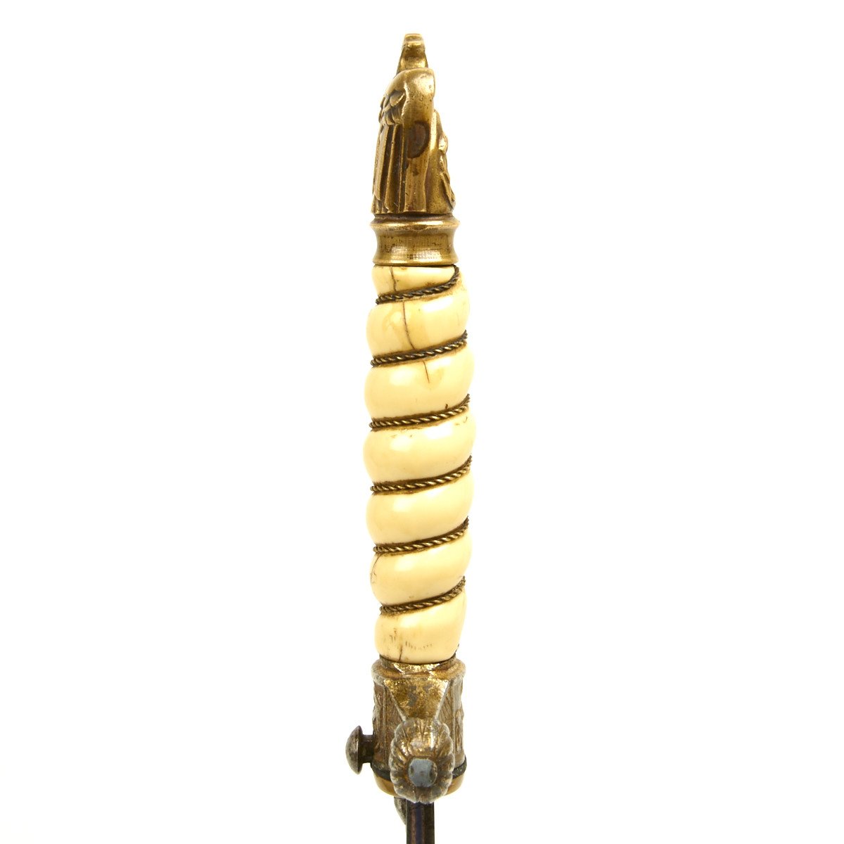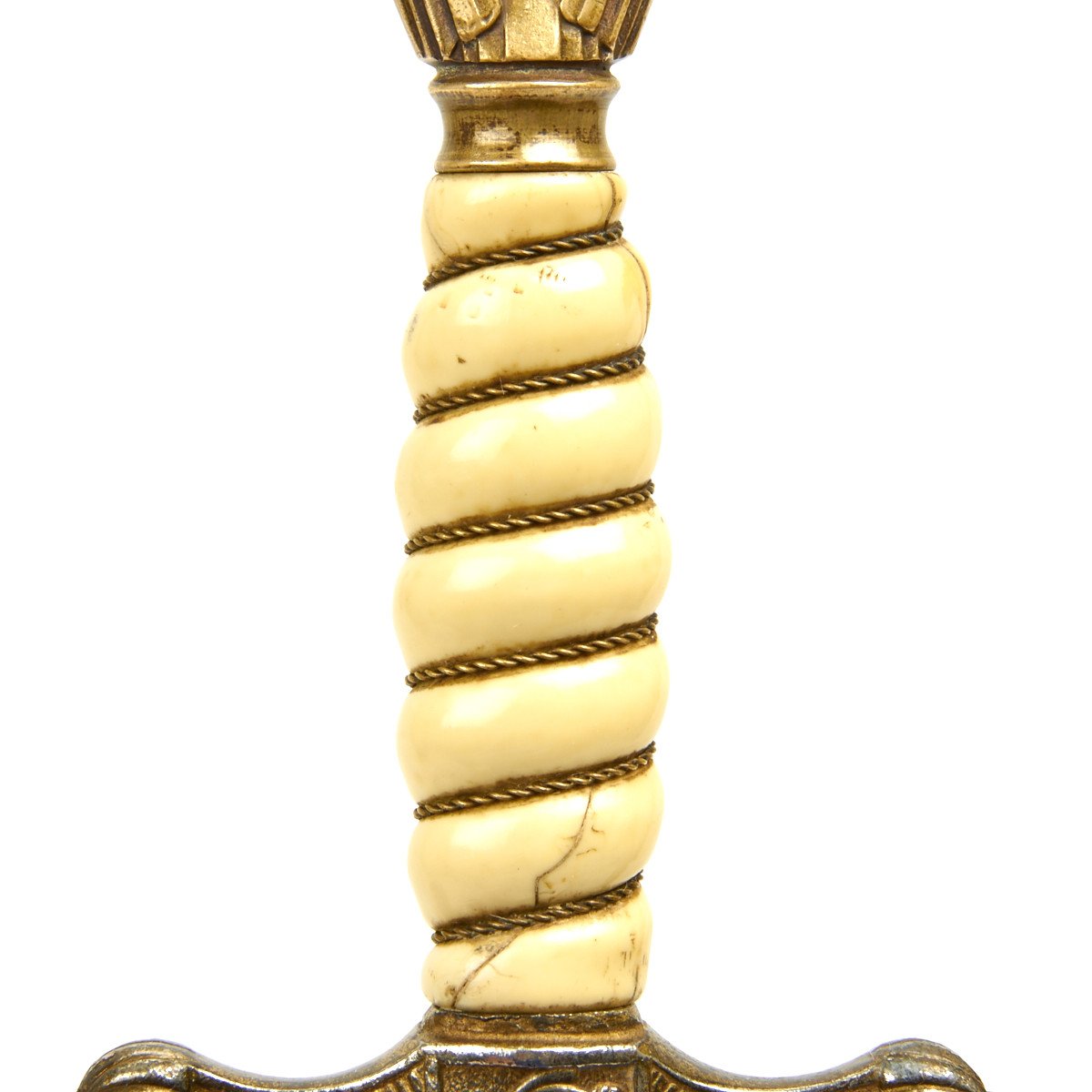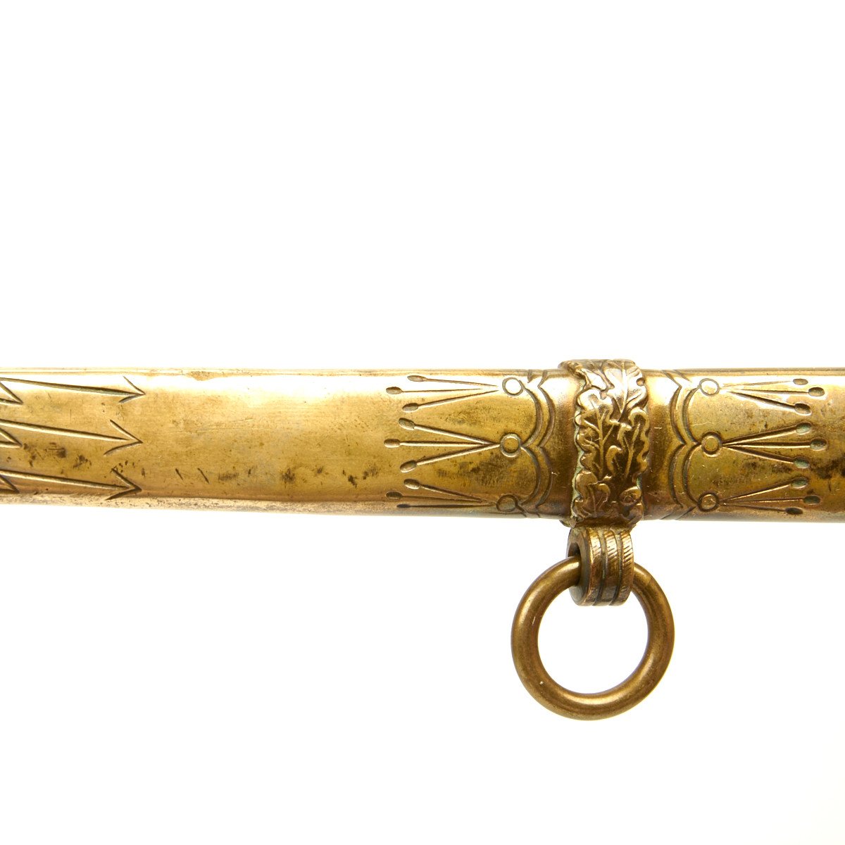 The lightning bolt scabbard is straight and shows hand wear, but that is to be expected as this dagger was worn throughout the period. The scabbard is stamped with well-defined palmettes around the bands and lightning bolts, ermine feet and acanthus leaves down to the chape. The bands feature overlapping oak leaves and acorns. The rings are the triple serrated type and also show little wear. The throat is retained by two dome head screws.