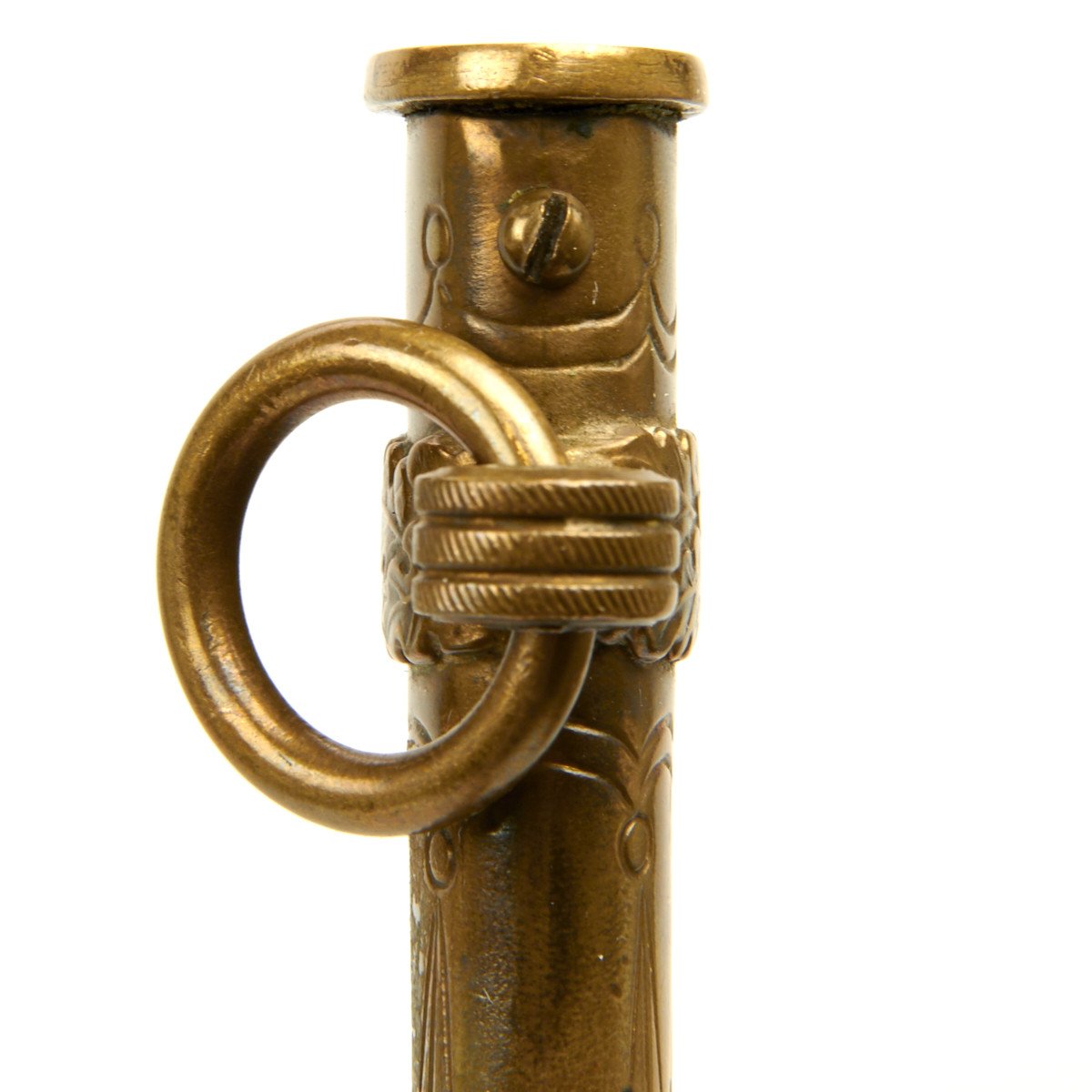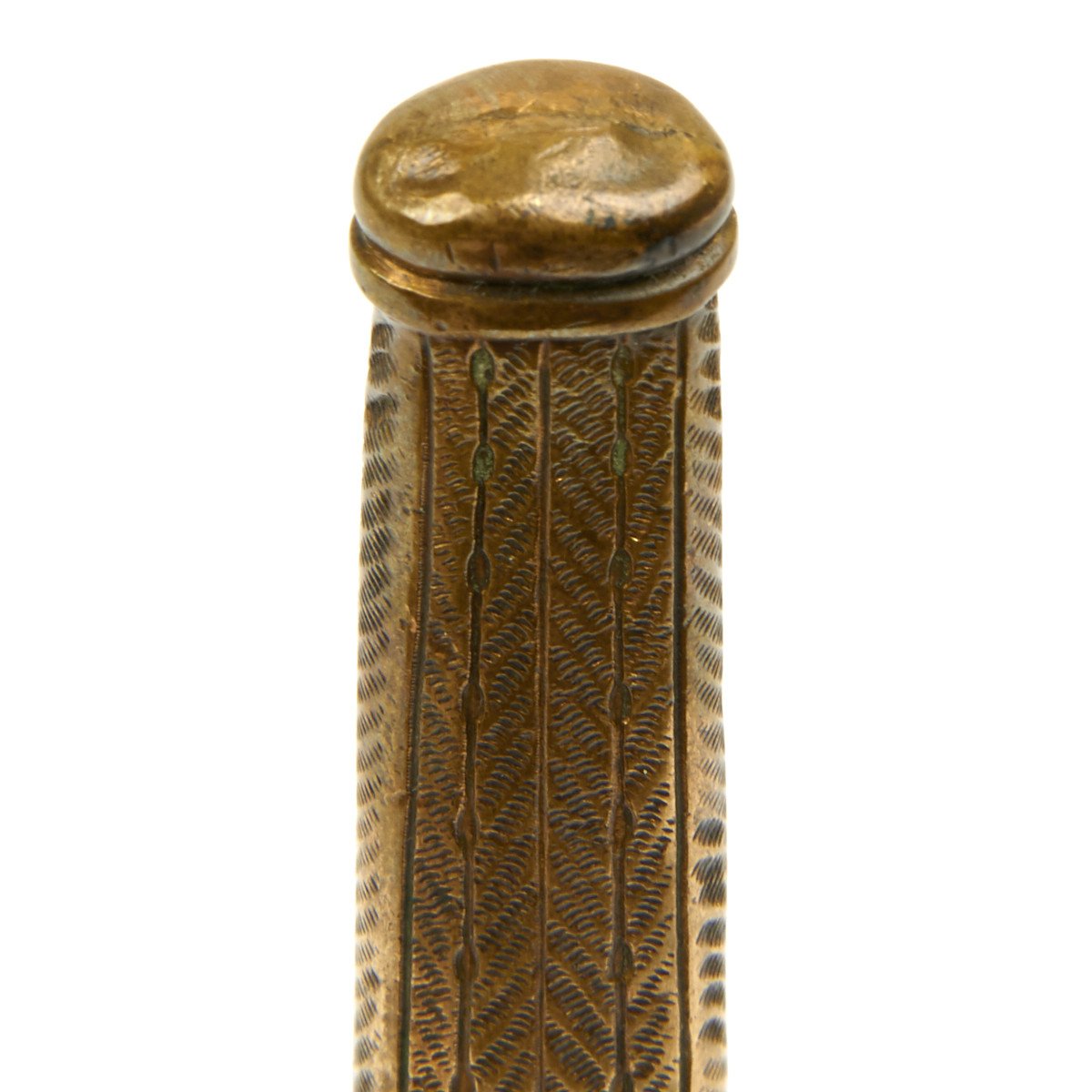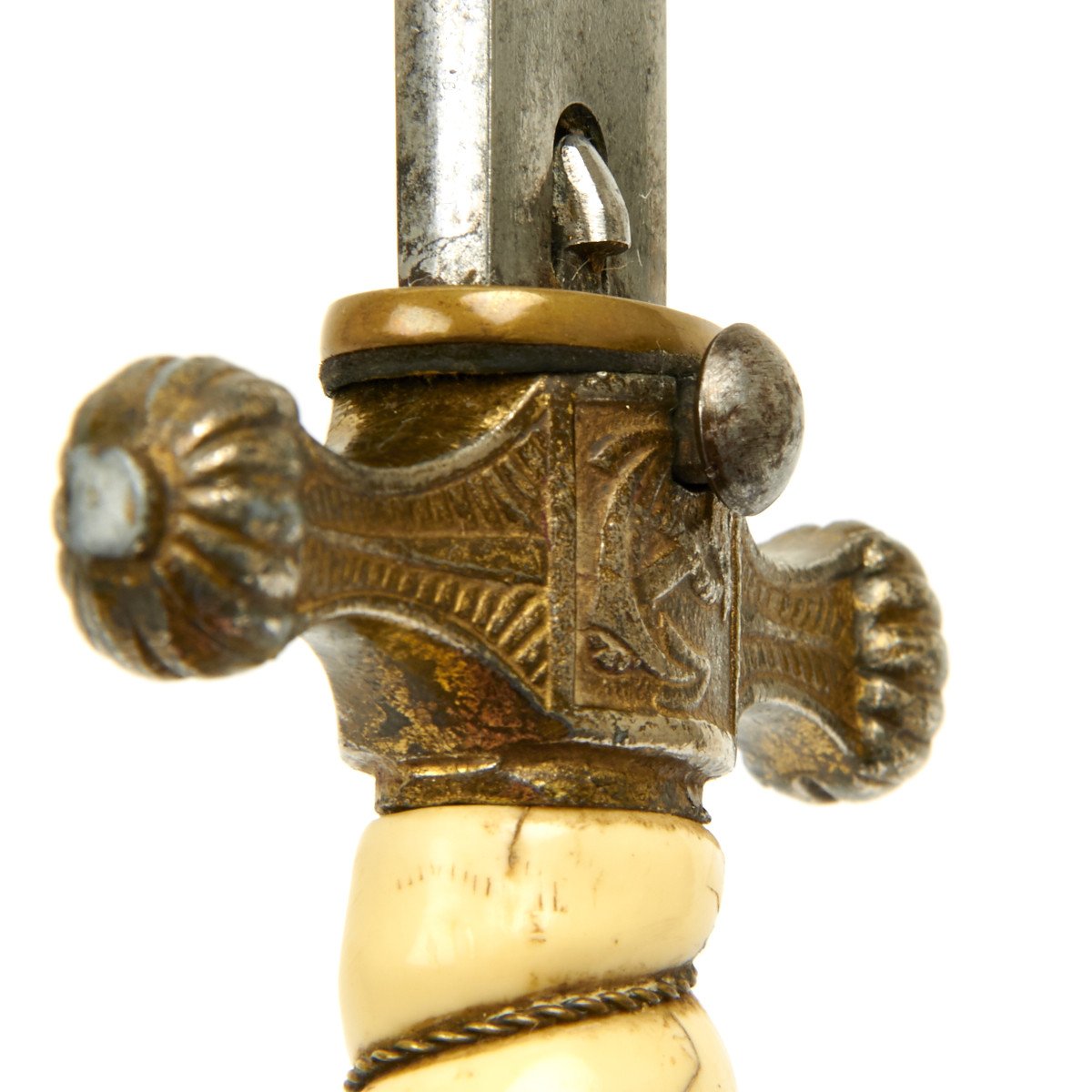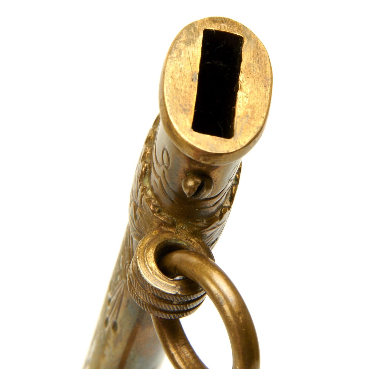 The lightning bolt scabbard is straight and shows hand wear, but that is to be expected as this dagger was worn throughout the period. The scabbard is stamped with well-defined palmettes around the bands and lightning bolts, ermine feet and acanthus leaves down to the chape. The bands feature overlapping oak leaves and acorns. The rings are the triple serrated type and also show little wear. The throat is retained by two dome head screws.