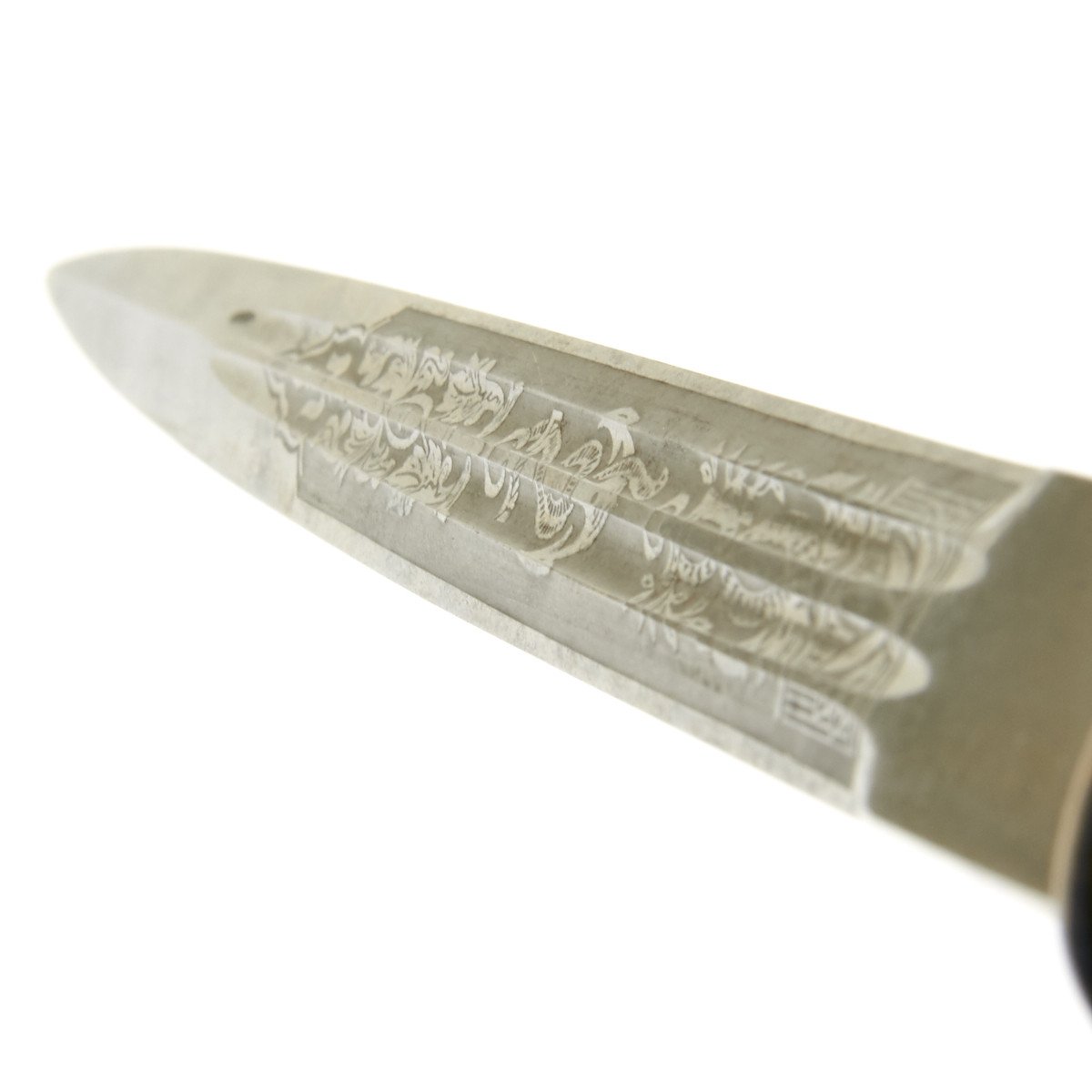 The blade is an very nice example, with a high quality nickel-plated finish and an excellent fouled anchor etch. The etch is beautiful, retaining 90% of the frosted backgrounds. The reverse ricasso is stamped with the 1935-41 Eickhorn Squirrel trademark, and the original felt blade buffer is in place. The tip of the blade is perfect.